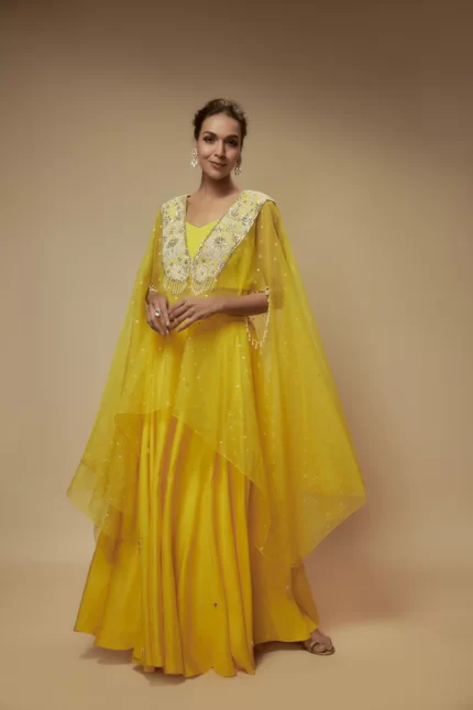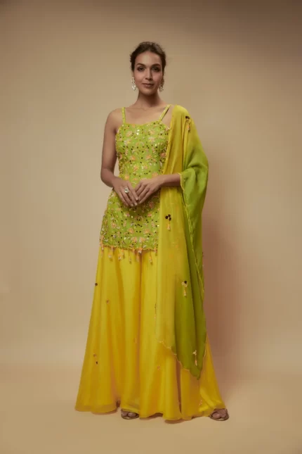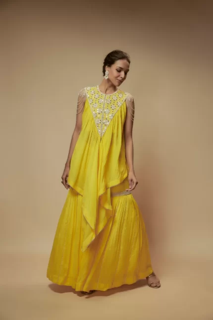 IVORY BEAD EMBROIDERED YELLOW KAFTAN & PALAZZO SET