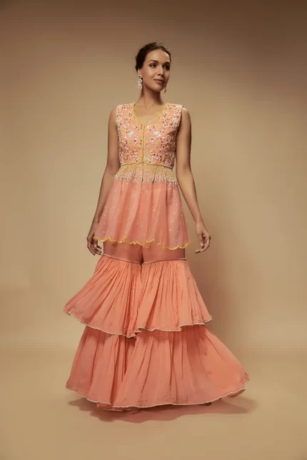 PINK FLOWER MOTIFS EMBROIDERED OMBRÉ TUNIC & PALAZZO SET