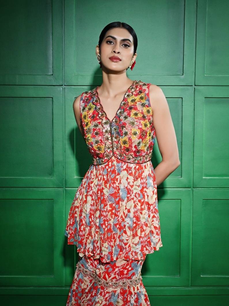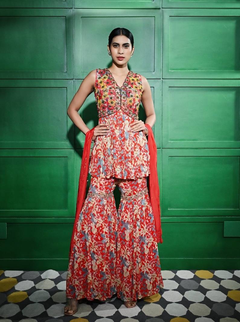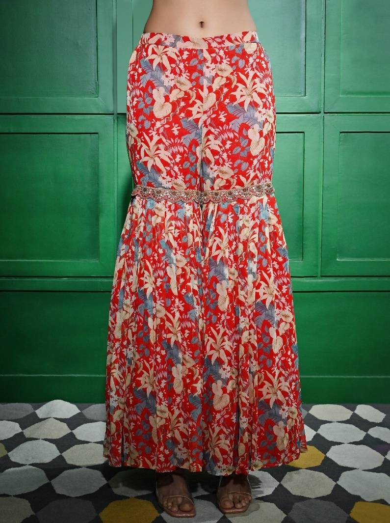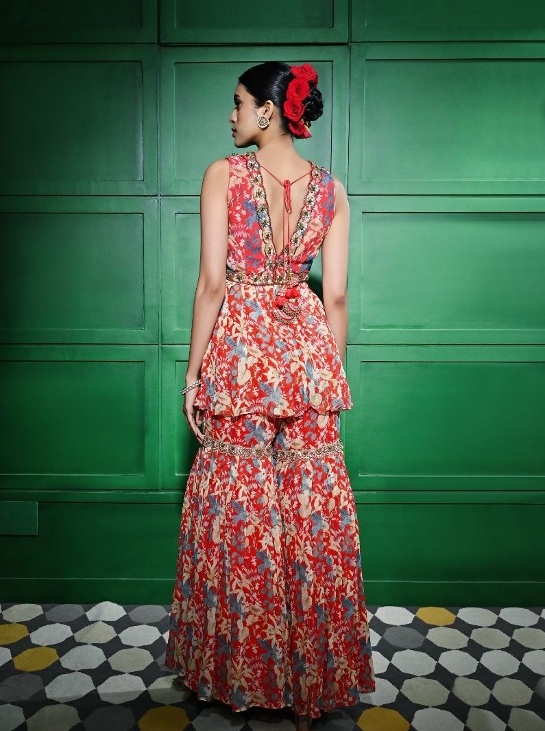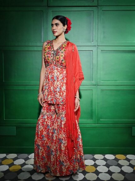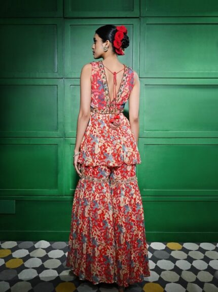 RED FLORAL PRINTED PEPLUM TOP EMBROIDERED WITH ORGANZA CUTWORK FLOWERS PAIRED WITH A CANCAN TIER PRINTED GEORGETTE GHARARA AND A GOLD MOTIF RED SILK ORGANZA DUPATTA