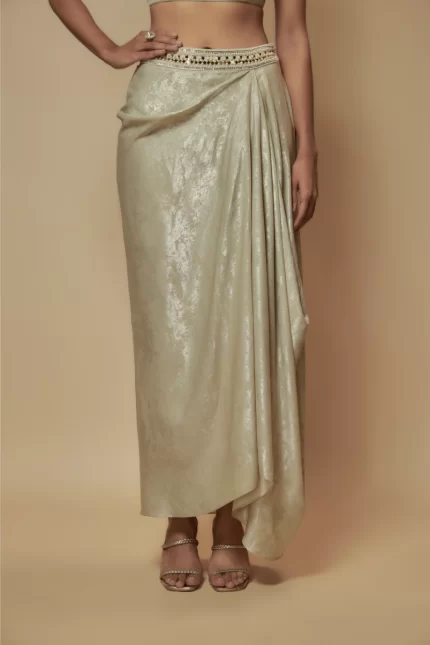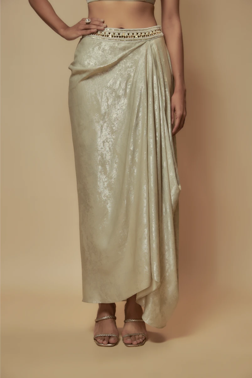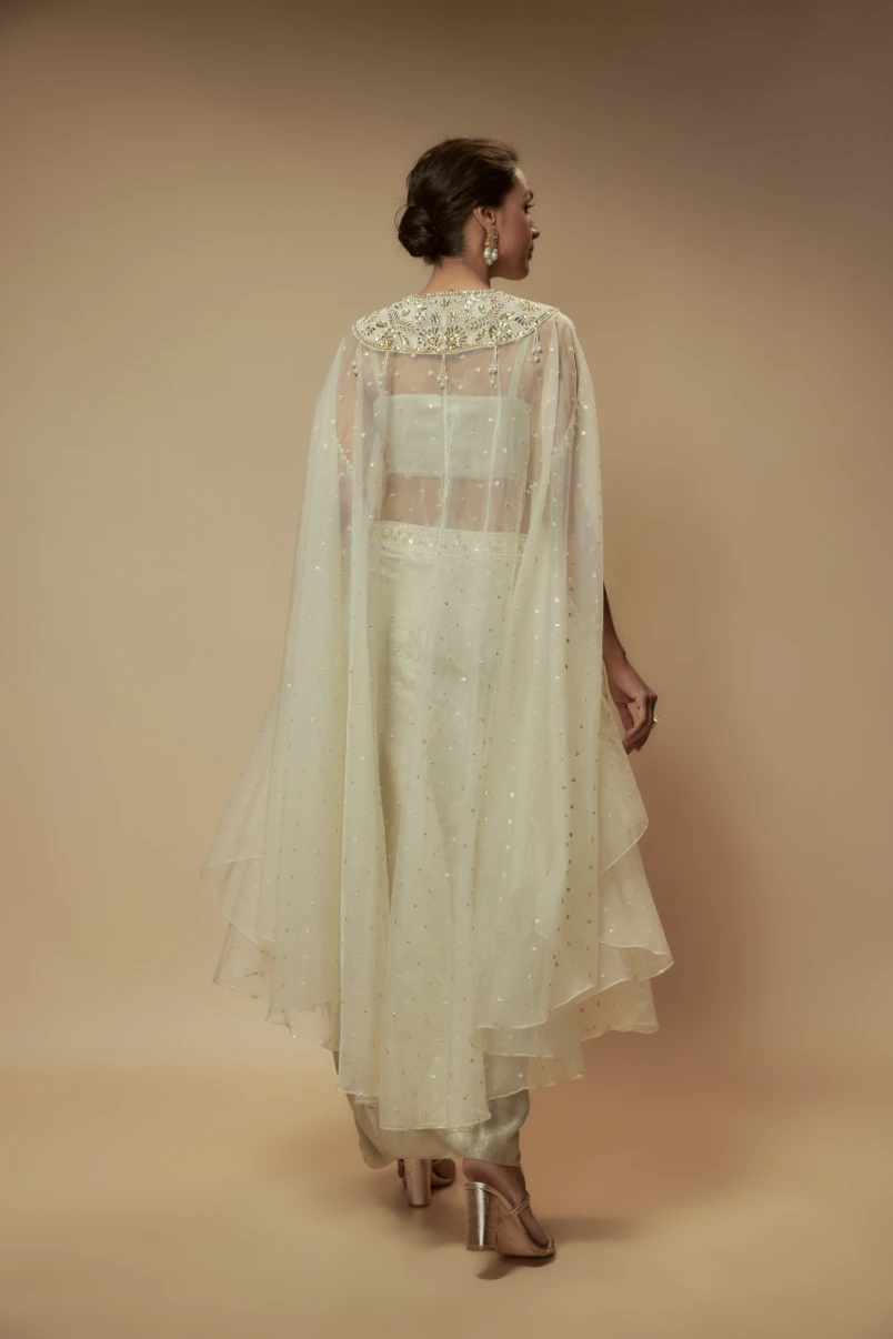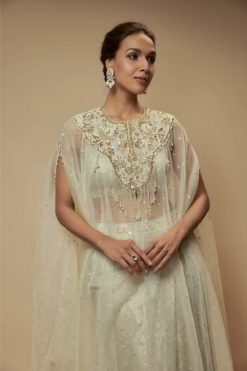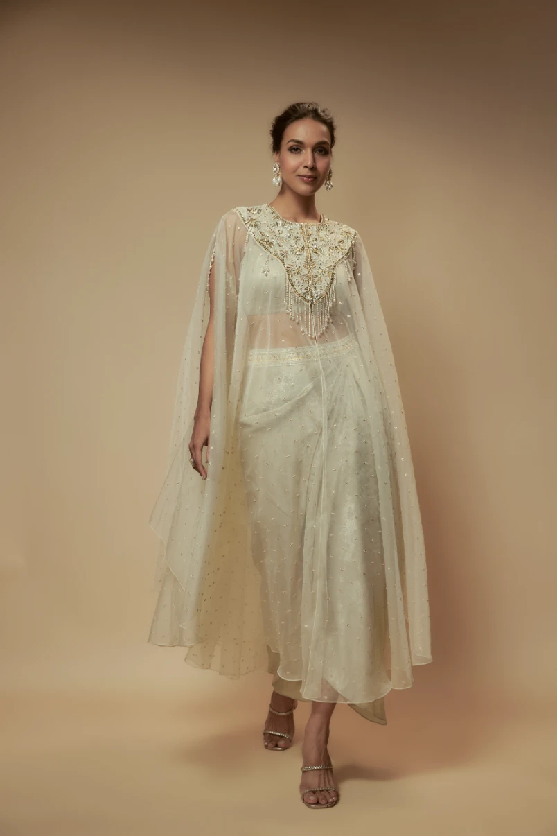IVORY BEAD & GOLD ZARI EMBROIDERED ORGANZA CAPE PAIRED WITH A FOIL SATIN CREPE BLOUSE AND A EMBROIDERED BELT DRAPE SKIRT