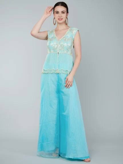 IVORY TINY FLOWER & BEAD EMBELLISHED PEPLUM TOP PAIRED WITH AN ZARI ORGANZA SHARARA AND A NET CHOKER DUPATTA