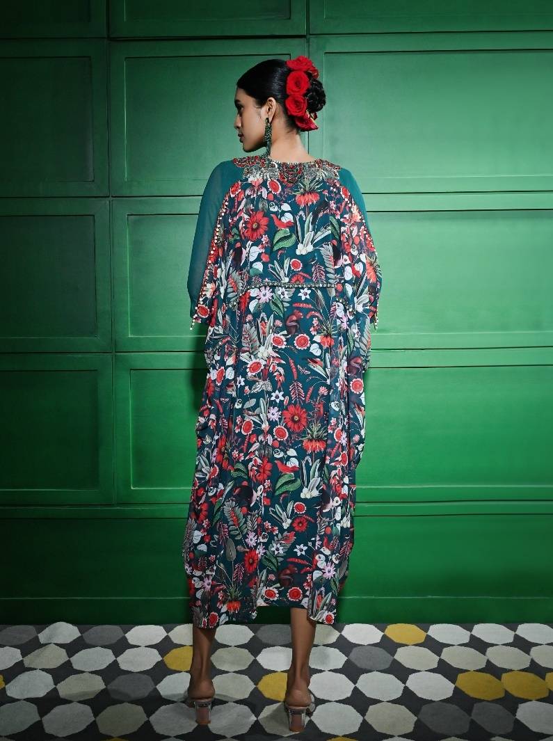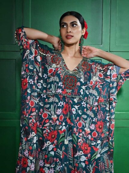 RED & GREEN GLASS BEAD EMBELLISHED SLEEVE PRINTED GEORGETTE KAFTAN PAIRED WITH A SEPARATE LYCRA SLIP