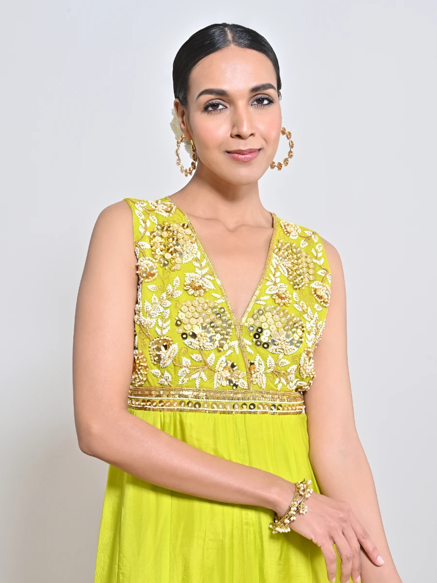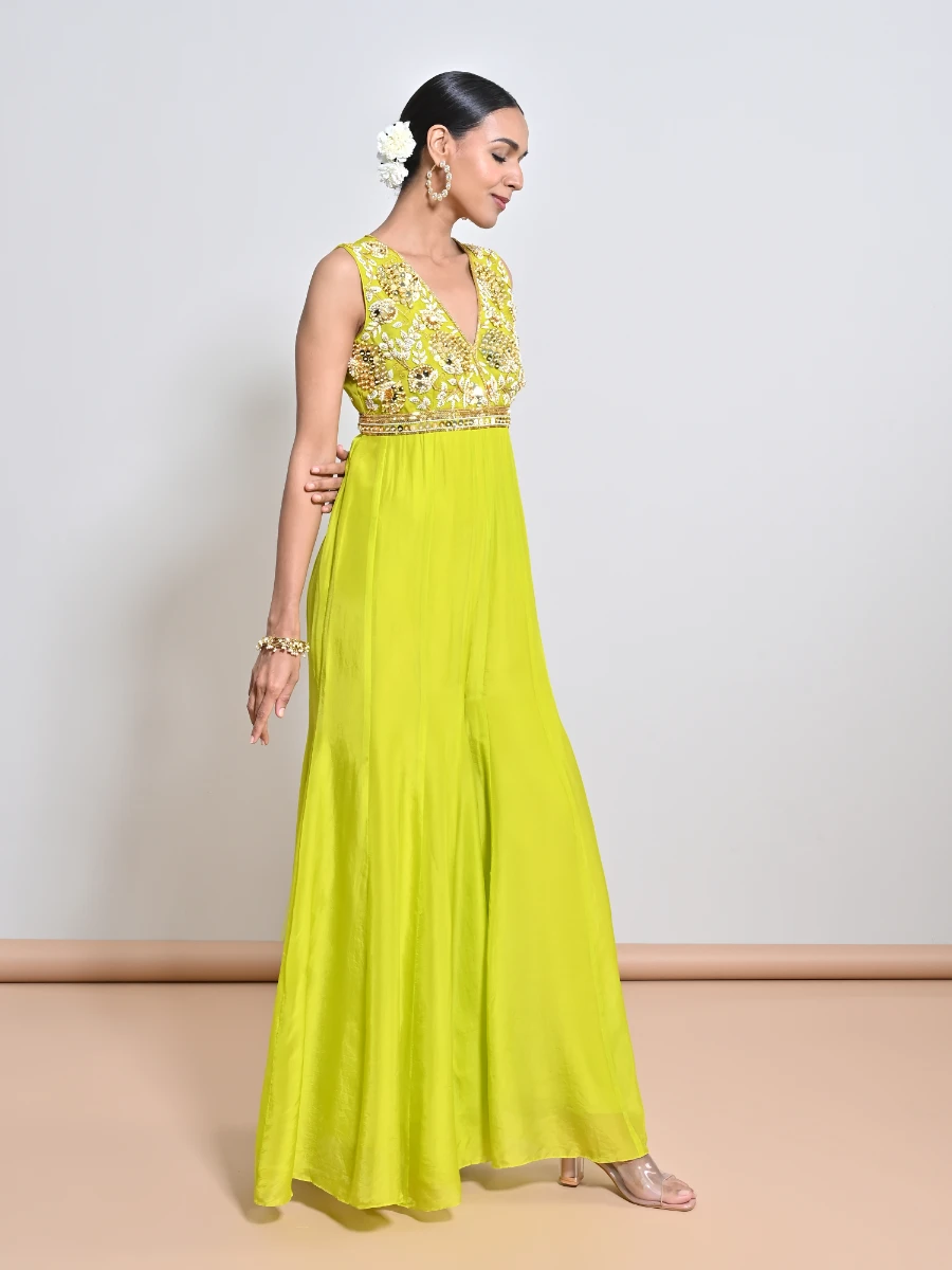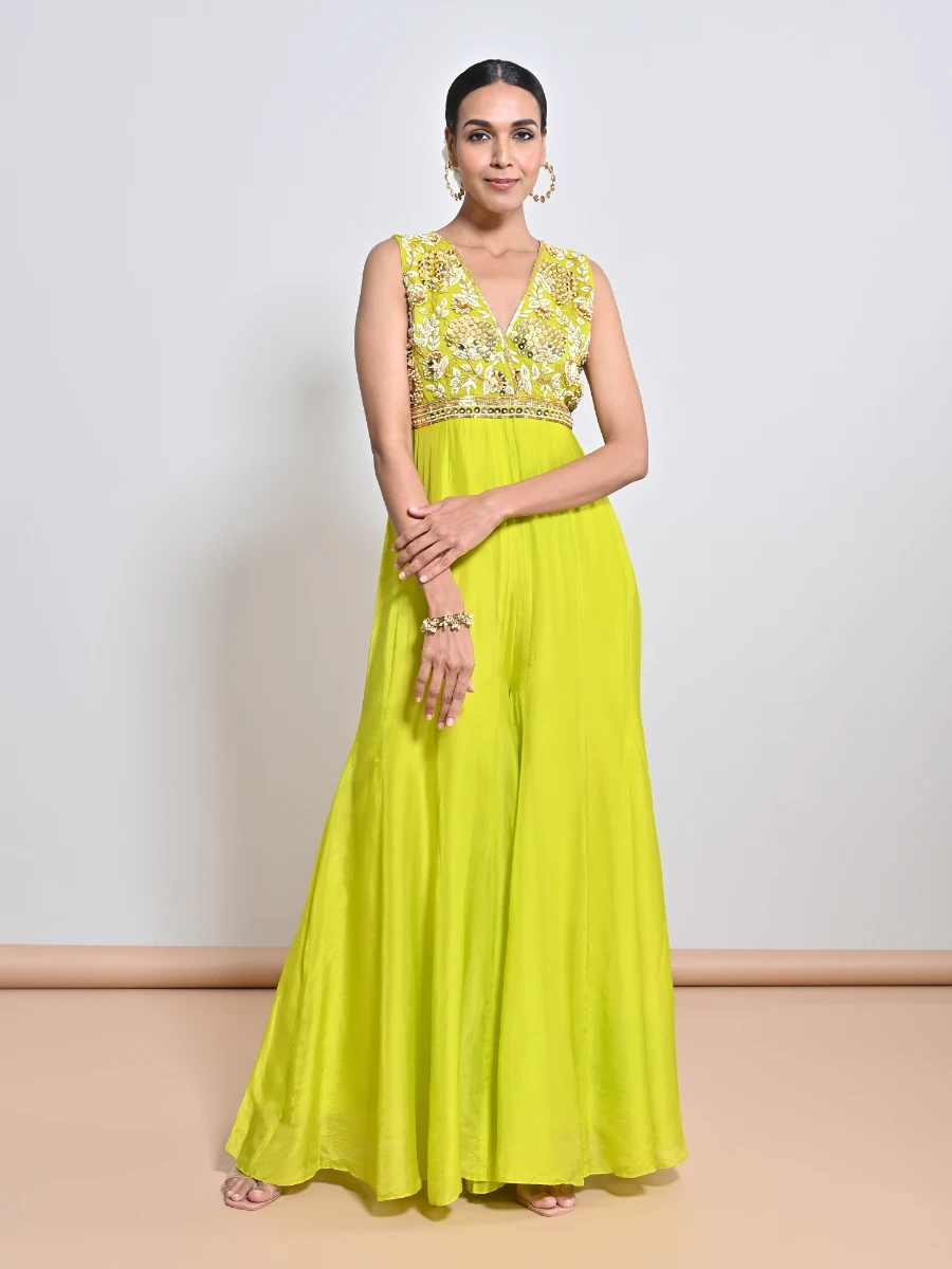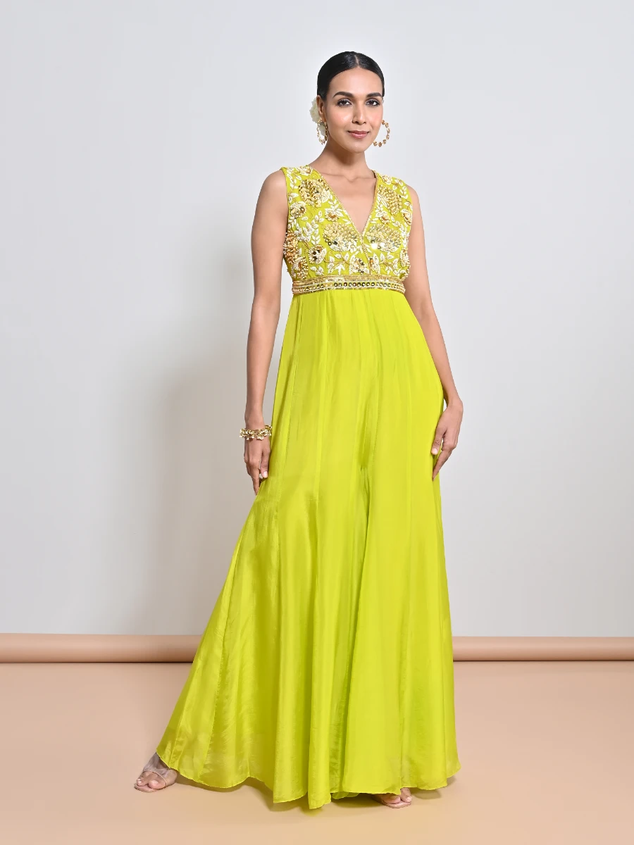 IVORY BEAD & MIRROR EMBELLISHED FLOWER MOTIFS FLARE SILK ORGANZA JUMPSUIT