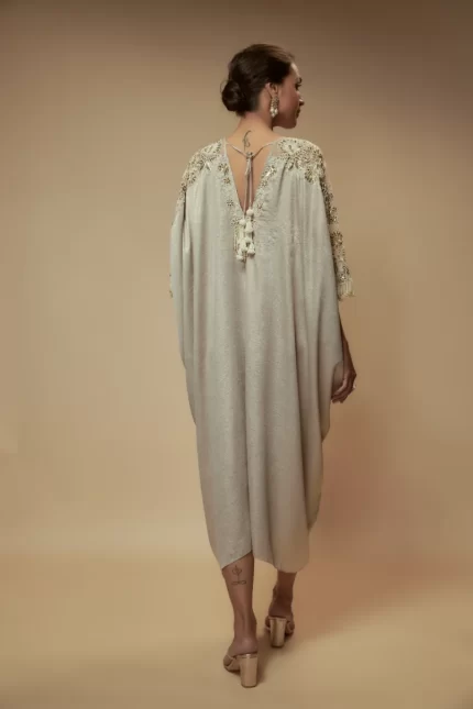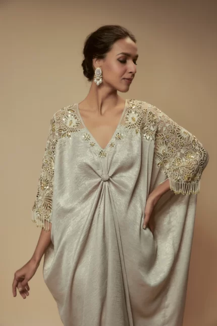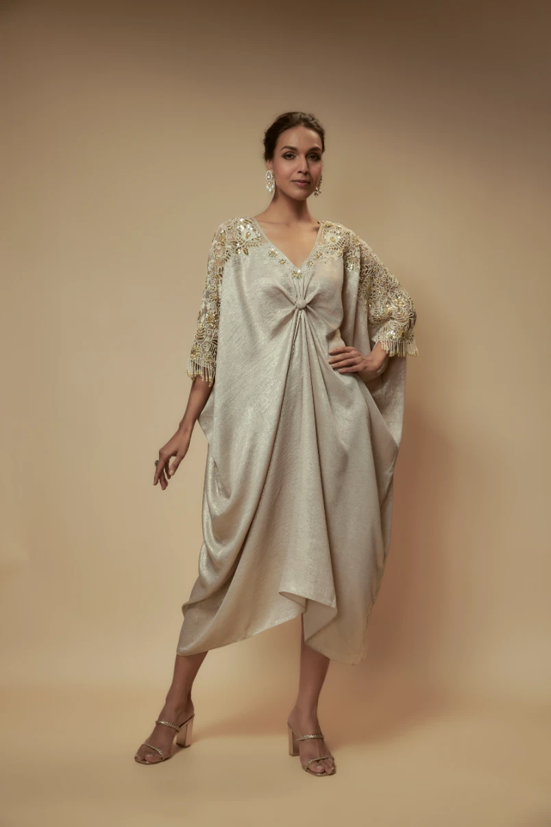 IVORY BEAD & GOLD ZARI EMBROIDERED FOIL SATIN CREPE KAFTAN