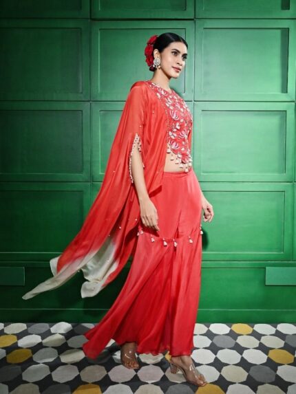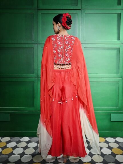 EMBROIDERED CROPTOP PAIRED WITH A CREPE SKIRT & AN EMBROIDERED ORGANZA DRAPE