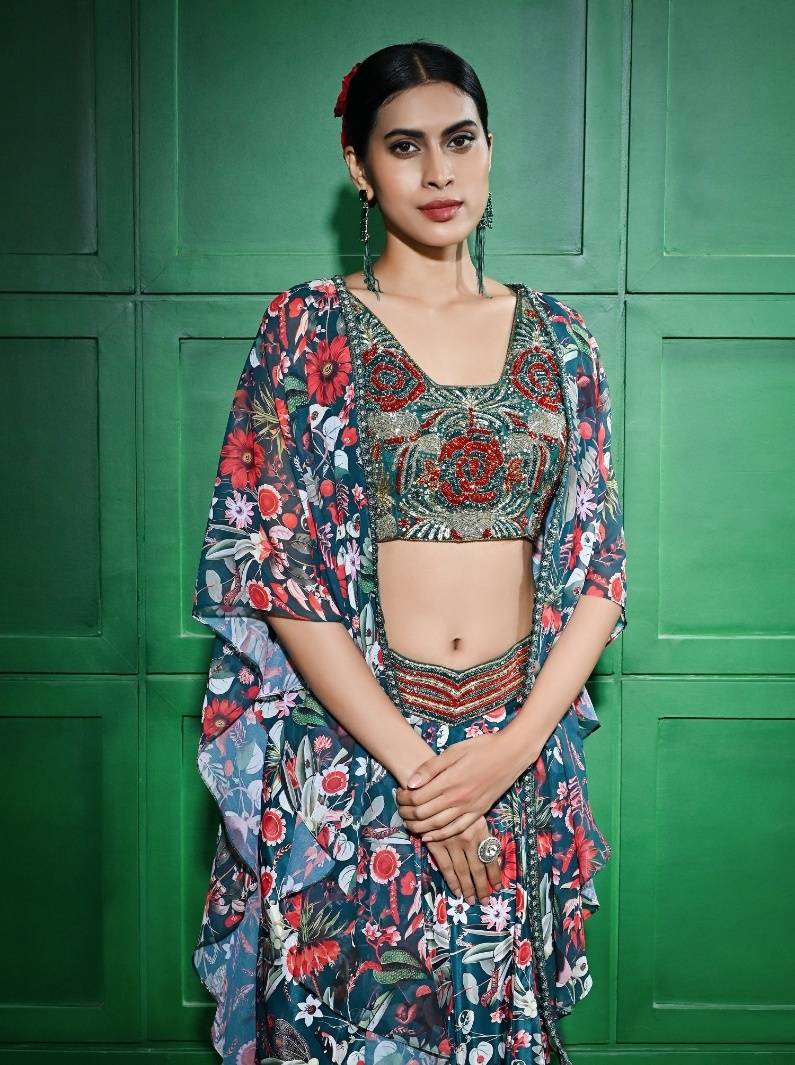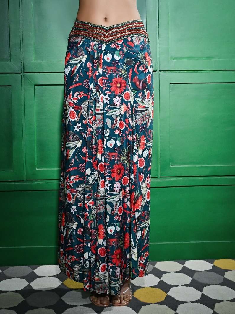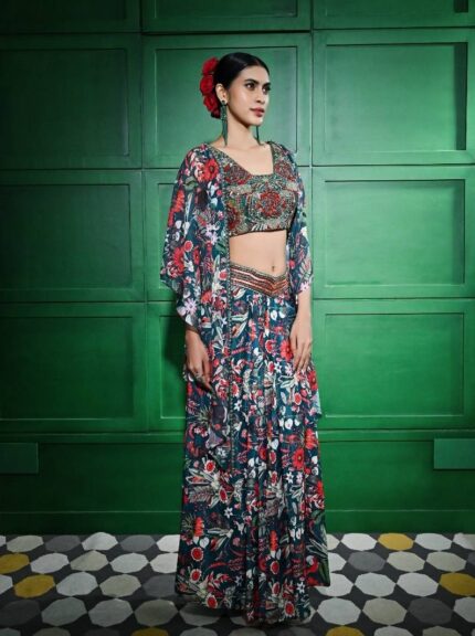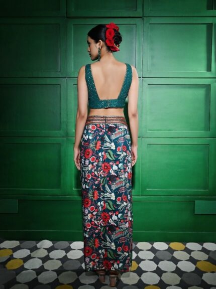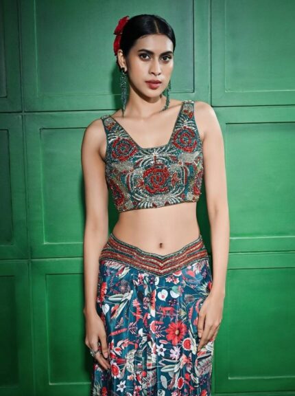 RED & GREEN GLASS BEAD EMBELLISHED HEAVY BLOUSE PAIRED WITH A BEAD EMBROIDERED BELT CREPE DRAPE SKIRT & LAYERED WITH A PRINTED GEORGETTE CAPE