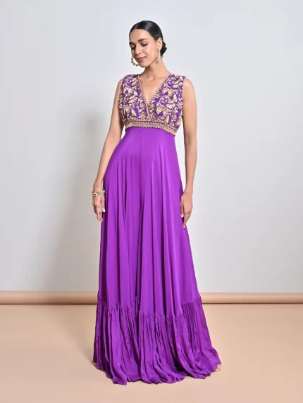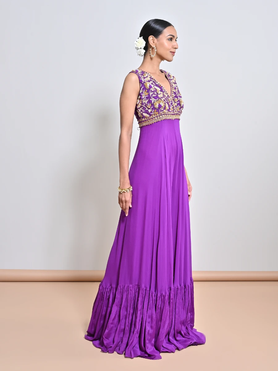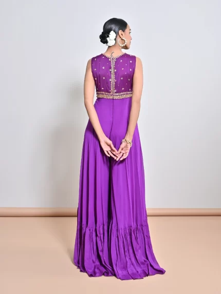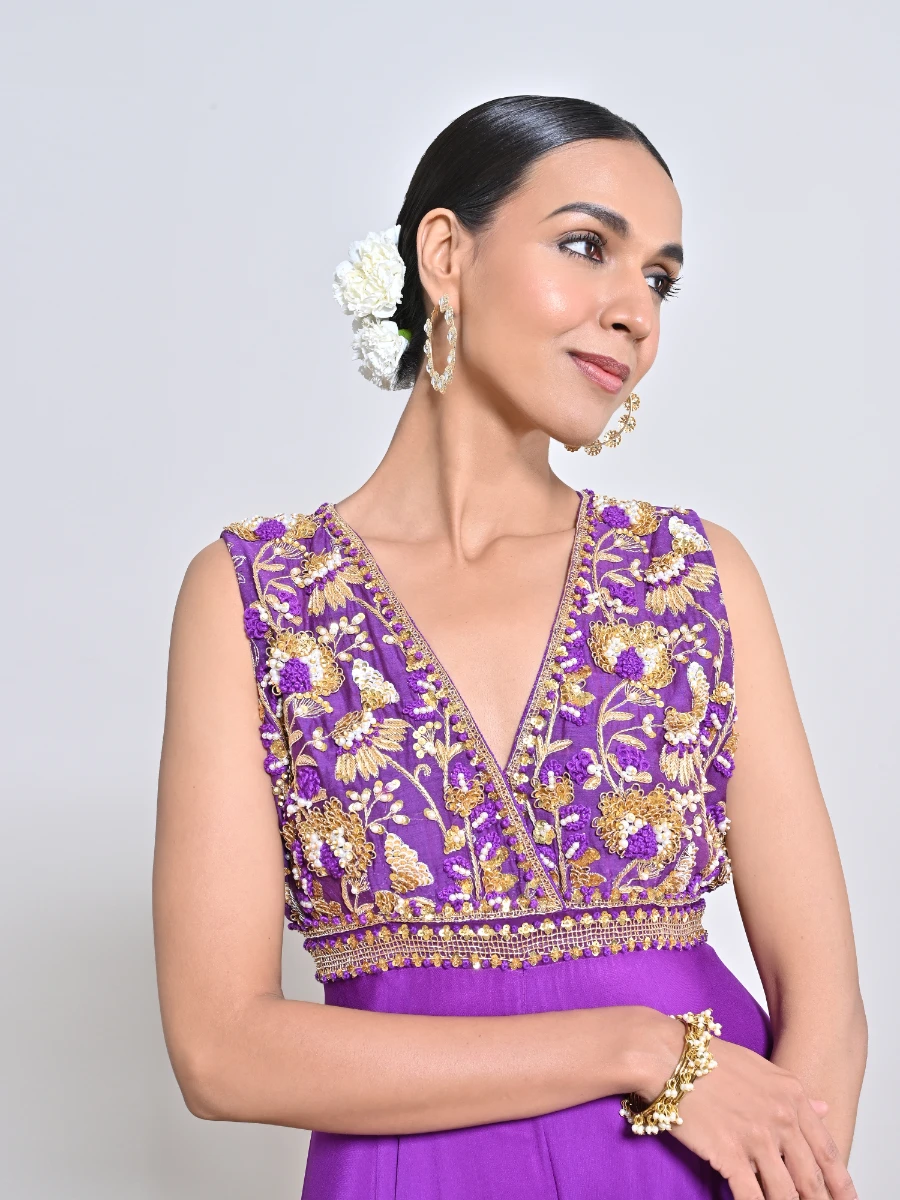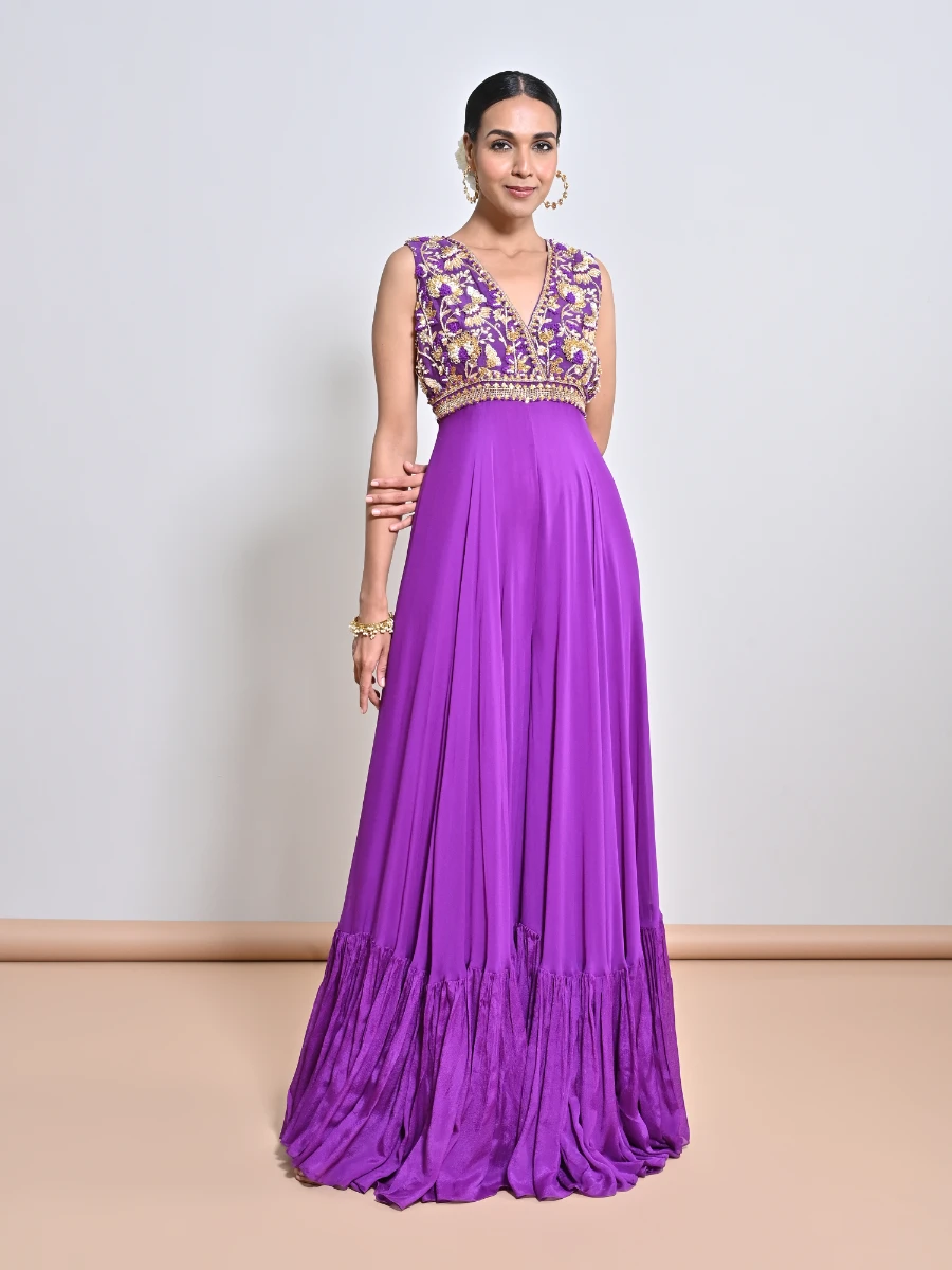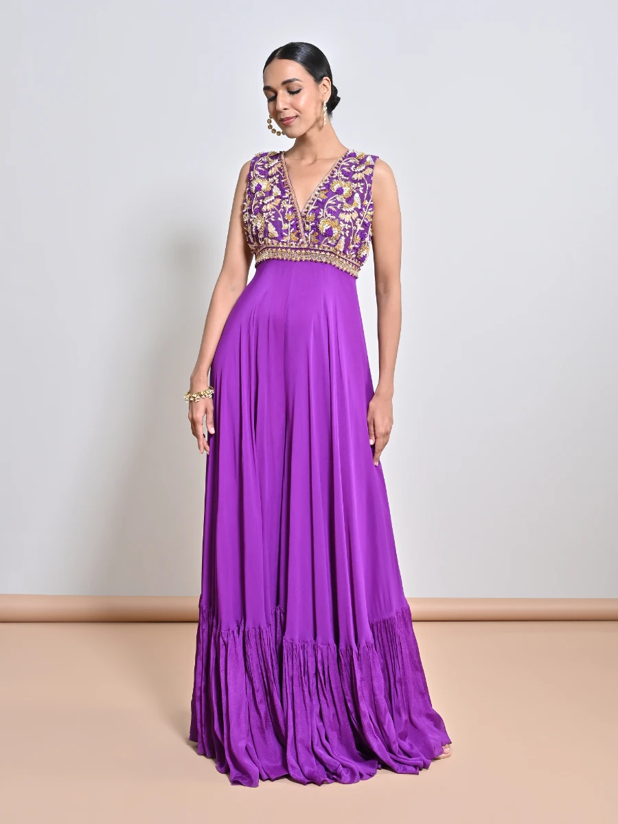 GOLD ZARDOZI EMBROIDERED FLARE CHIFFON CREPE JUMPSUIT