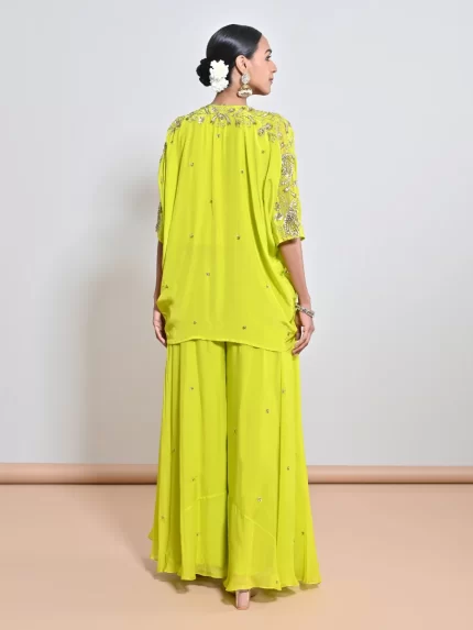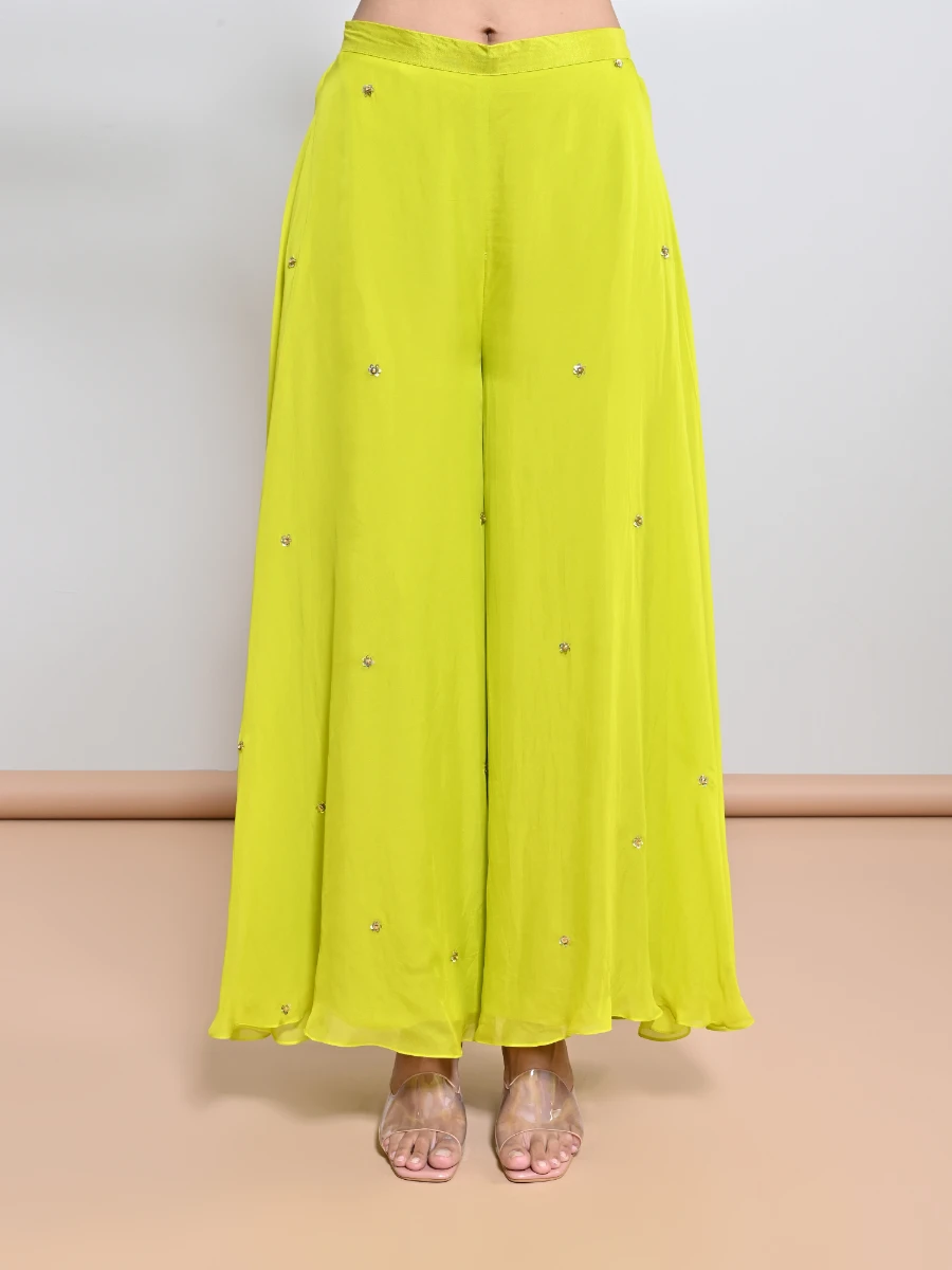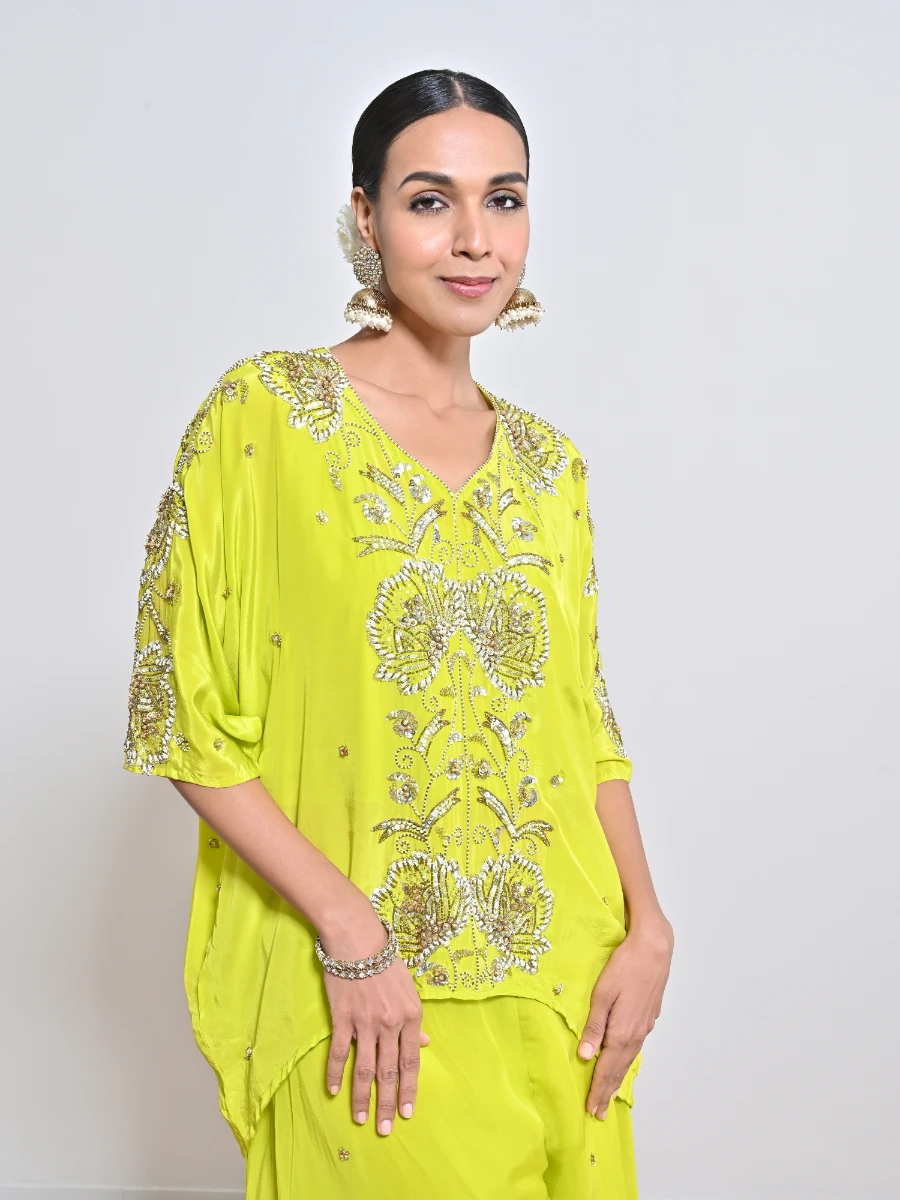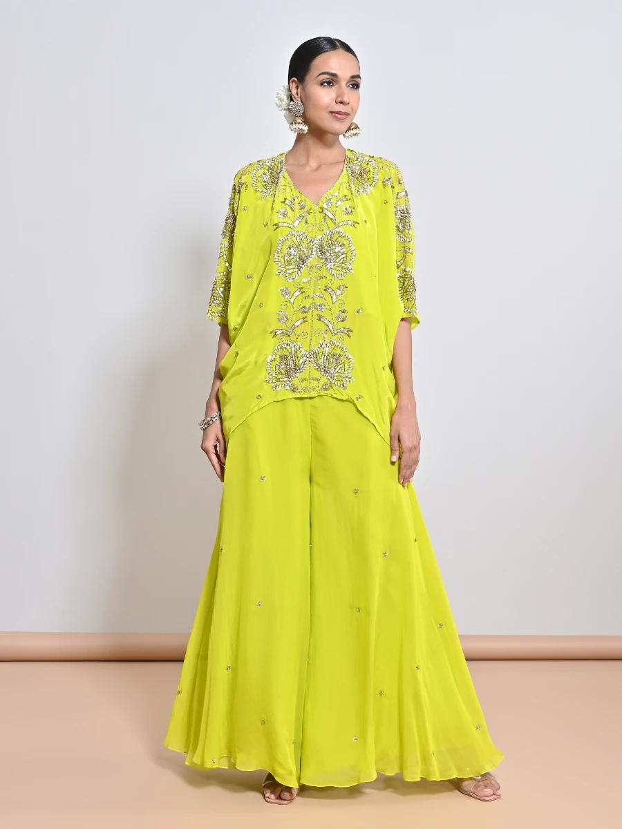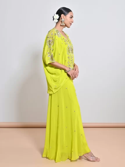 IVORY/ GOLD SEQUINS FLOWER EMBROIDERED CREPE KAFTAN PAIRED WITH A SEPERATE LYCRA SLIP & A FLARE SEQUINS MOTIF SILK ORGAZA PALAZZO