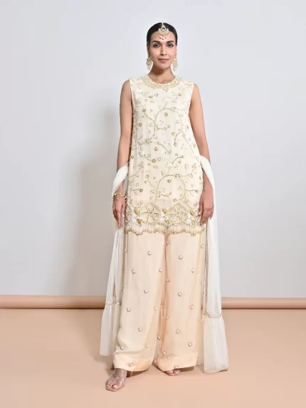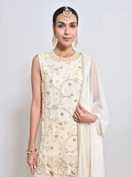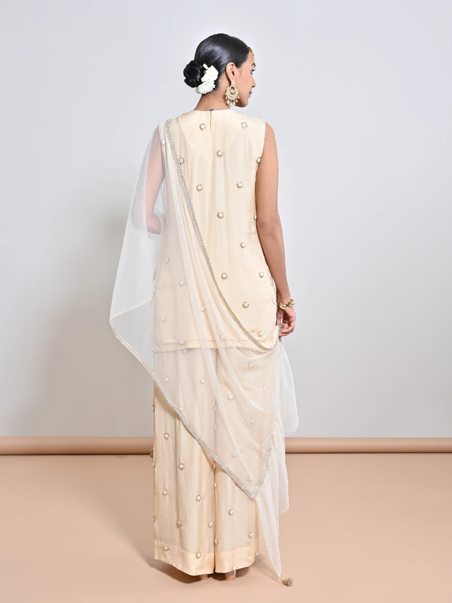 IVORY PEARL & GOLD SEQUINS CUTWORK FLOWER ORGANZA MOTIIF TUNIC PAIRED WITH A HAND EMBROIDERED ALL OVER MOTIF PALAZZO AND A NET DUPATTA