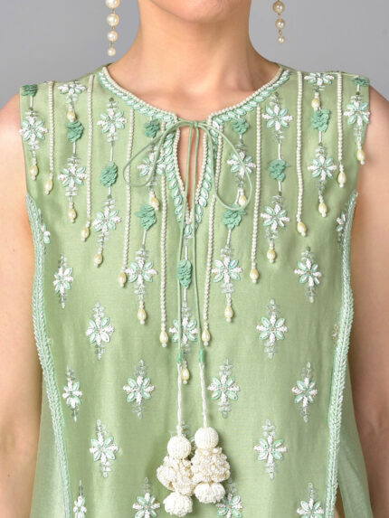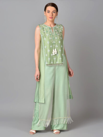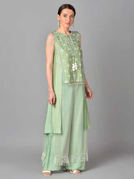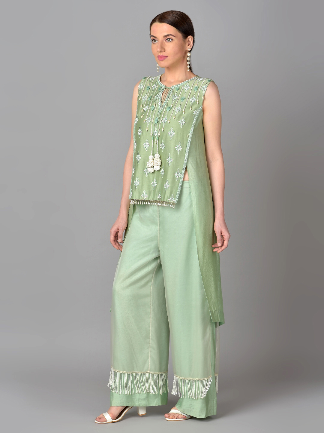 IVORY EMBROIDERED MINT GREEN CHANDERI SILK TUNIC WITH AN ORGANZA LAYER TASSEL PALAZZO