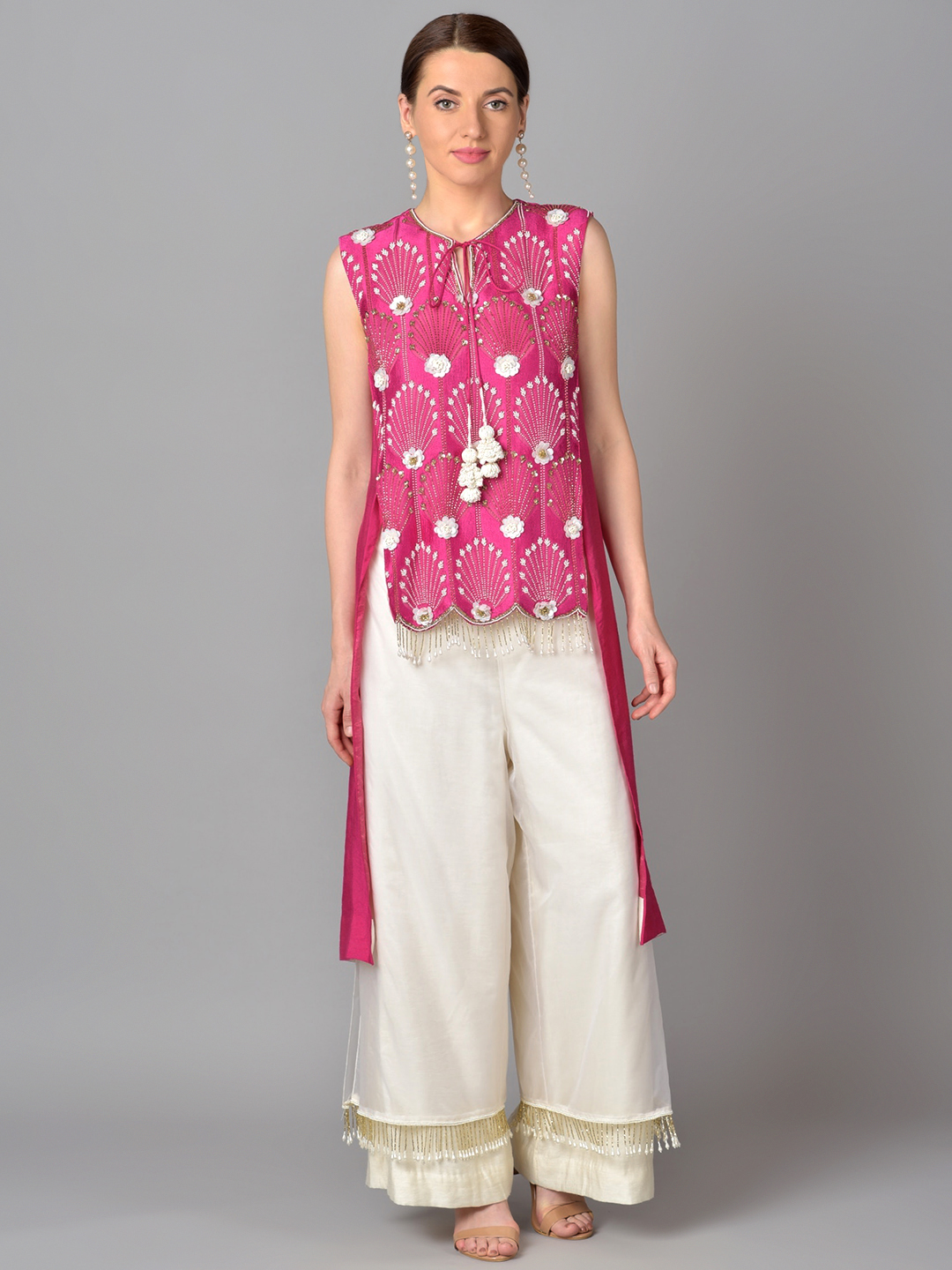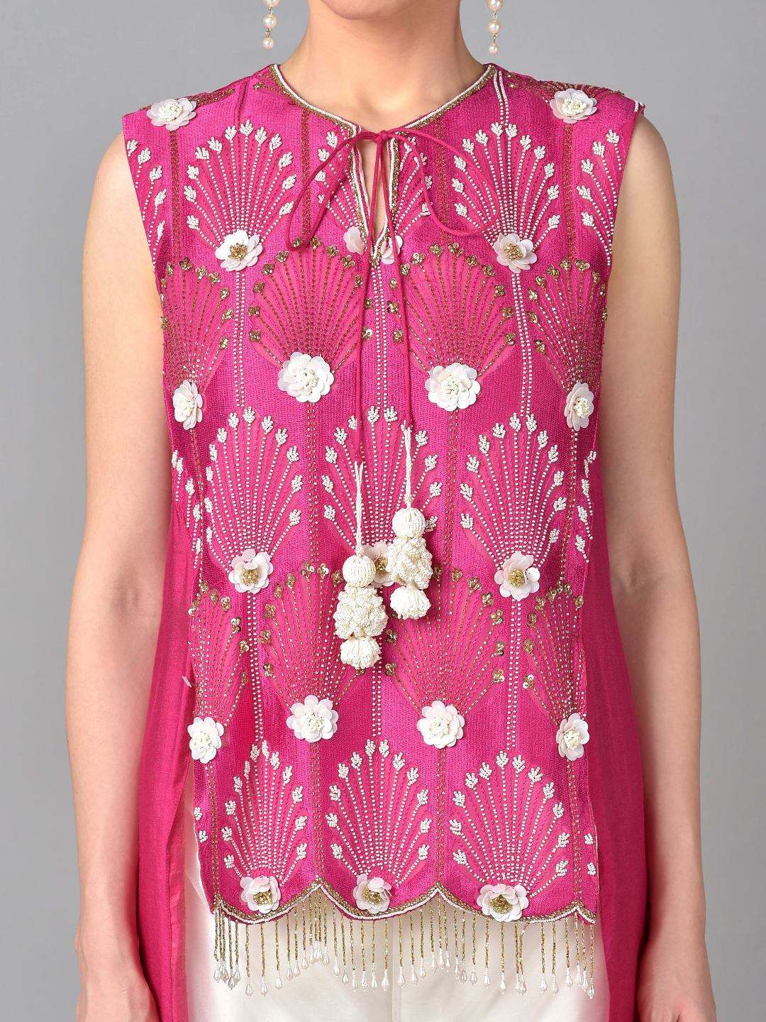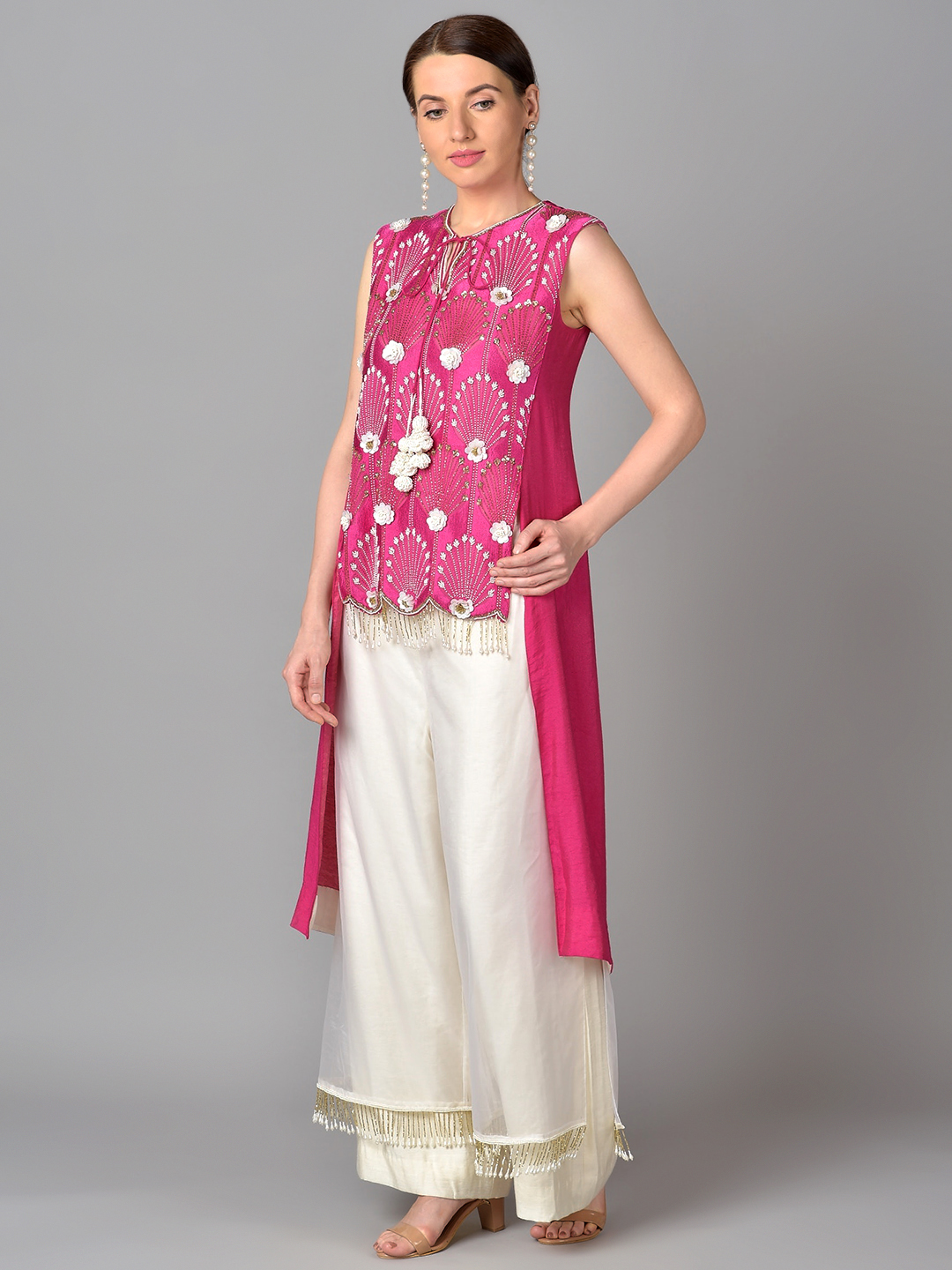 PINK EMBROIDERED TUNIC WITH A ORGANZA LAYER COTTON SILK TASSEL PALAZZO