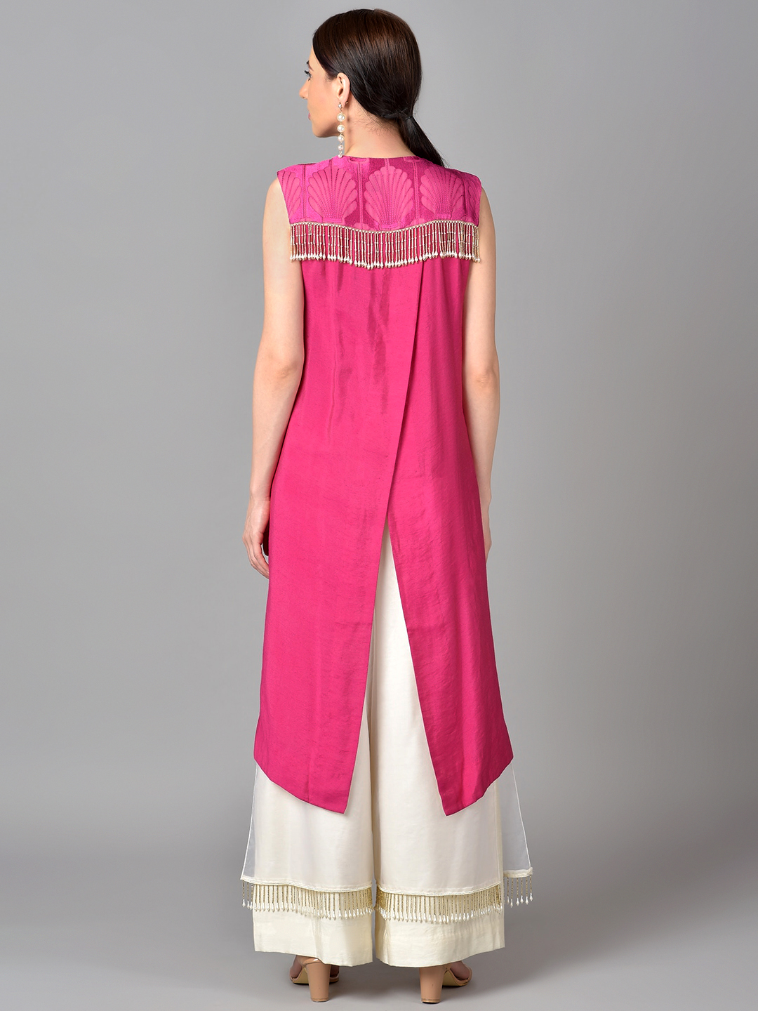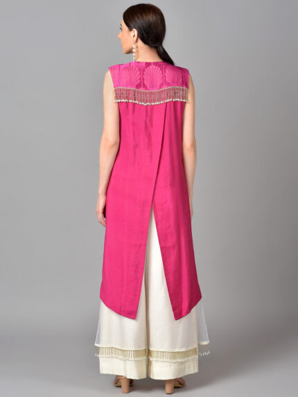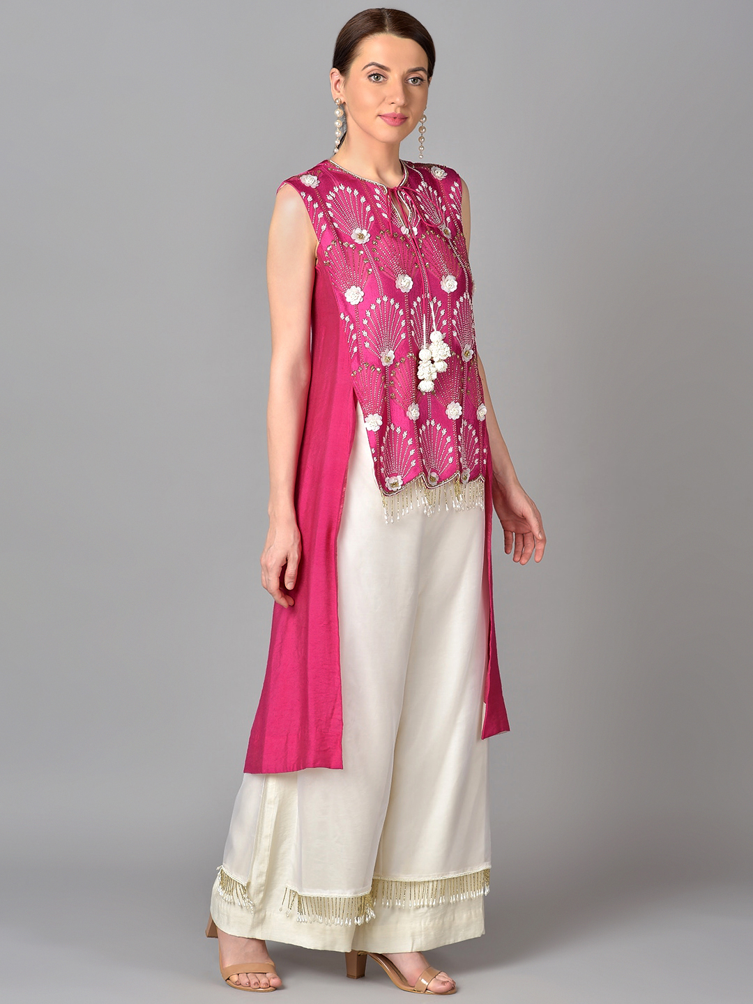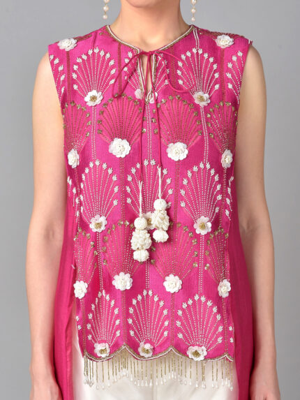PINK EMBROIDERED TUNIC WITH A ORGANZA LAYER COTTON SILK TASSEL PALAZZO