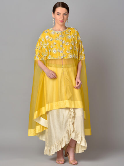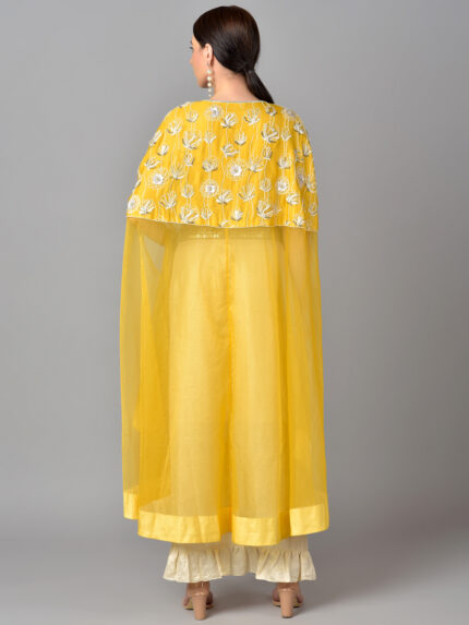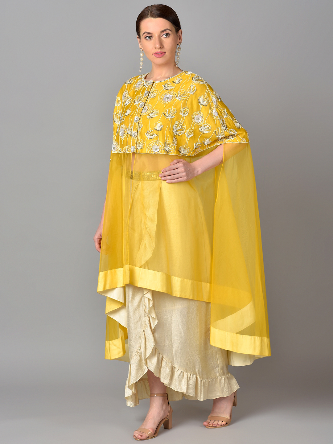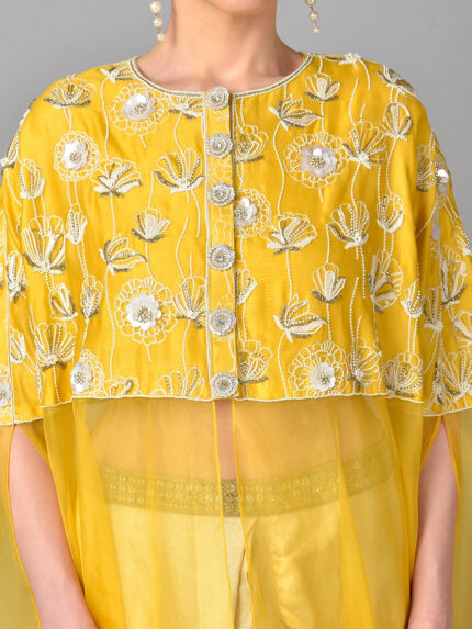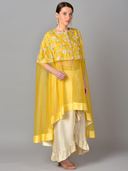IVORY BEAD EMBROIDERED YELLOW CAPE & PALAZZO SET