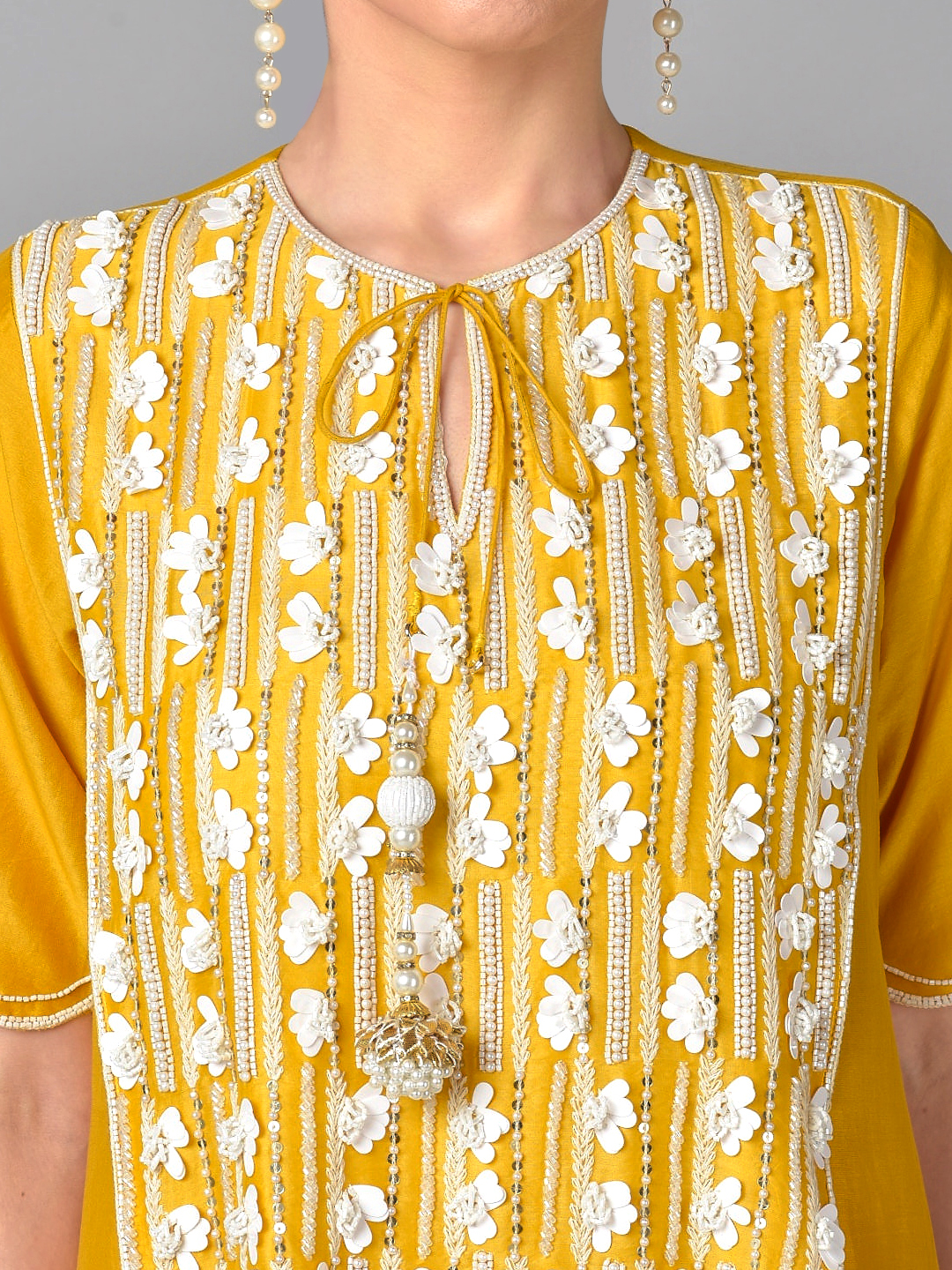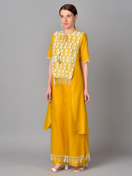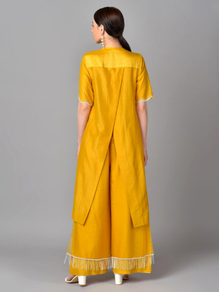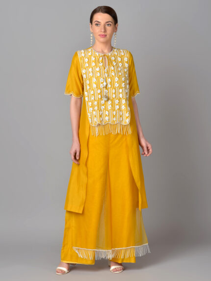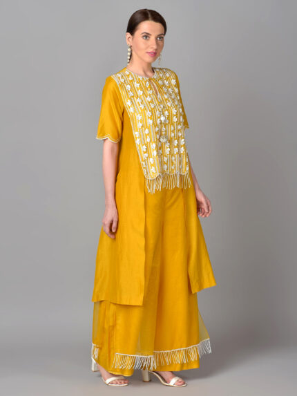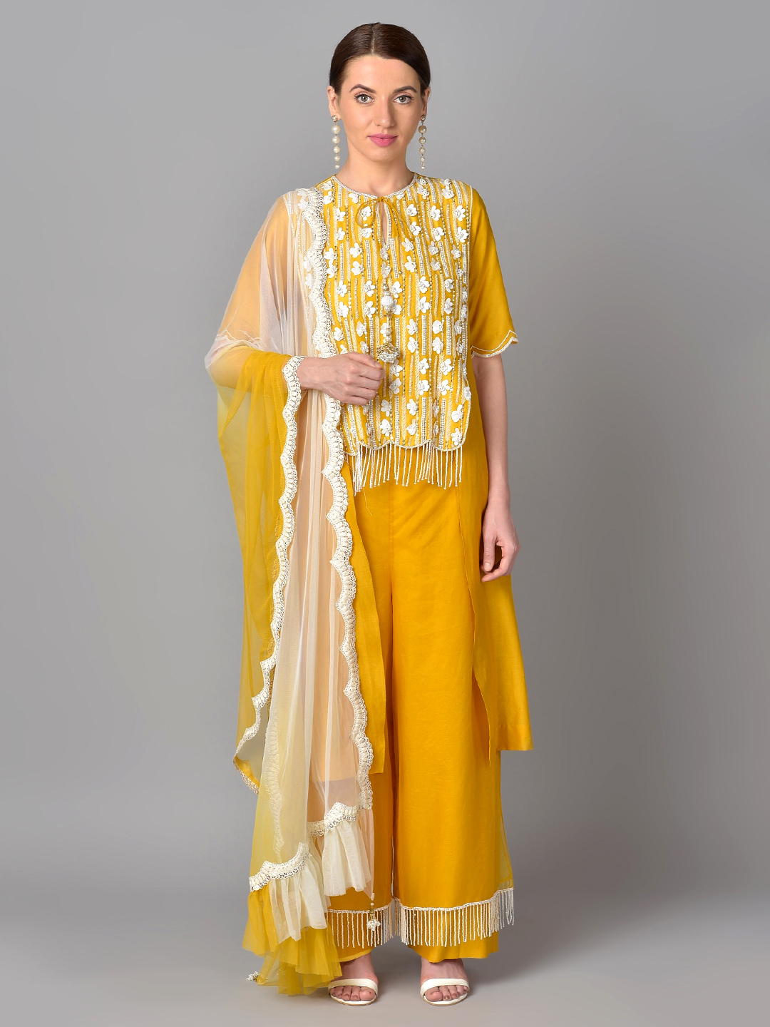 IVORY BEAD EMBROIDERED MUSTARD COTTON SILK TUNIC WITH A ORGANZA LAYERED COTTON SILK TASSEL PALAZZO AND A SHADED NET DUPATTA