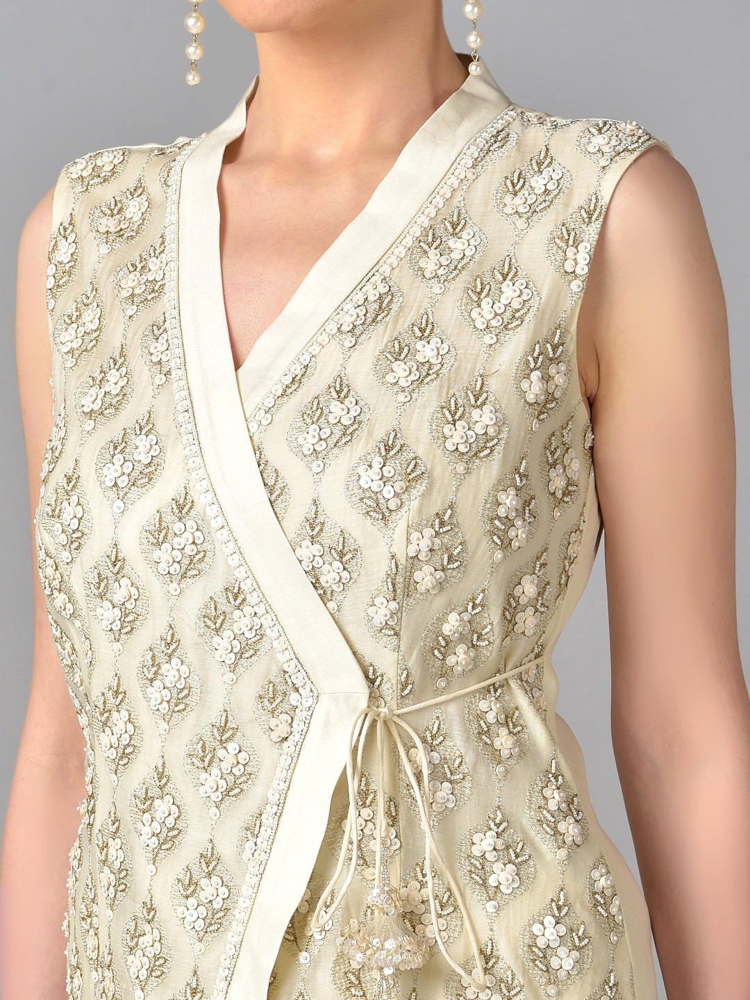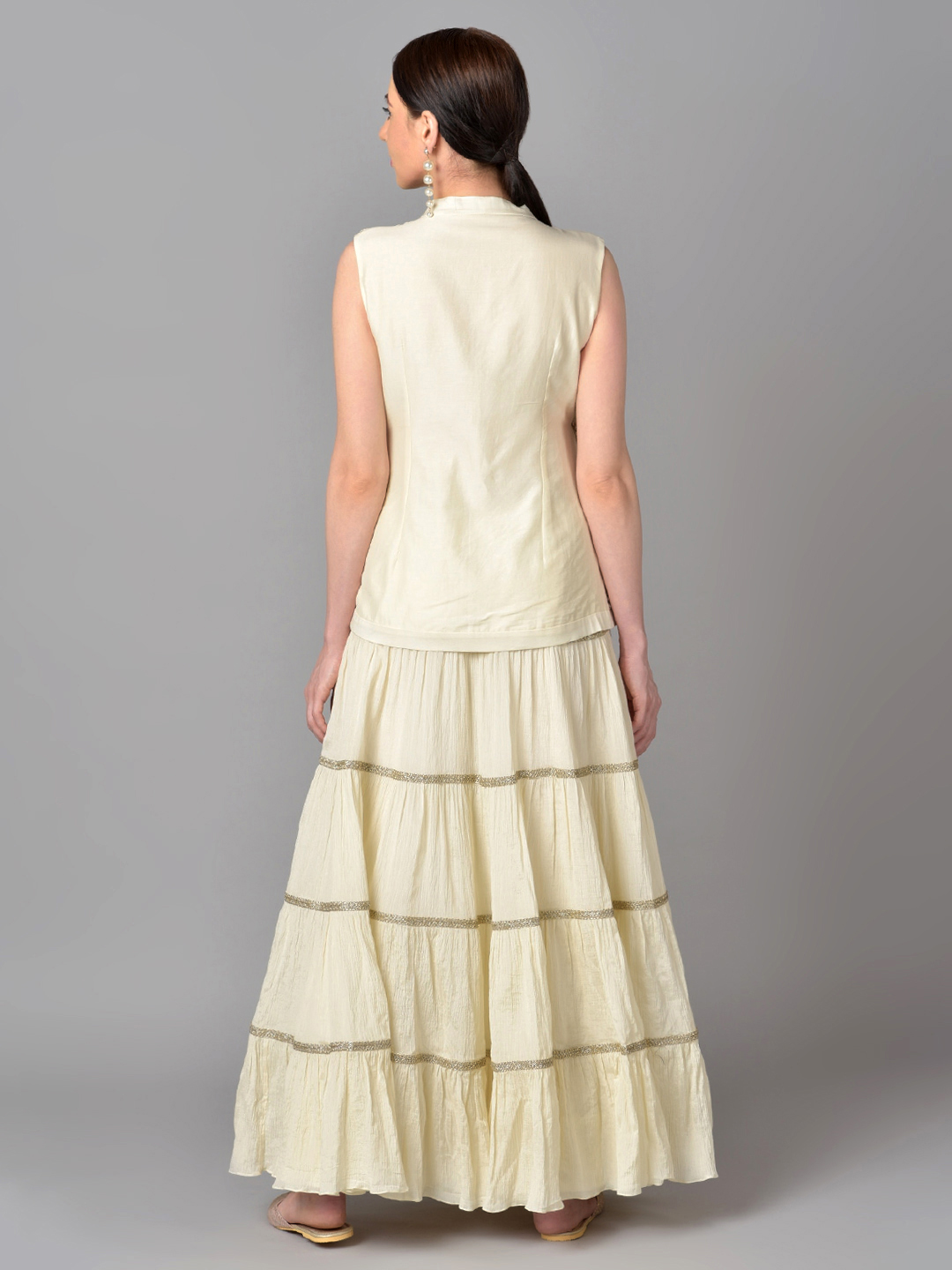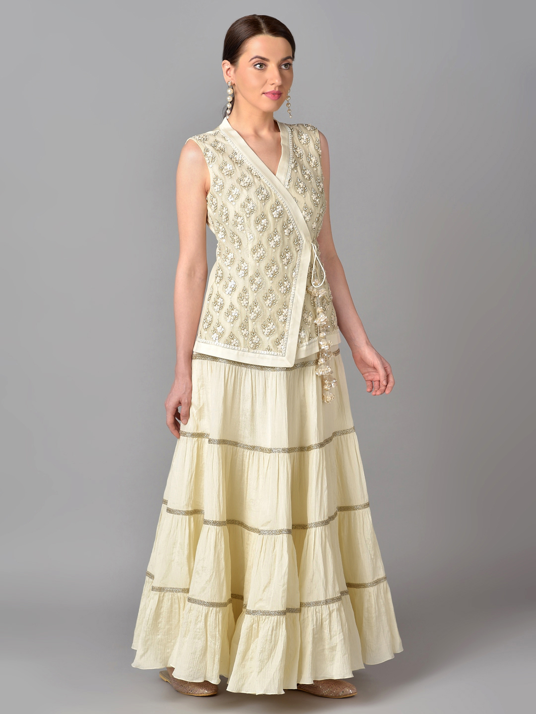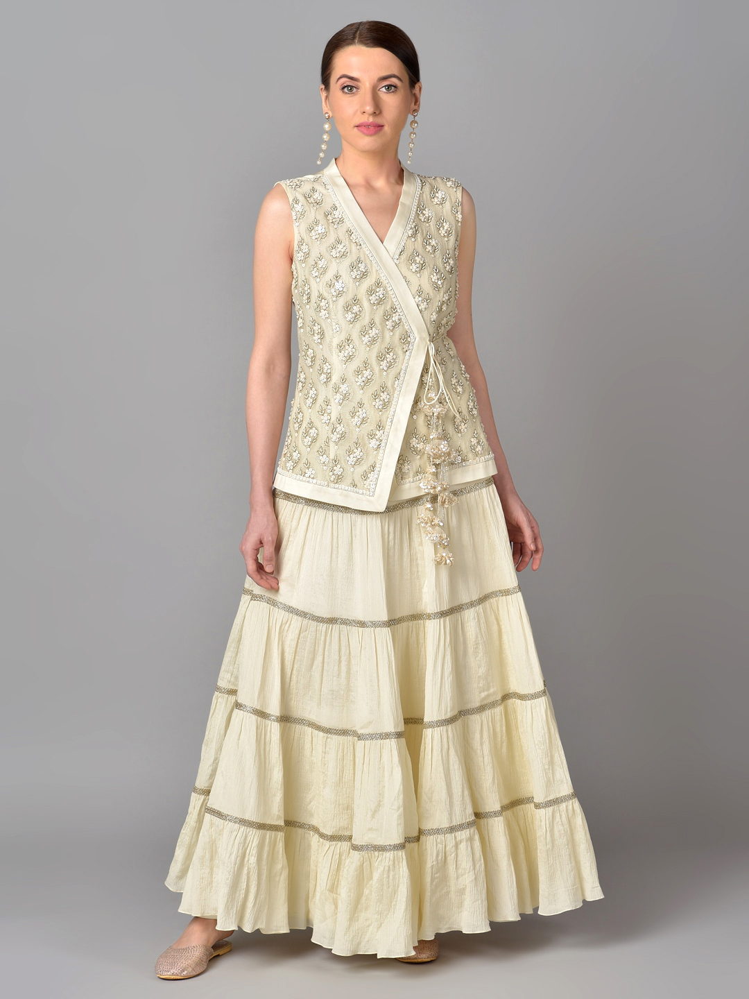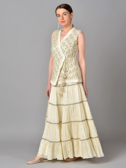 IVORY BEAD GOLD ZARI EMBROIDERED CHANDERI SILK OVERLAP TUNIC WITH A COTTON CHIFFON TIER SKIRT