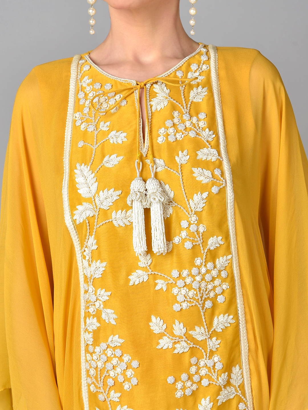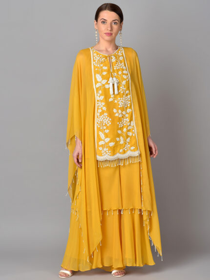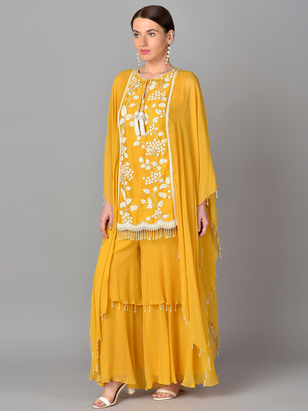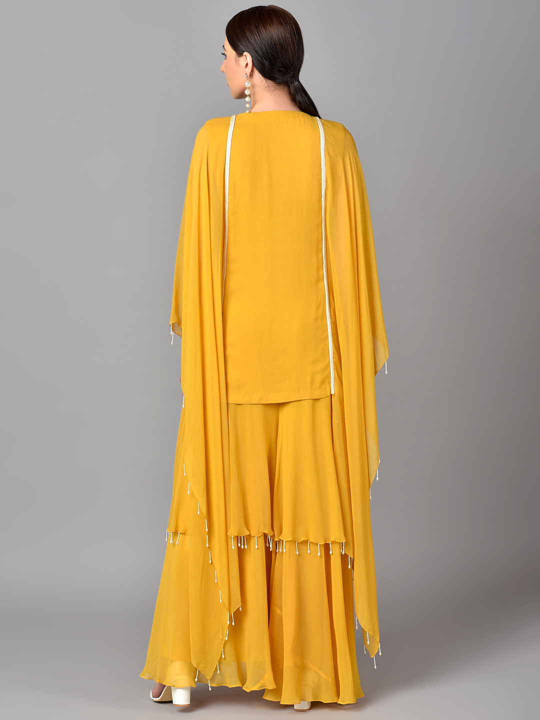 IVORY BEAD EMBROIDERED MUSTARD COLOUR GEORGETTE TUNIC WITH A DOUBLE LAYER GEORGETTE TASSEL PALAZZO