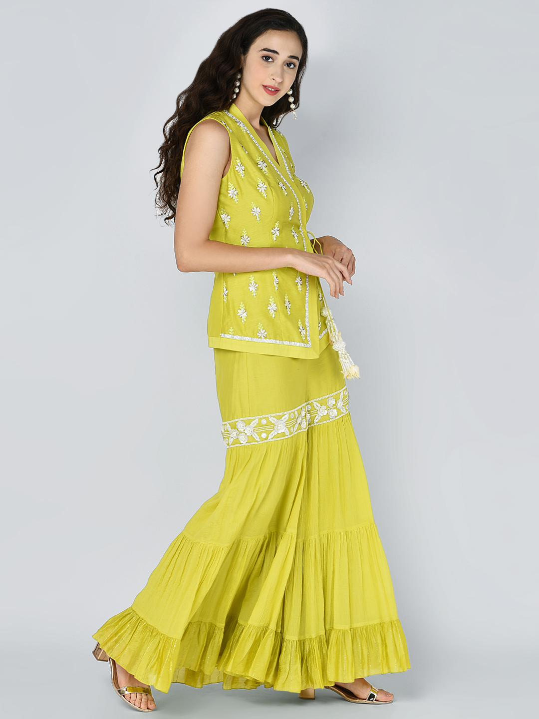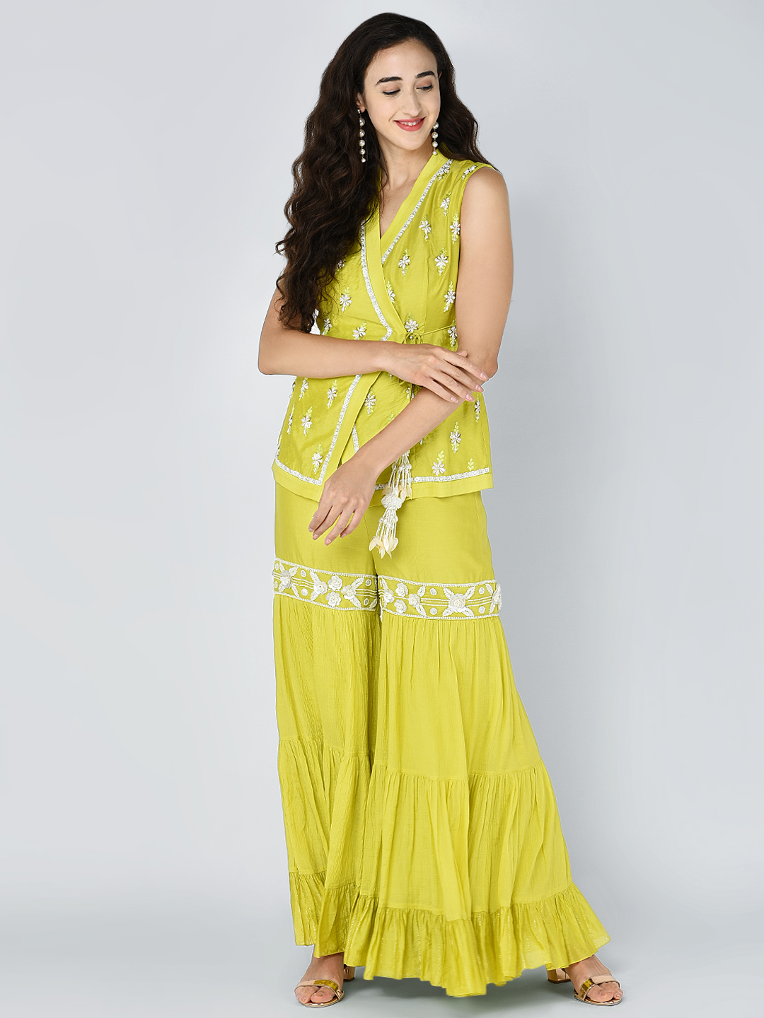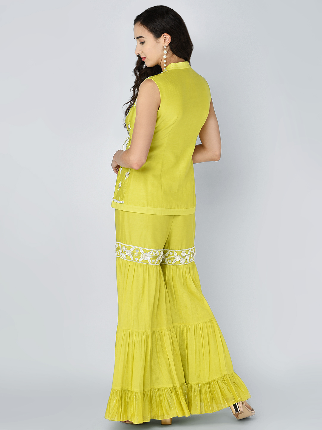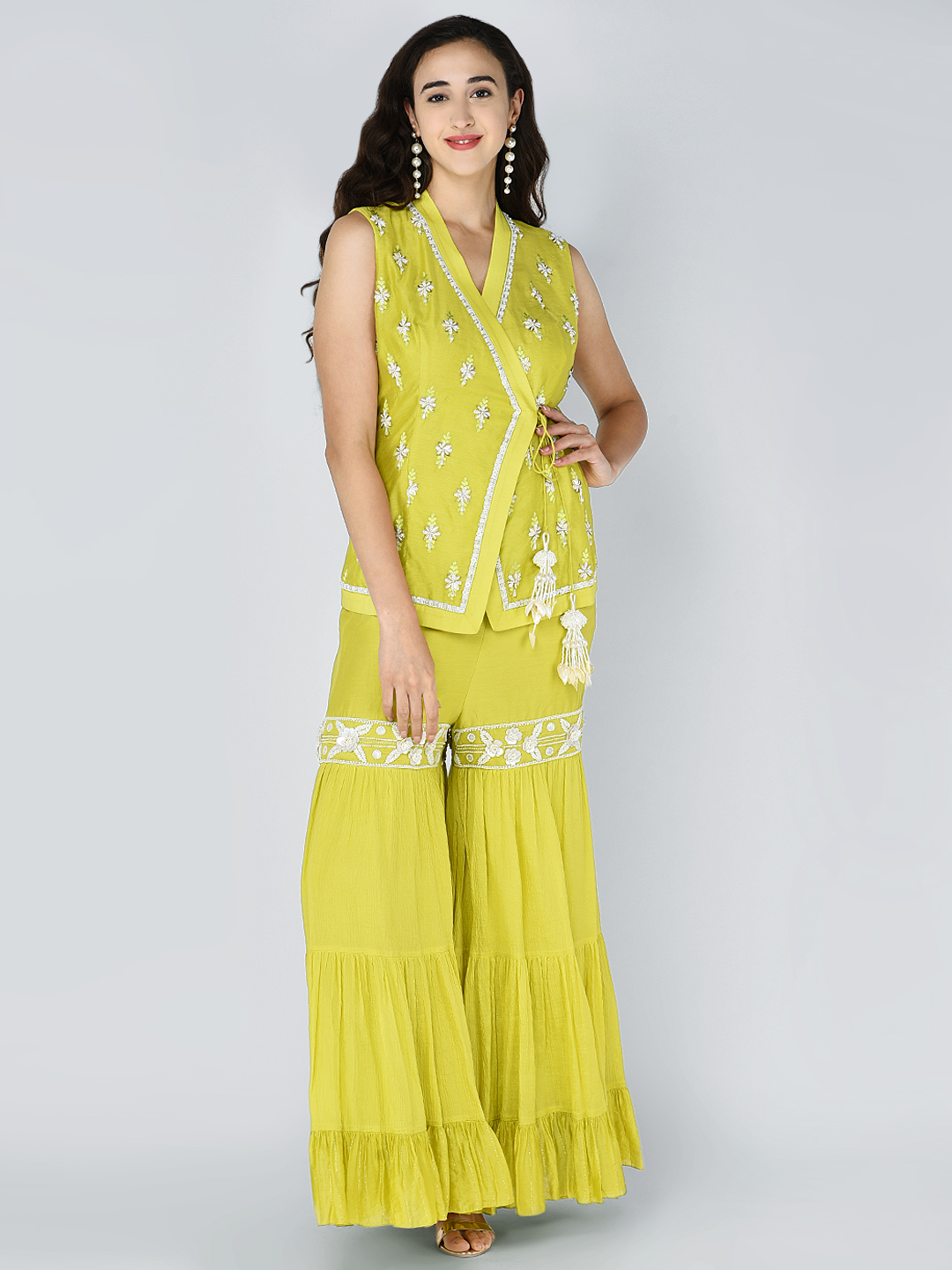 EMBROIDERED BEAD SEQUINS MOTIF OVERLAP TUNIC WITH AN EMBROIDERED BAND TIER PALAZZO