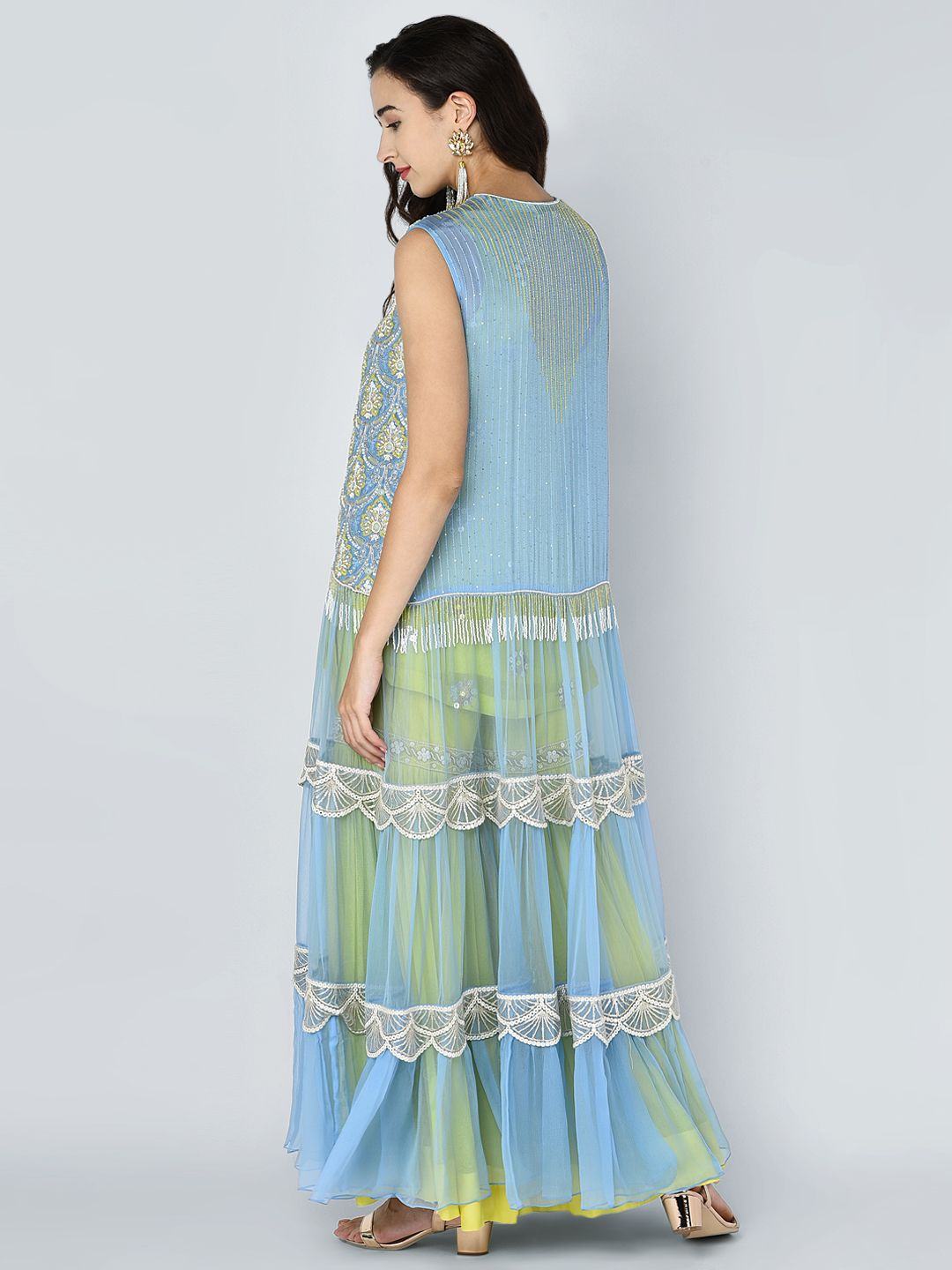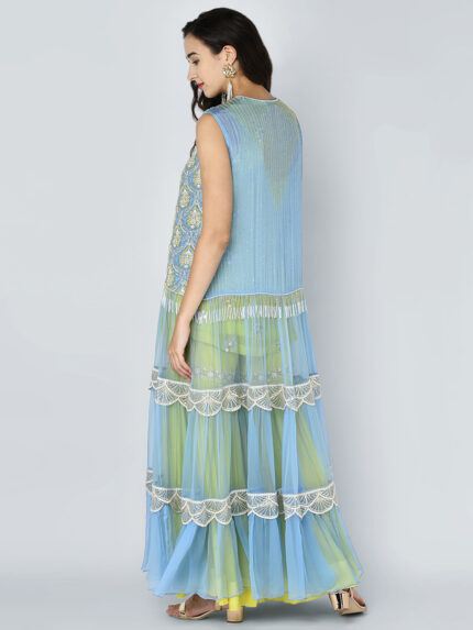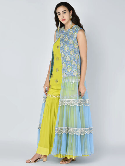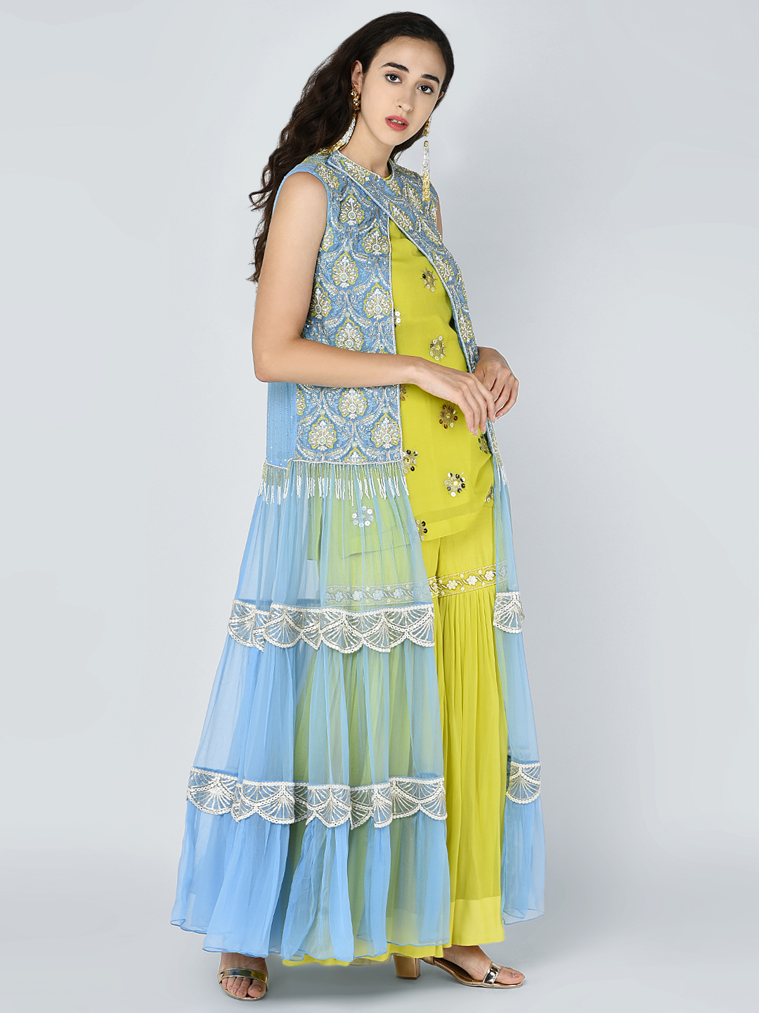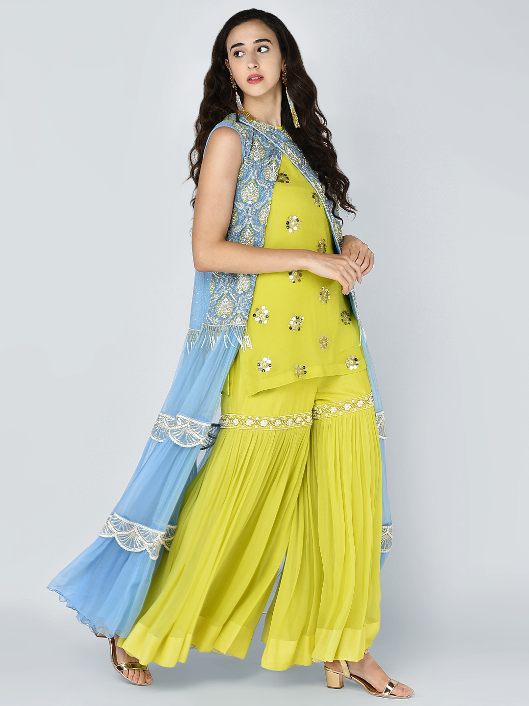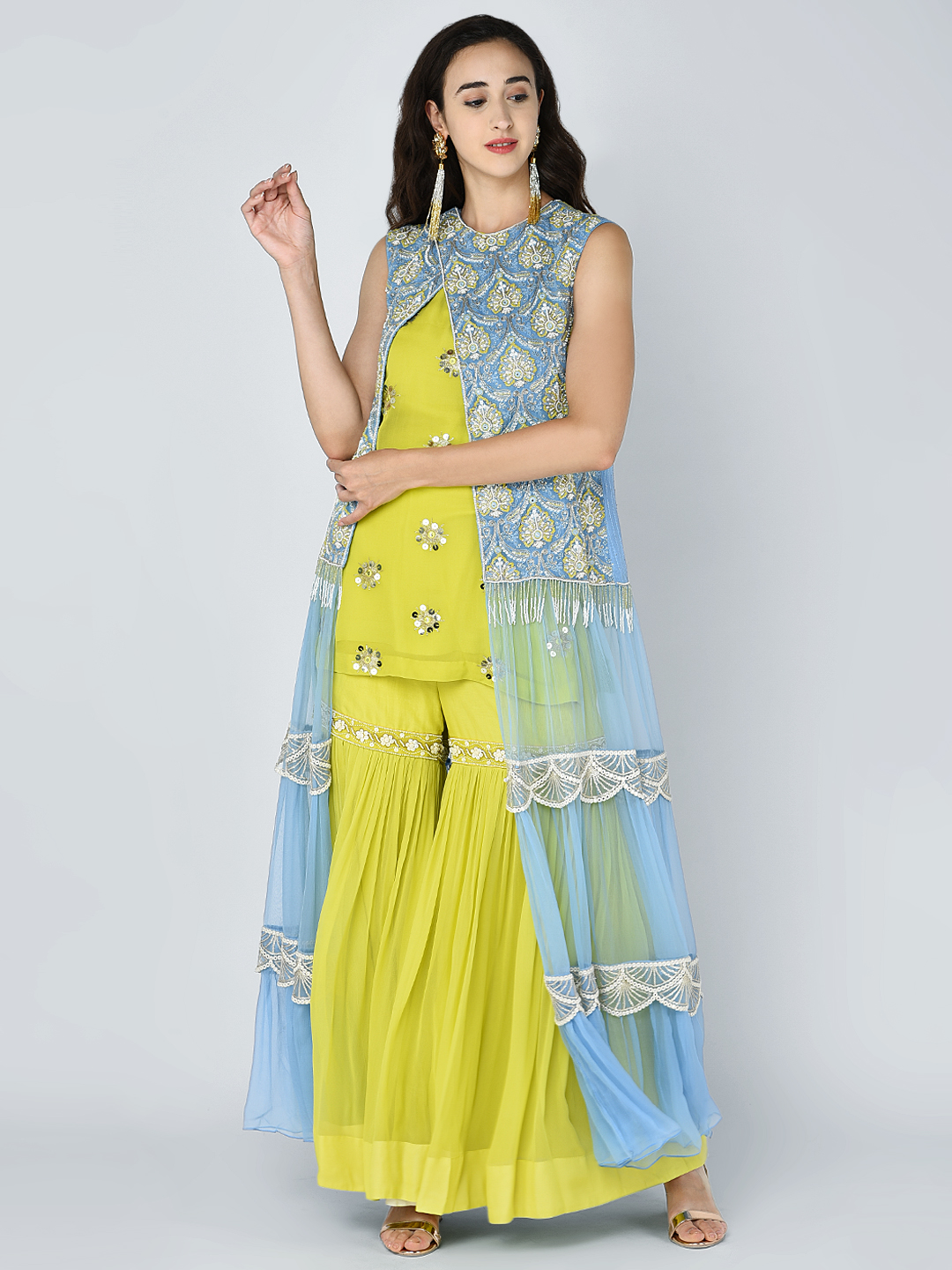 EMBROIDERED HEAVY BEAD SEQUINS MOTIF TIER CHIFFON JACKET WITH A GOLD SEQUIN EMBROIDERED TUNIC & AN EMBROIDERED BAND GEORGETTE GATHERED PALAZZO