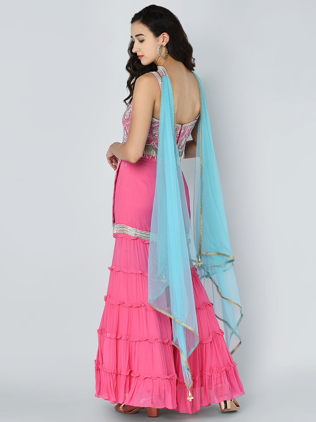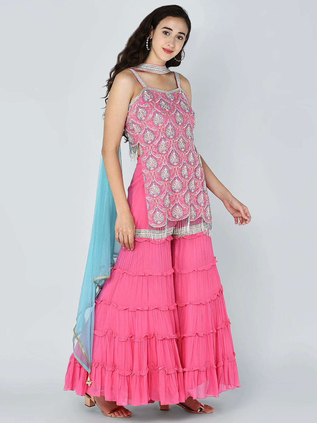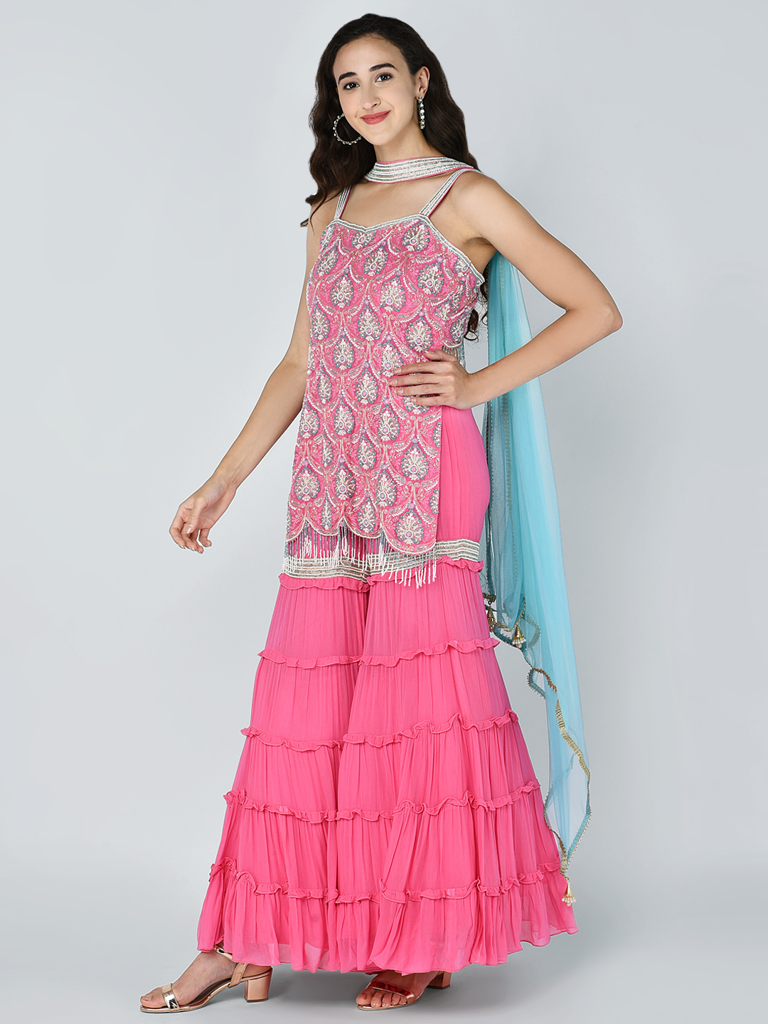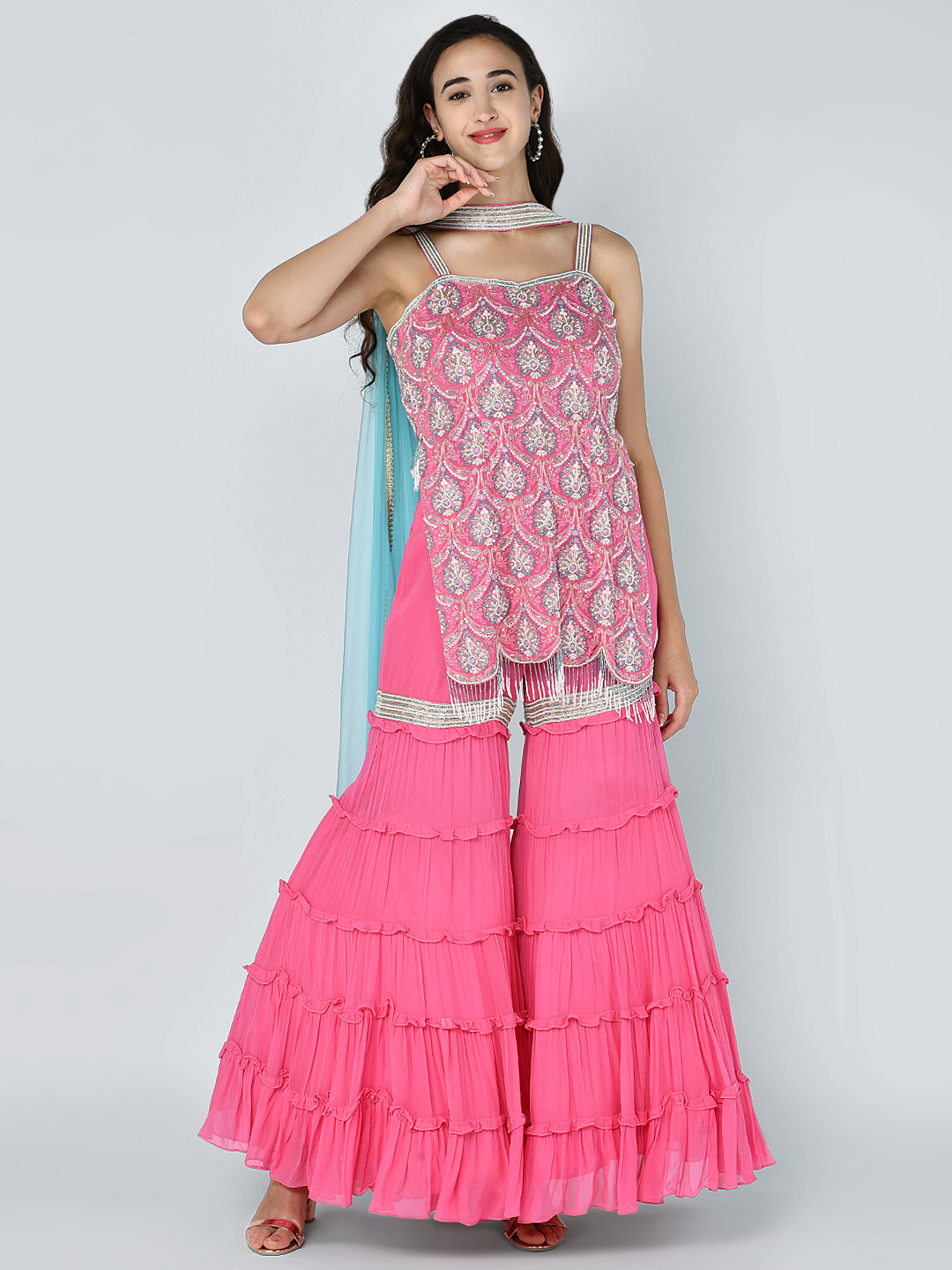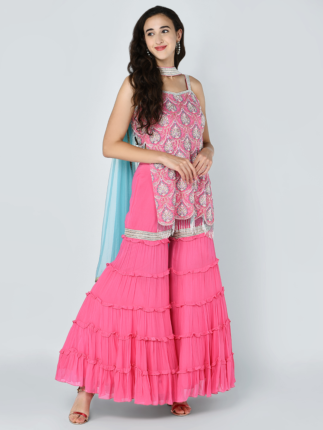 PINK EMBROIDERED TUNIC PAIRED WITH A TIER GHARARA AND SHADED DUPATTA