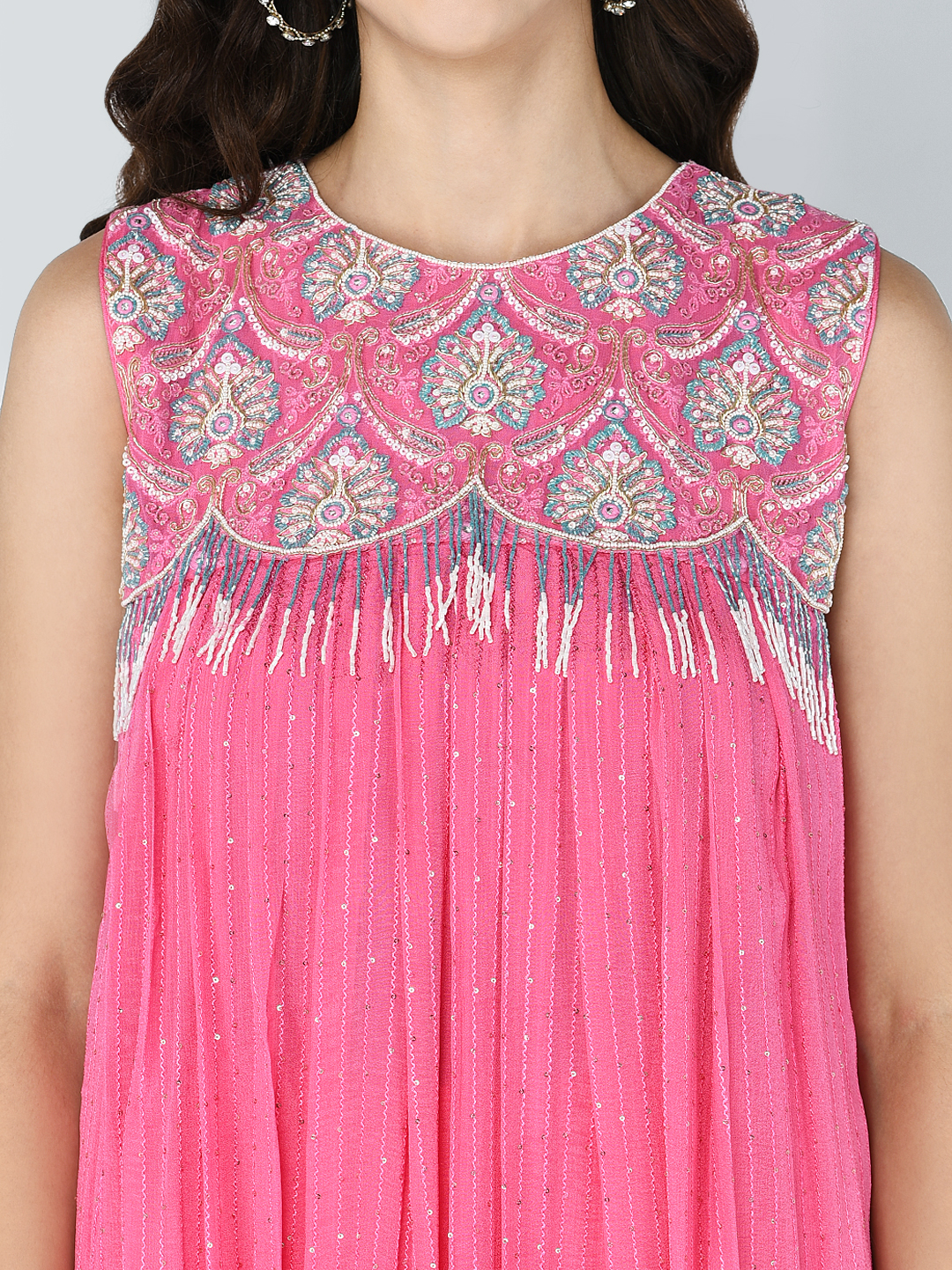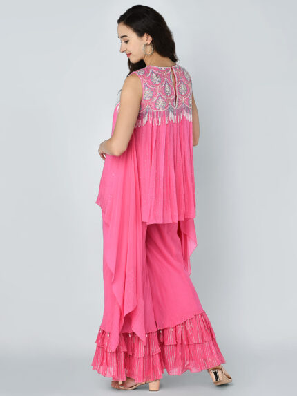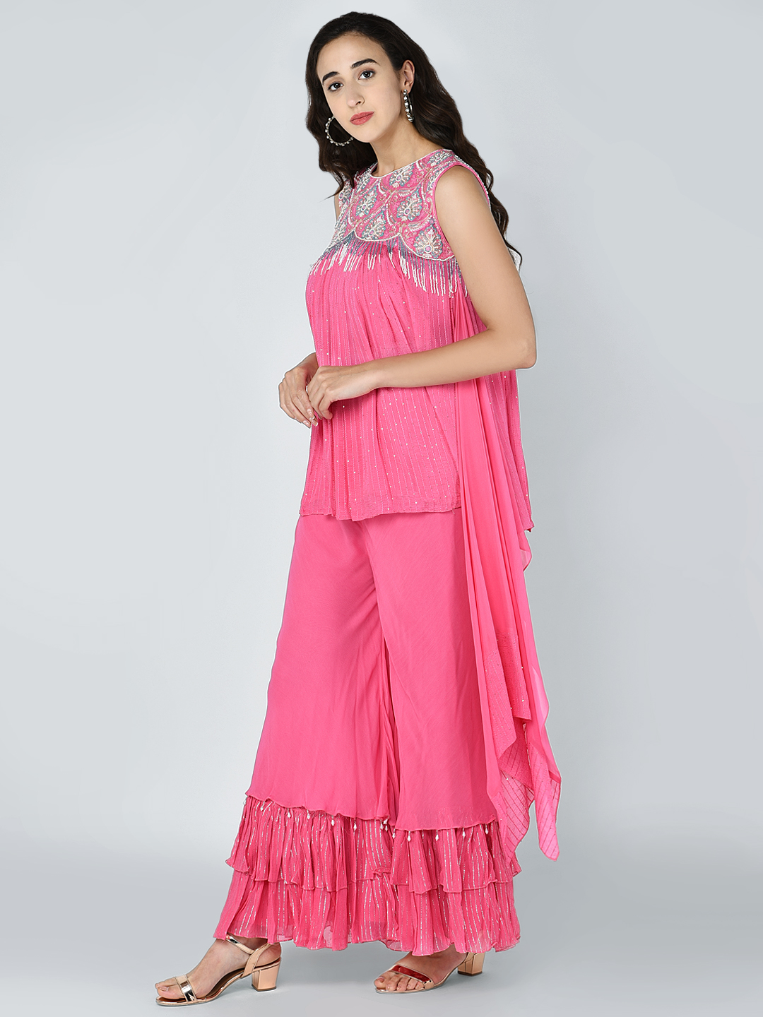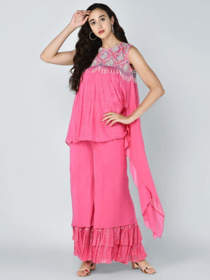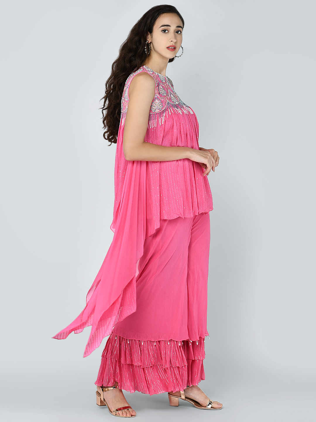 PINK EMBELLISHED YOKE PAIRED WITH A DOUBLE LAYER PALAZZO