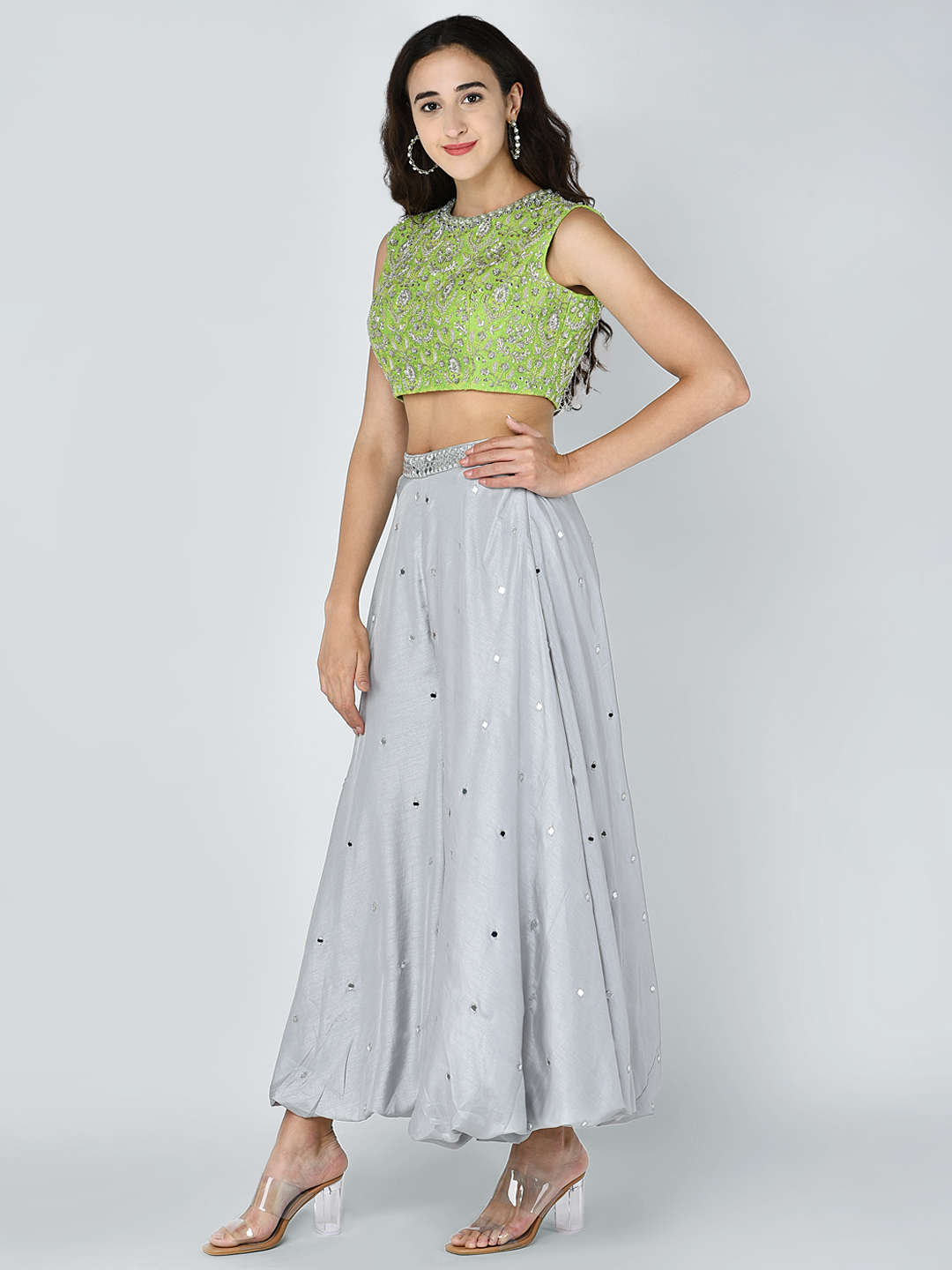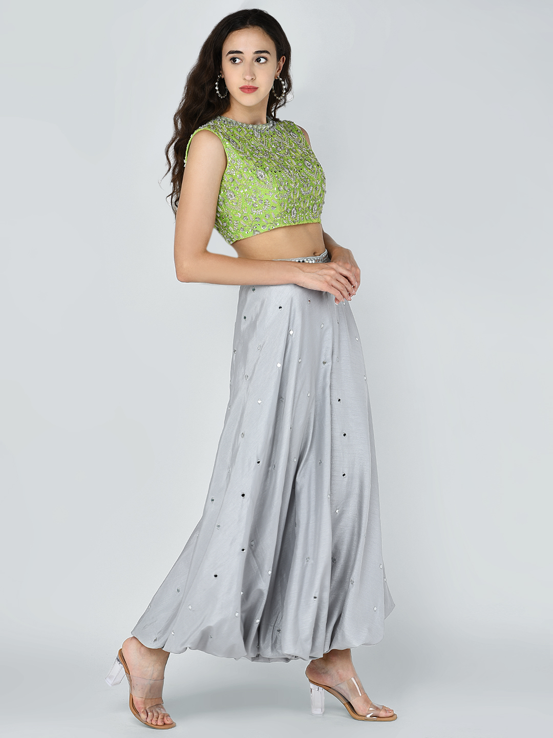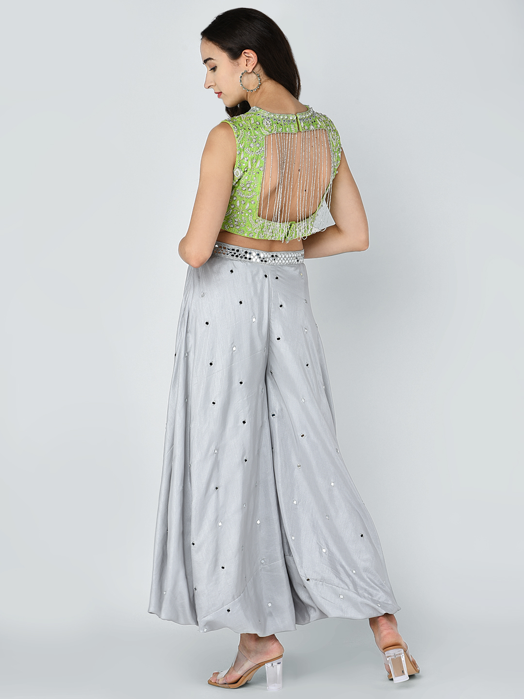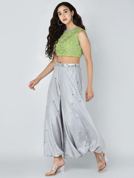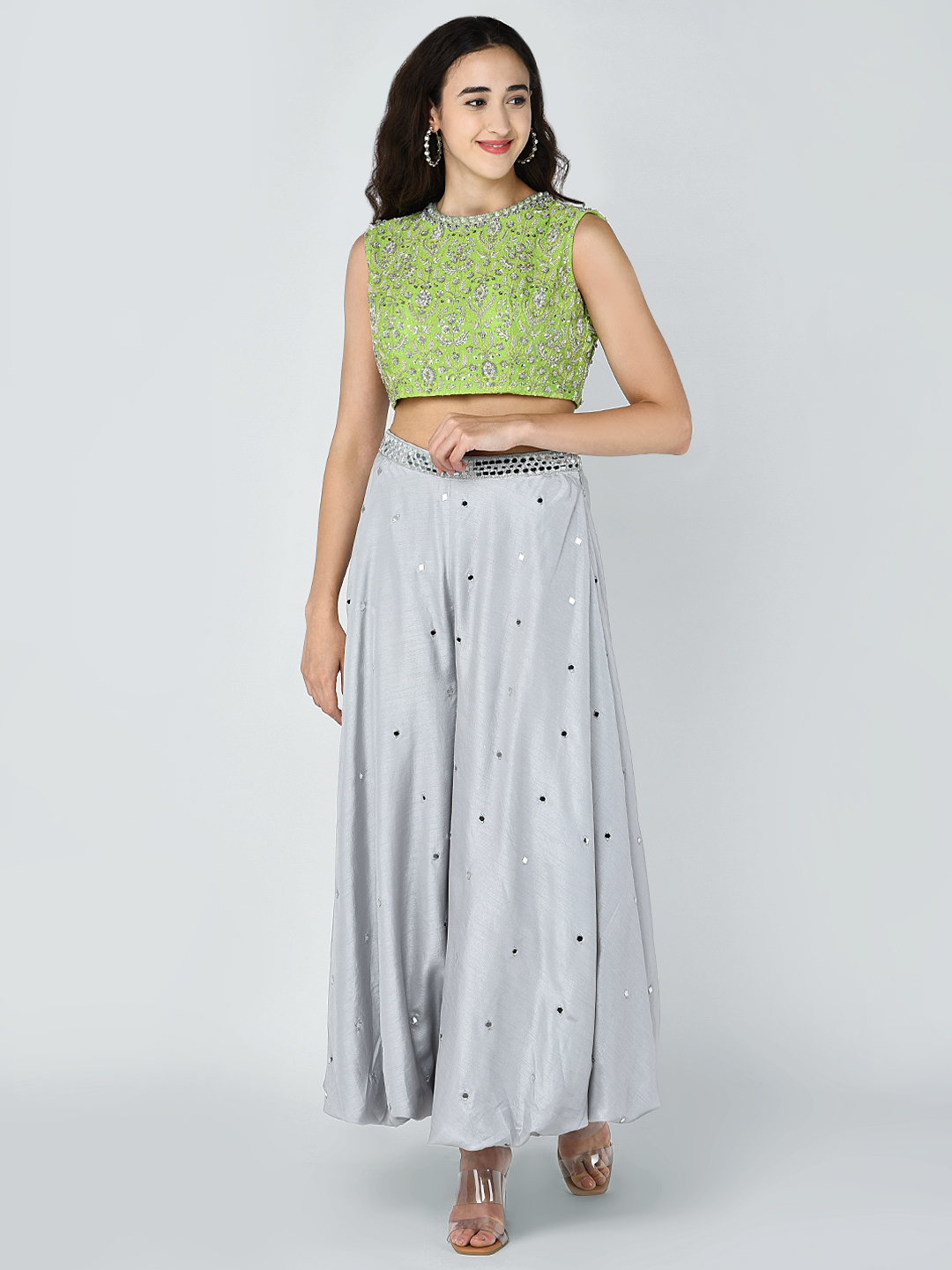 GREEN EMBELLISHED CROP TOP PAIRED WITH A GREY BALLOON PALAZZO