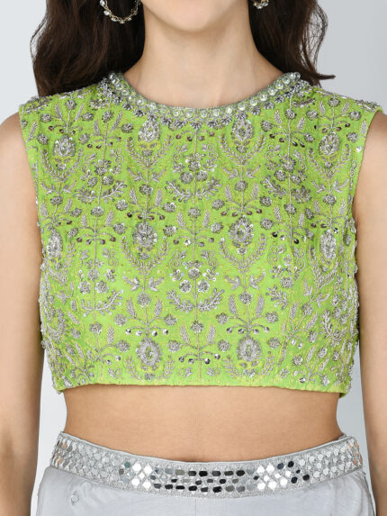 SILVER ZARDOZI EMBROIDERED GREEN CROP TOP WITH A SILVER TASSEL DETAILED BACK & WITH A SILVER MIRROR EMBROIDERED SILK BALLOON PANT