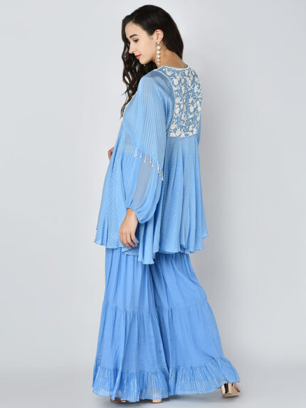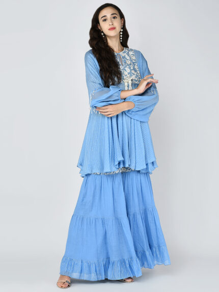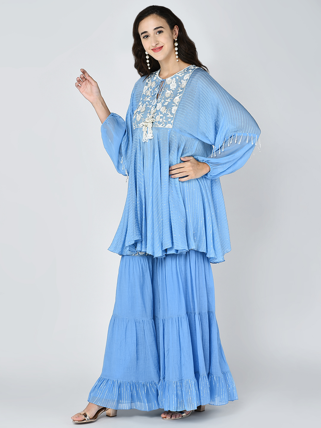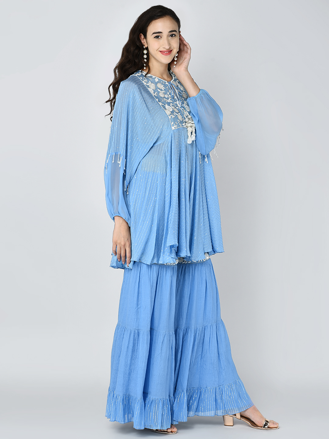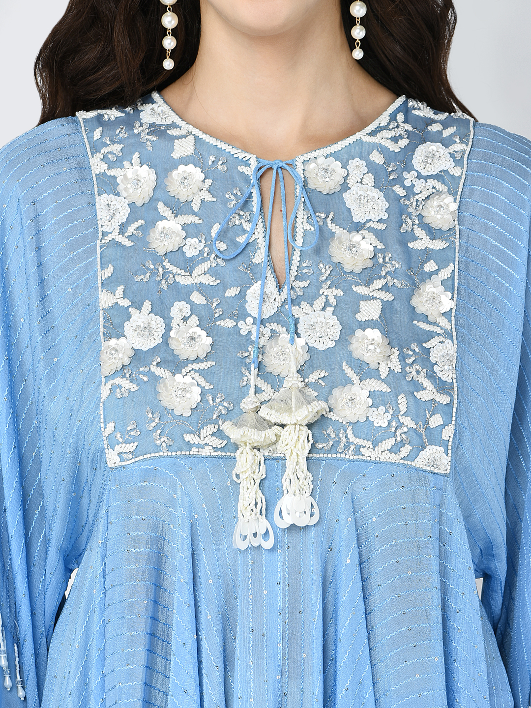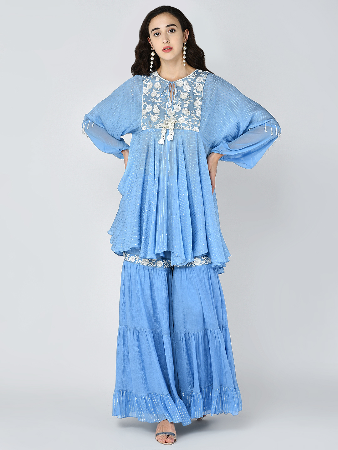 BLUE EMBROIDERED YOKE PANEL TUNIC WITH A TIER GHARARA