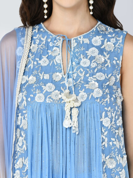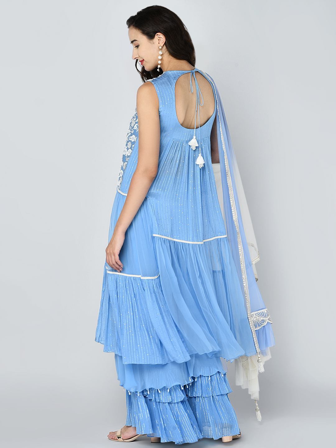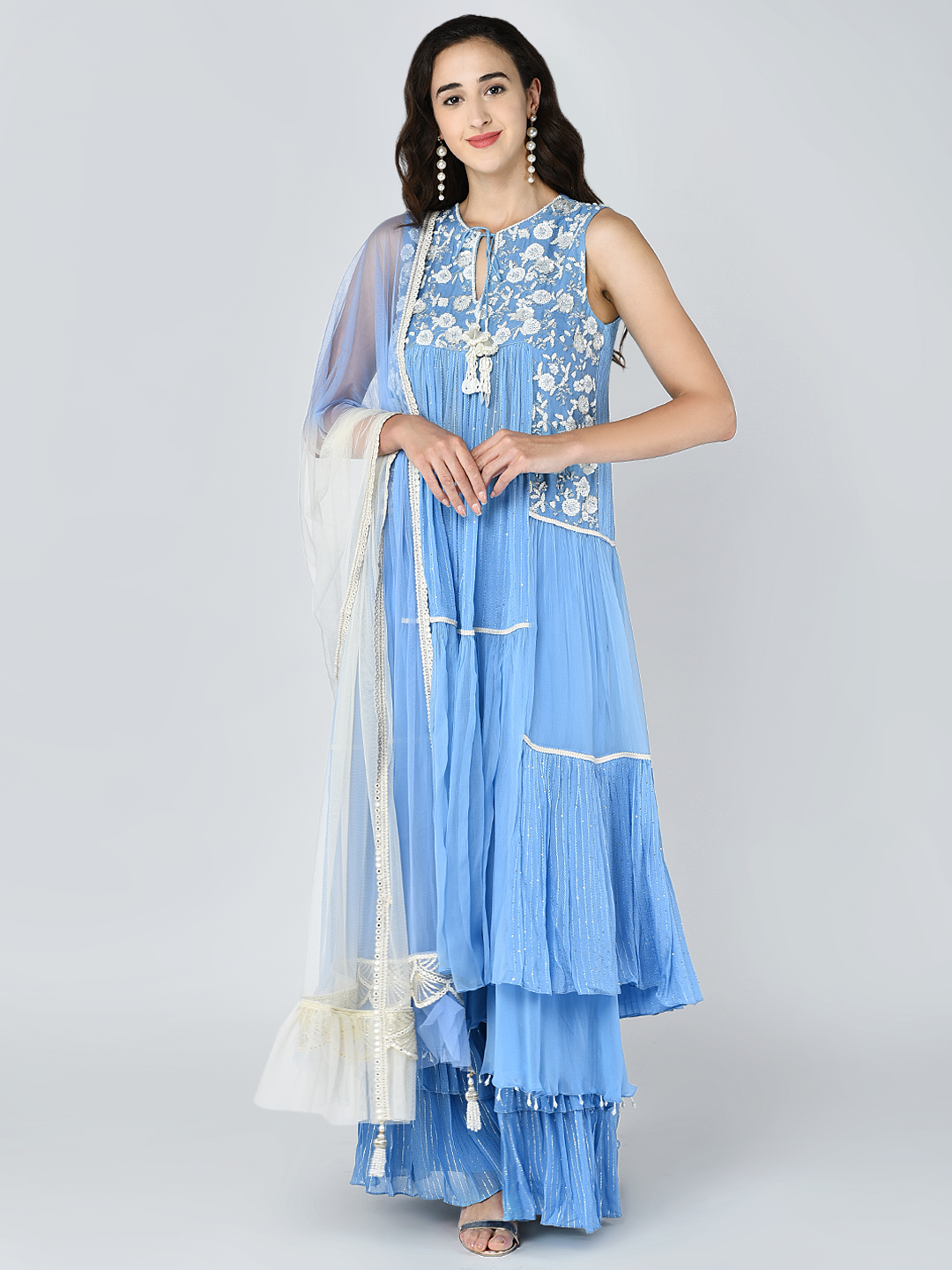 IVORY CREAM BEAD SEQUINS EMBROIDERED YOKE BLUE TIER TUNIC WITH AN DOUBLE LAYER GEORGETTE PALAZZO & A SHADED NET DUPATTA