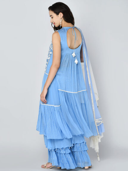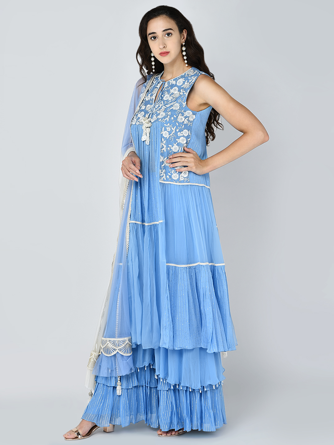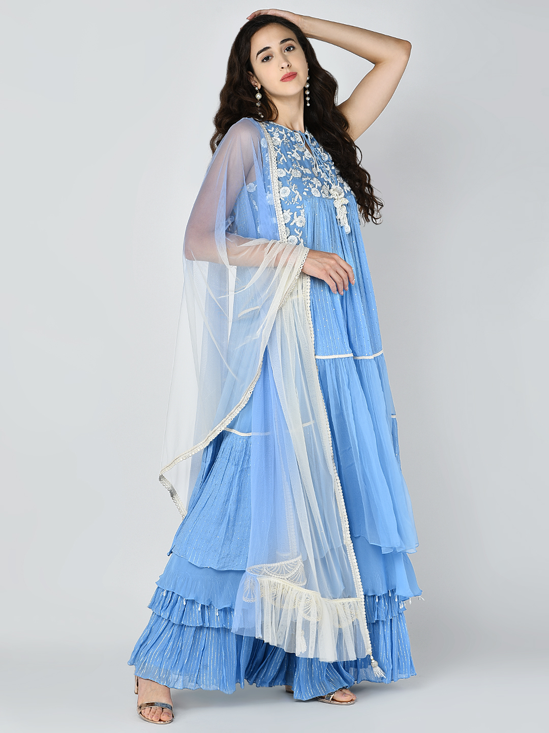 BLUE EMBROIDERED TIER DRESS PAIRED WITH A DOUBLE LAYER PALAZZO & OMBRÉ DUPATTA