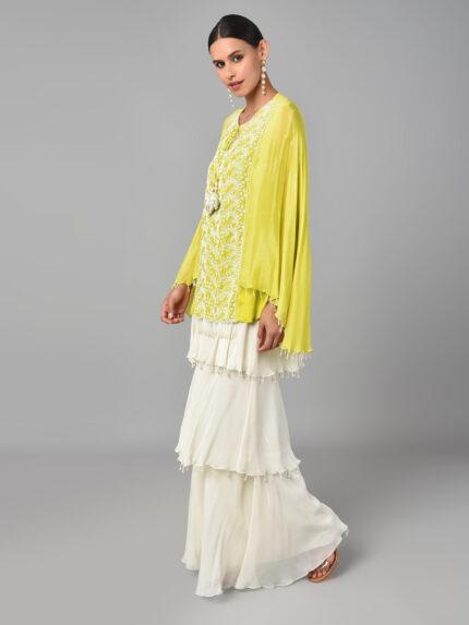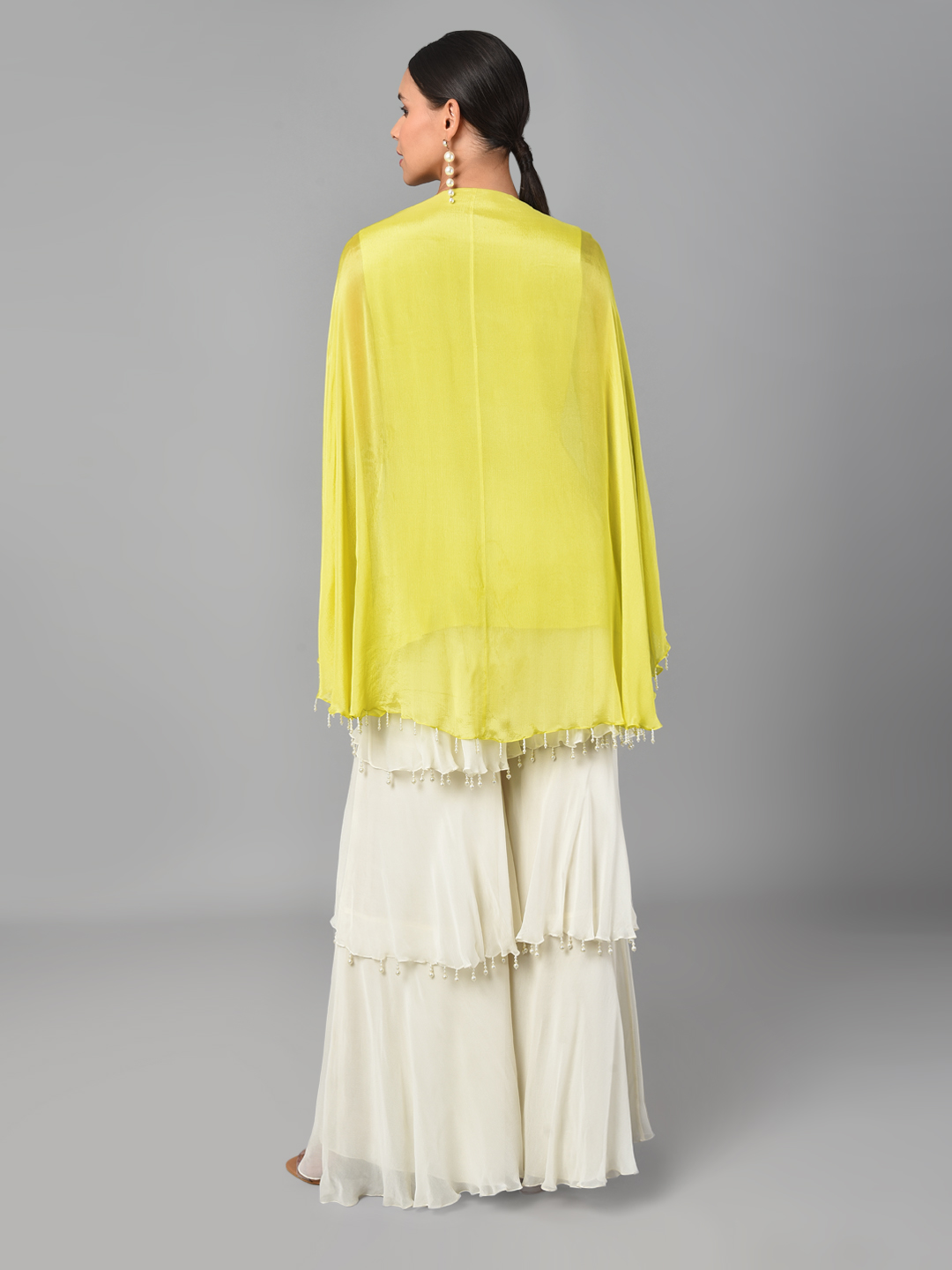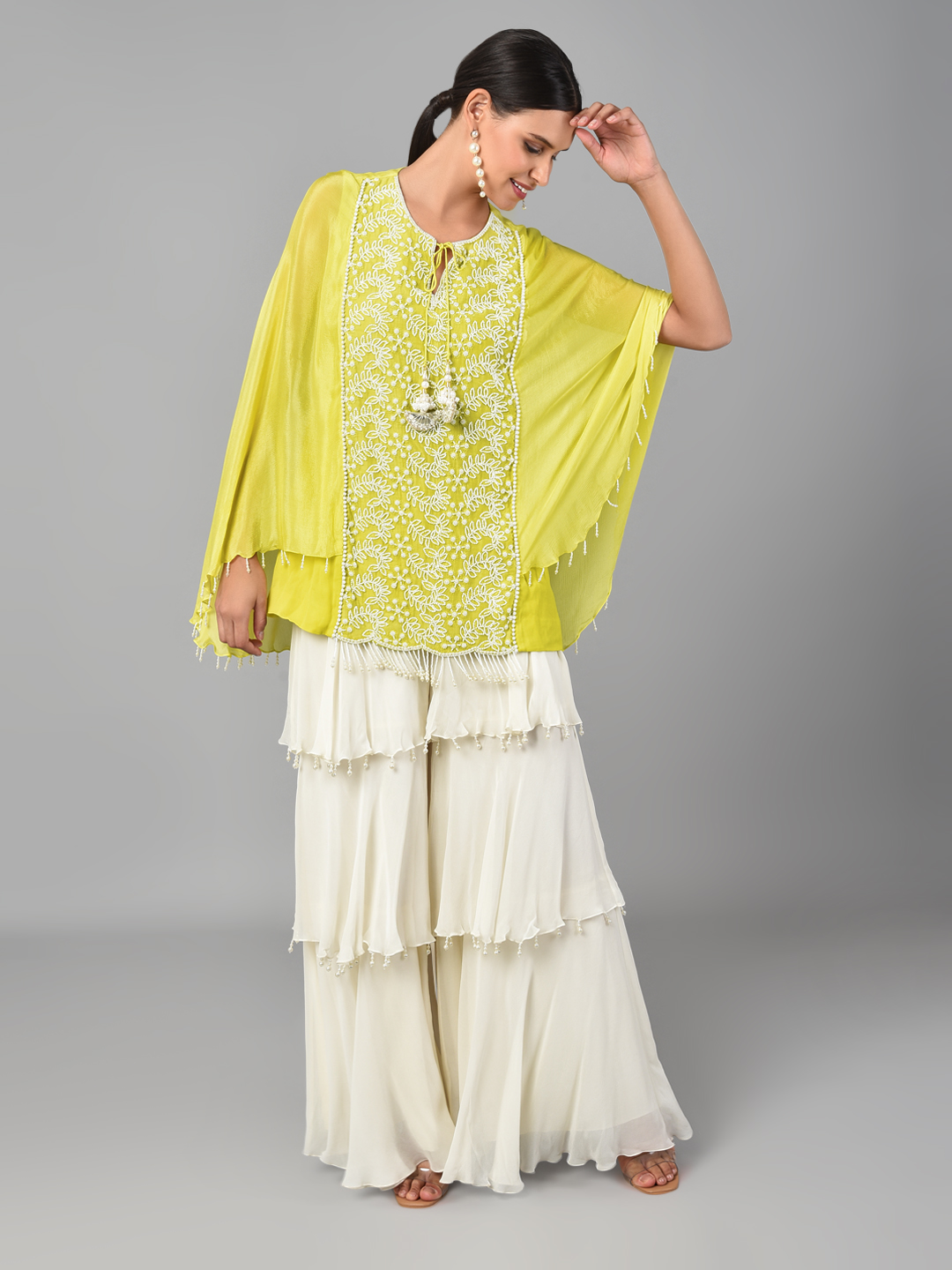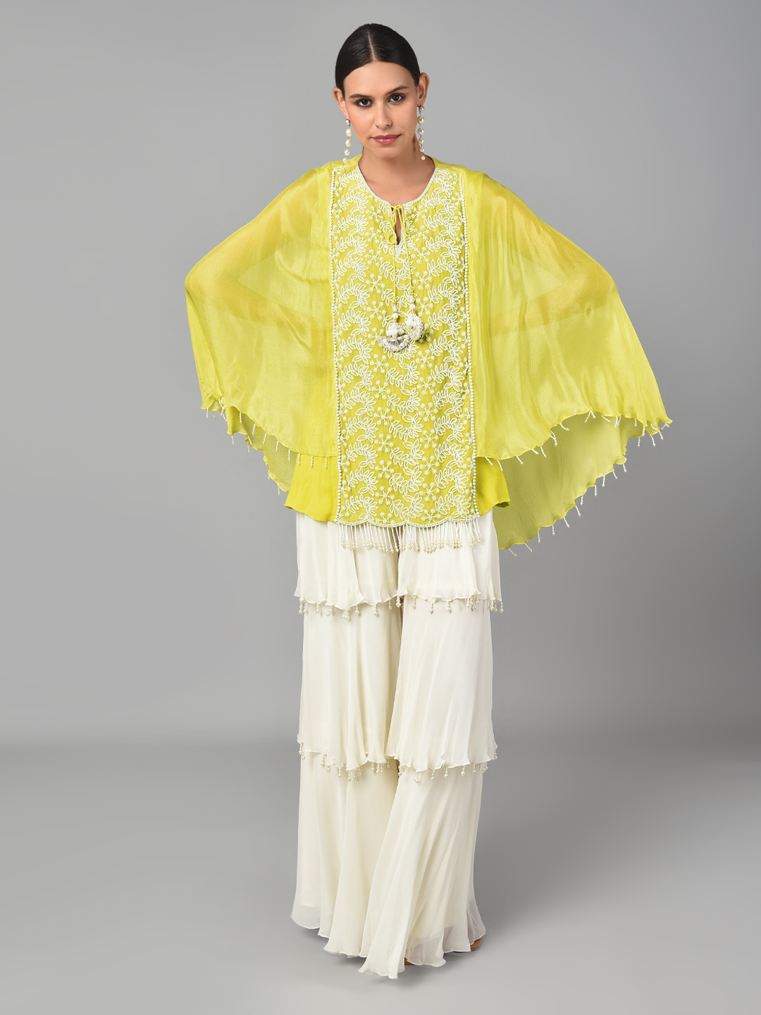 IVORY BEAD EMBROIDERED PANEL YOKE HIGH LOW CHIFFON CREPE TUNIC WITH AN IVORY TIER PEARL DROP GEORGETTE PALAZZO