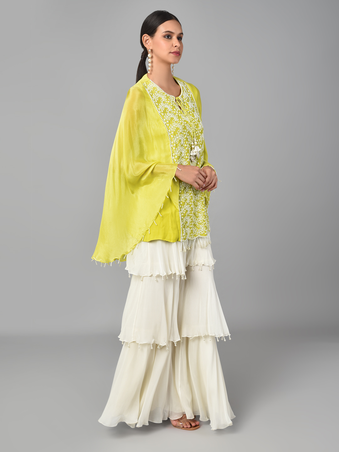 IVORY TINY FLOWER & BEAD EMBELLISHED PEPLUM TOP PAIRED WITH AN ZARI ORGANZA SHARARA AND A NET CHOKER DUPATTA