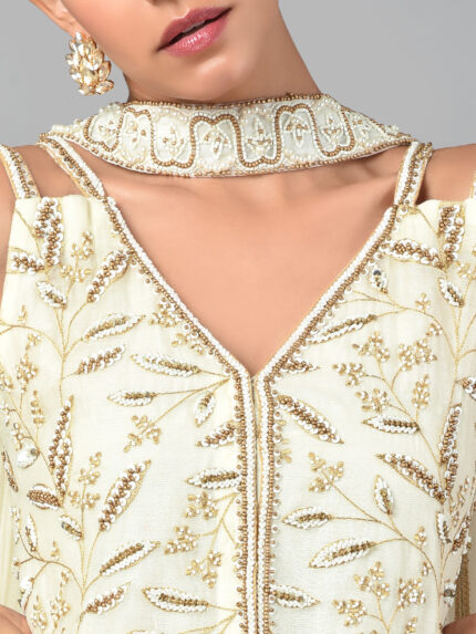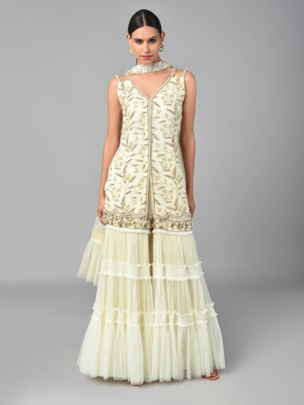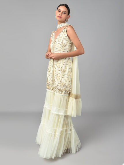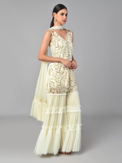 BRONZE ZARI/ BEAD IVORY CHANDERI SILK EMBROIDERED TUNIC WITH AN EMBROIDERED BAND TIER NET PALAZZO & NET DUPATTA IVORY BEAD/ GOLD SEQUINS EMBROIDERED PANEL YOKE GOLD ZARI GEORGETTE TUNIC WITH AN IVORY GEORGETTE/ ORGANZA TIER SEQUINS DROPS HEMLINE PALAZZO