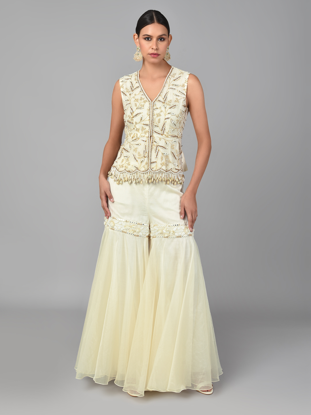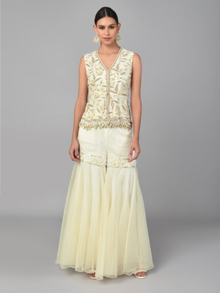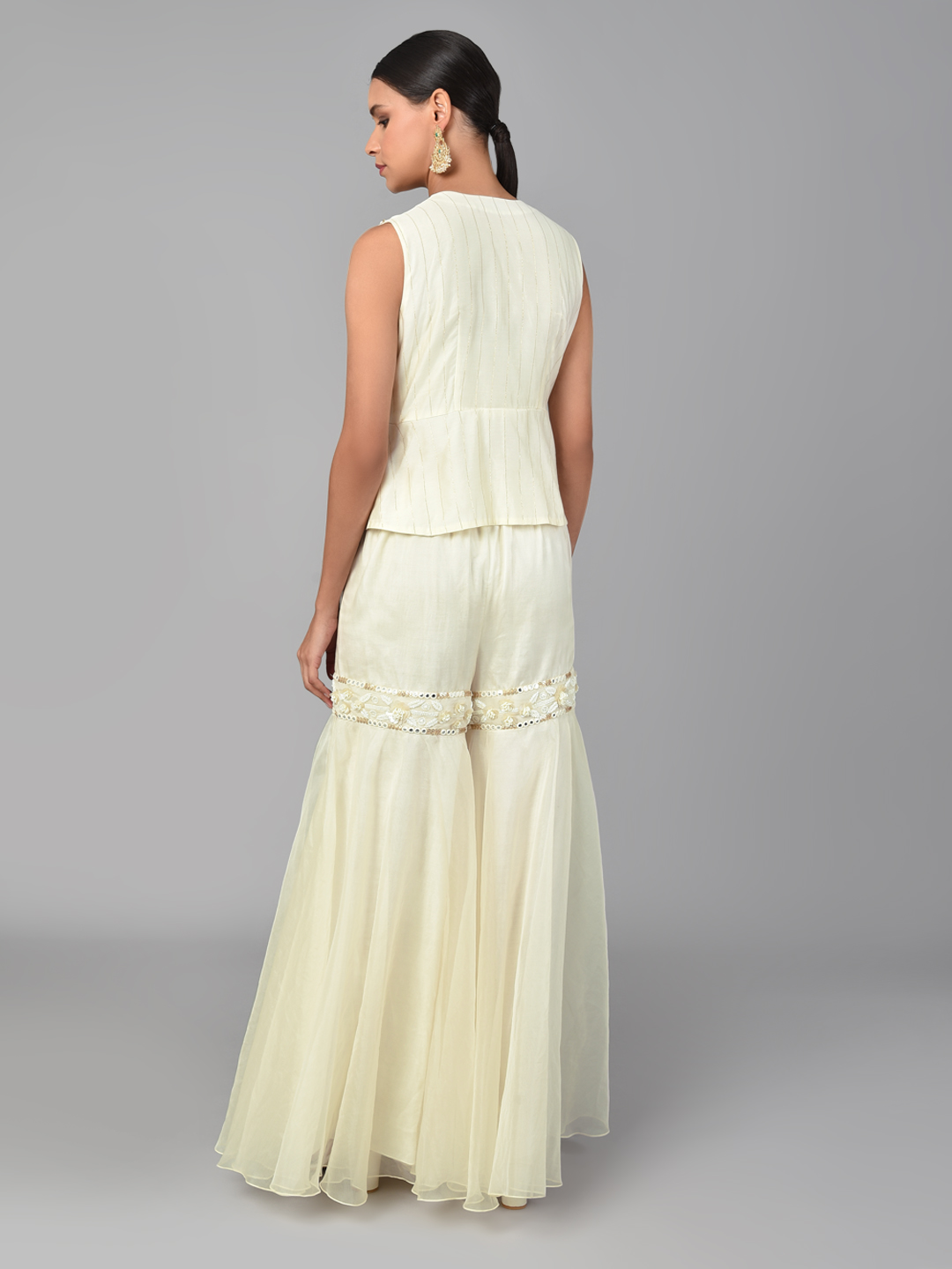 BRONZE ZARI/ BEAD IVORY CHANDERI SILK EMBROIDERED TUNIC WITH AN EMBROIDERED BAND ORGANZA PALAZZO