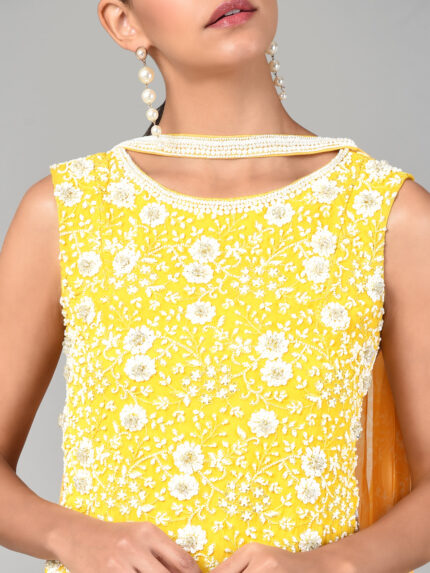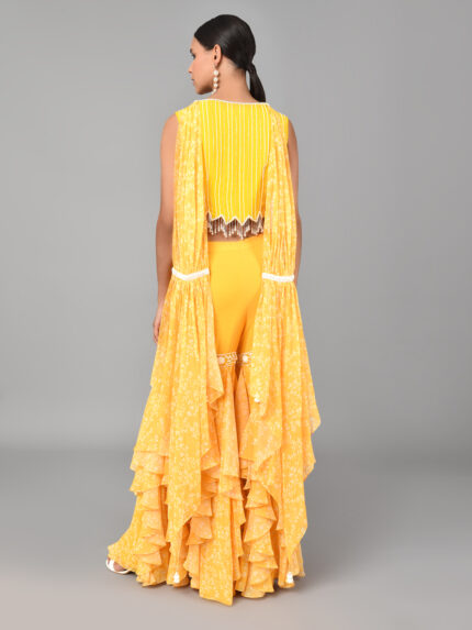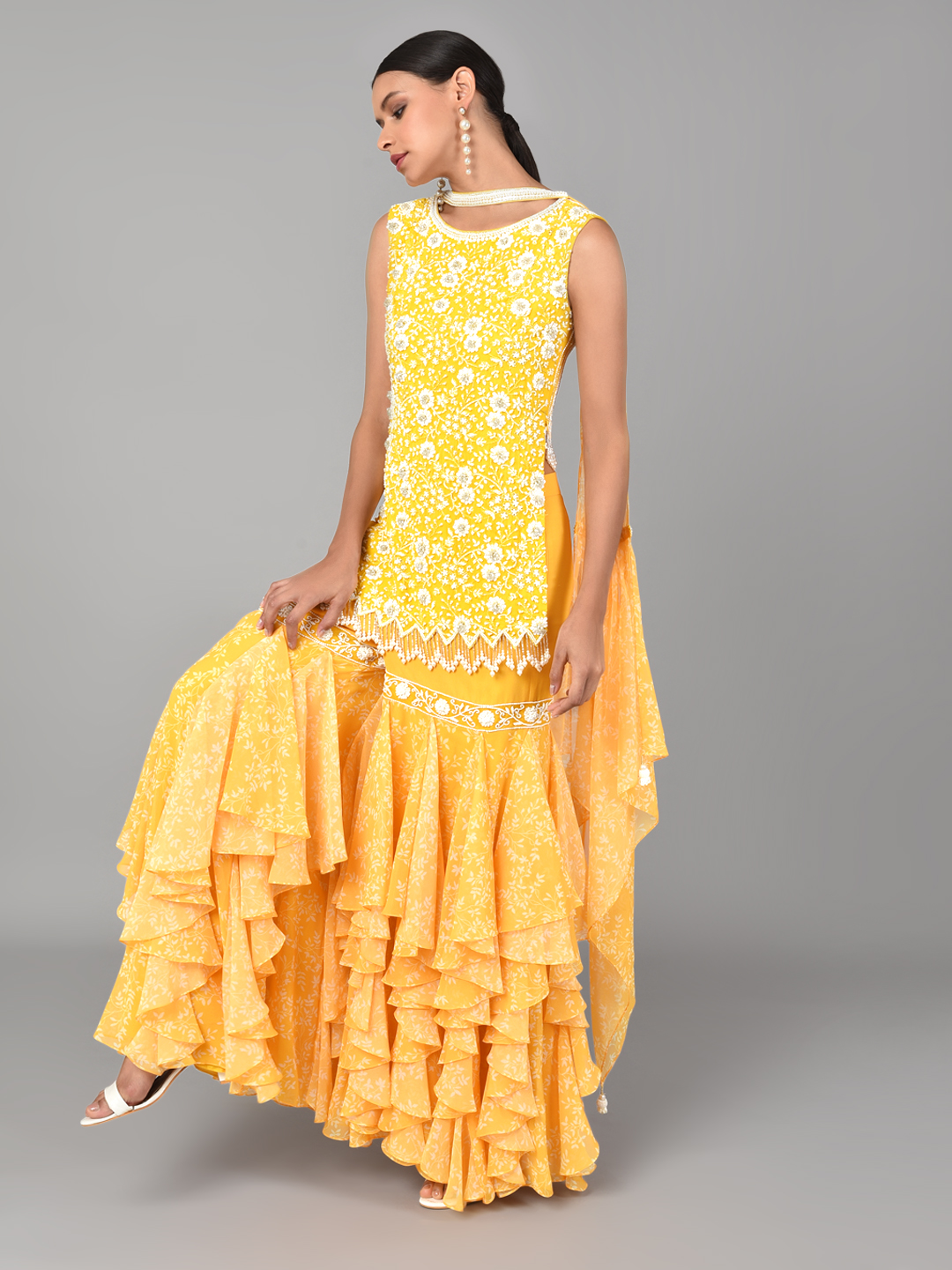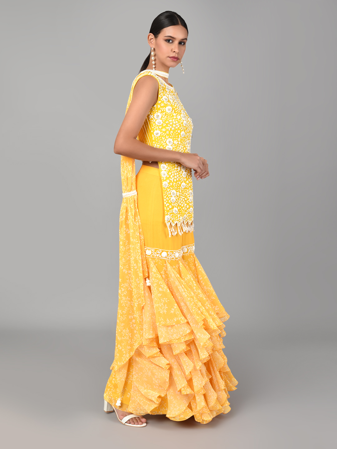 IVORY BEAD SEQUINS HEAVY EMBROIDERED MUSTARD GEORGETTE TUNIC WITH AN EMBROIDERED BAND RUFFLE PRINTED PALAZZO & A PRINTED GEORGETTE DUPATTA