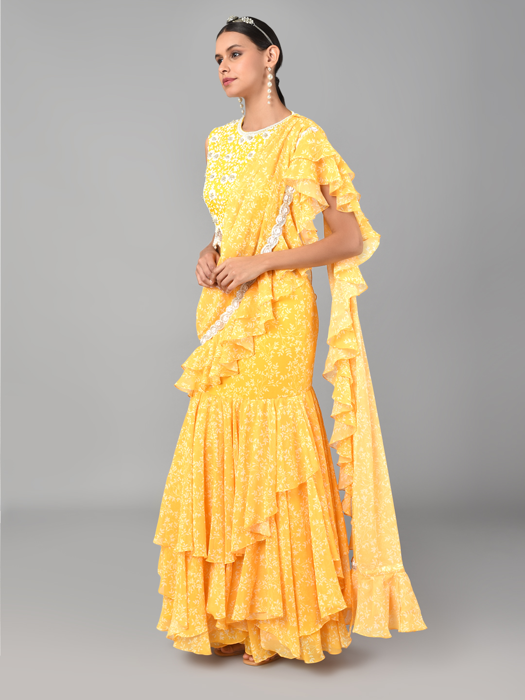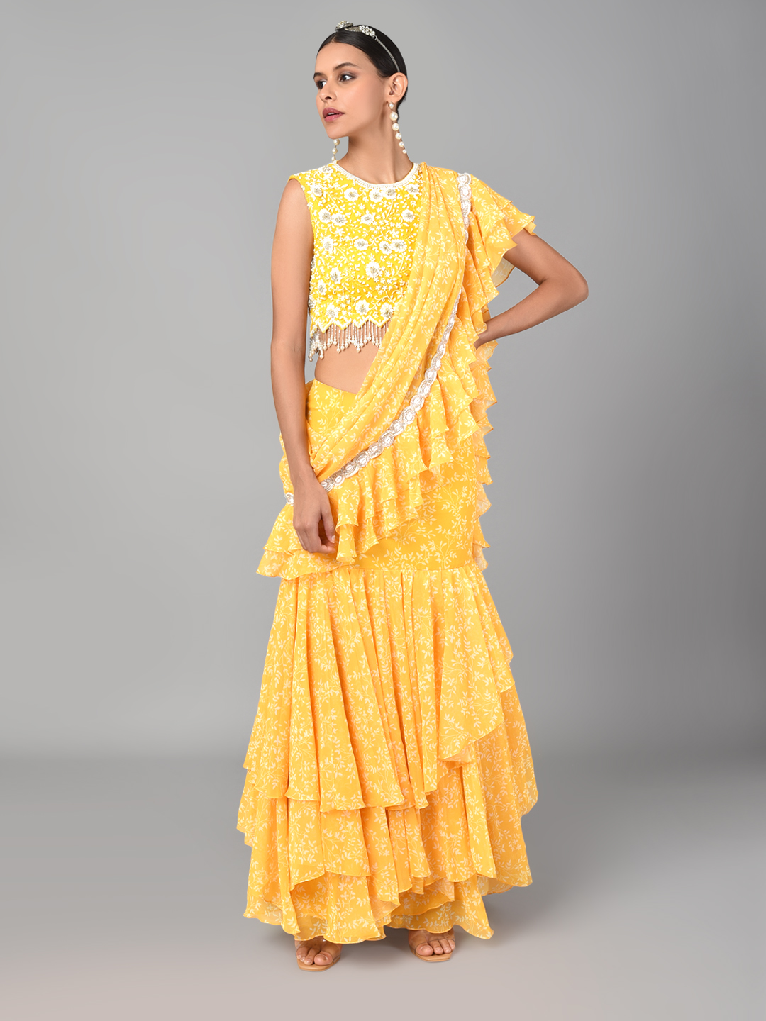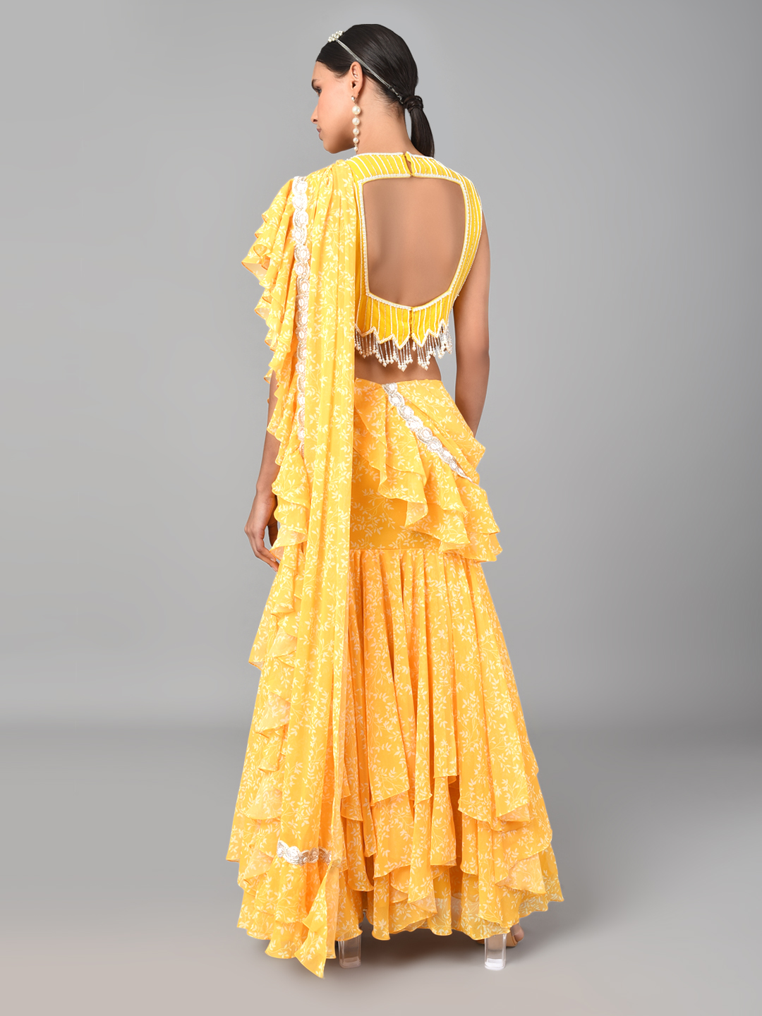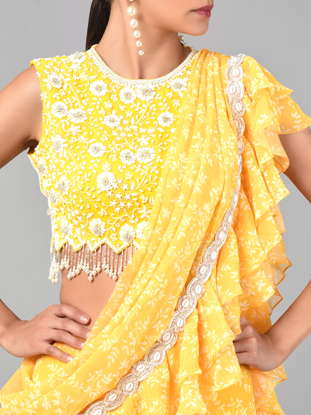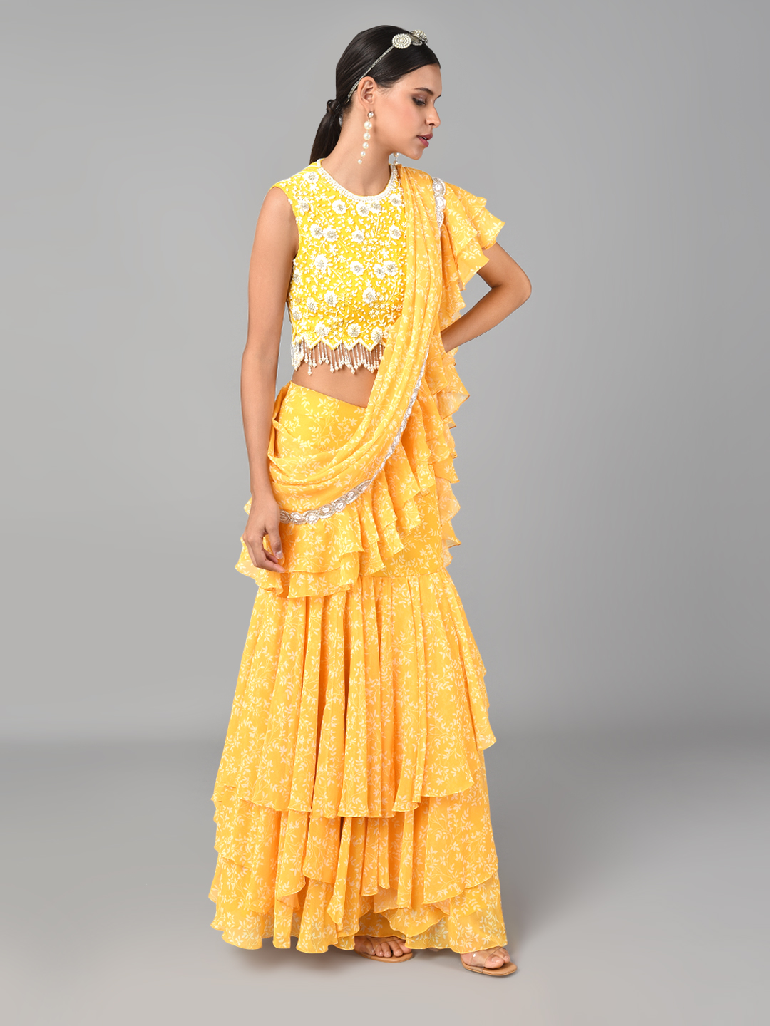 IVORY BEAD SEQUINS HEAVY EMBROIDERED MUSTARD GEORGETTE BLOUSE WITH A TIER PRINTED GEORGETTE LAYER DRAPE SKIRT
