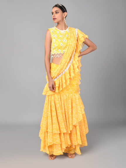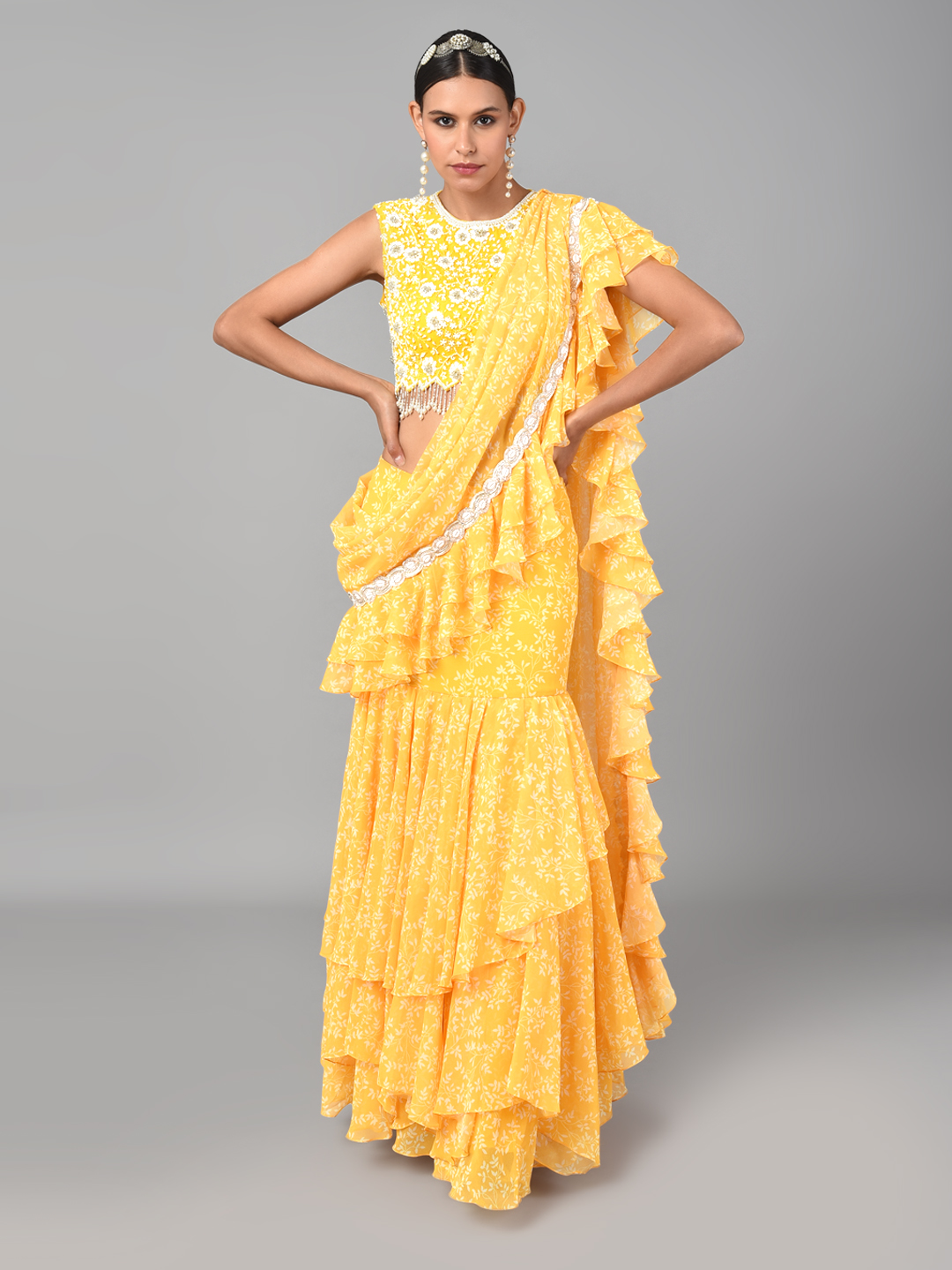 EMBELLISHED MUSTARD PEPLUM TOP WITH A GEORGETTE SKIRT