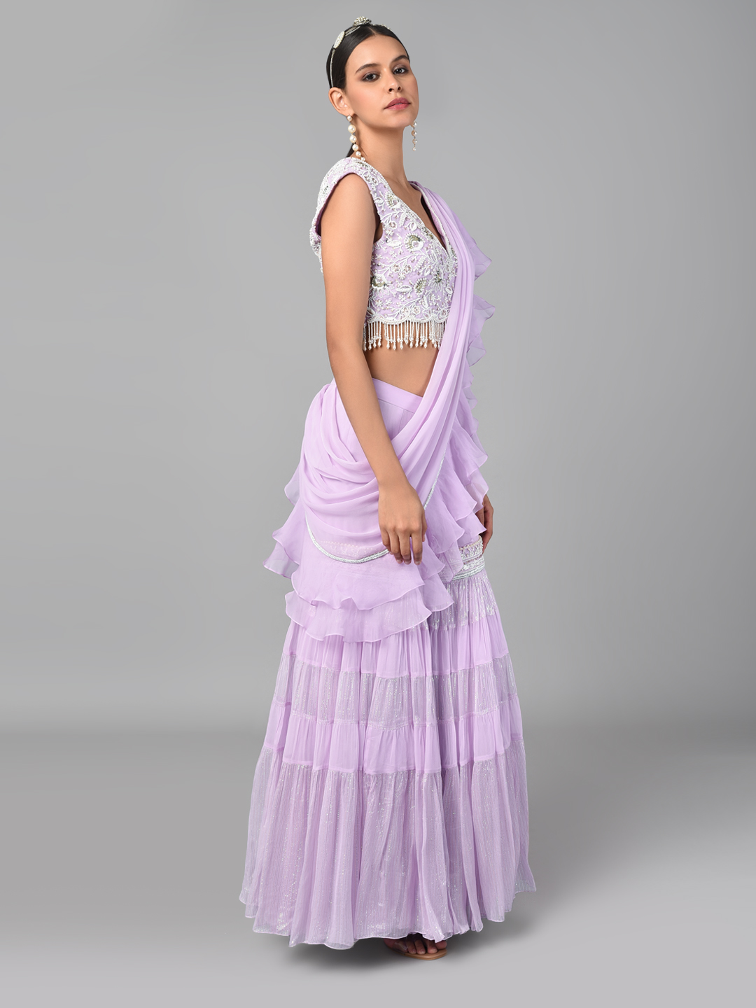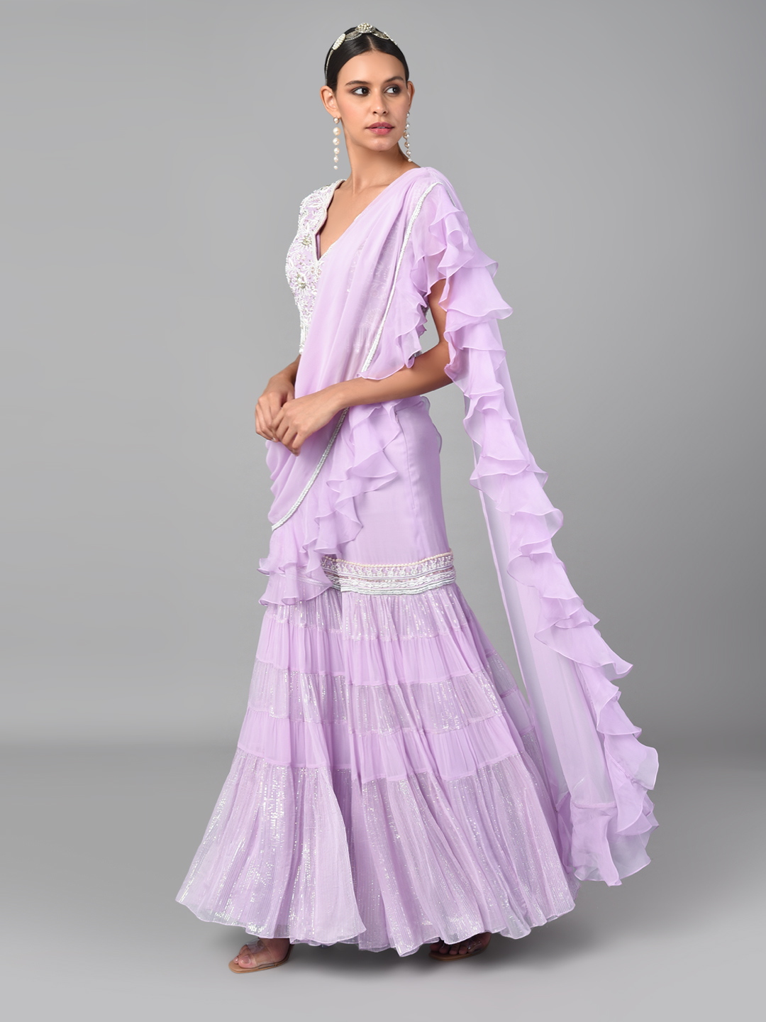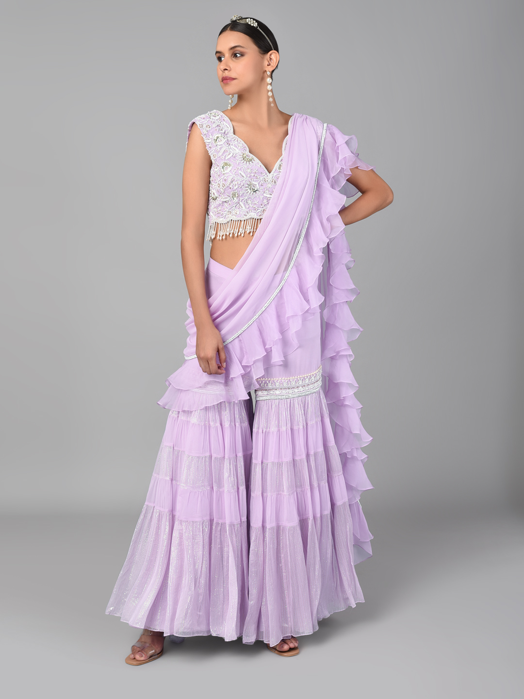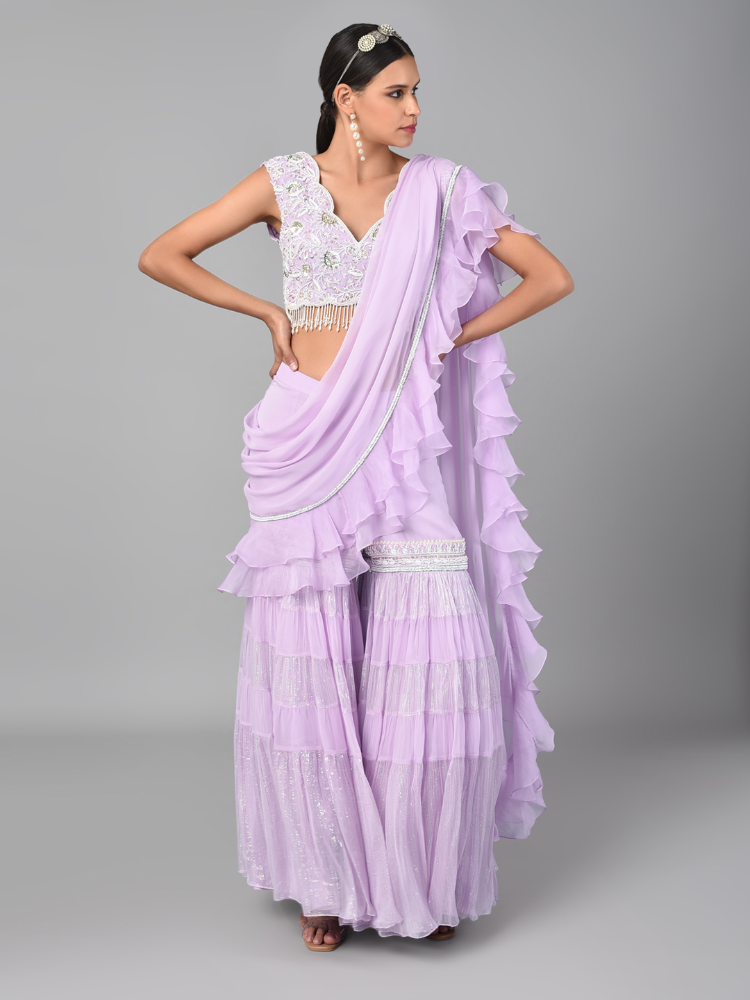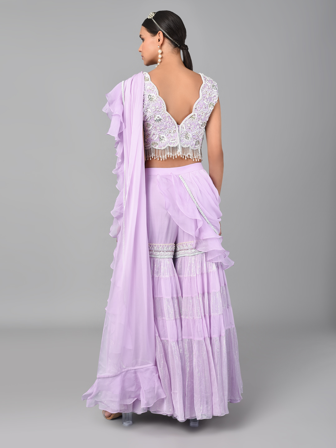 IVORY BEAD/ GOLD SEQUINS HEAVY EMBROIDERED LILAC GEORGETTE DRAPE PALAZZO SET