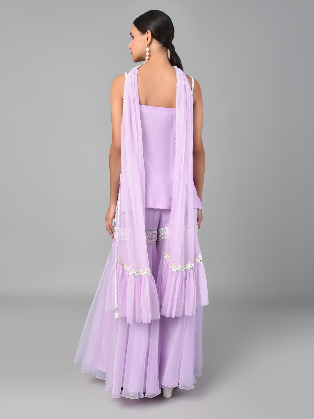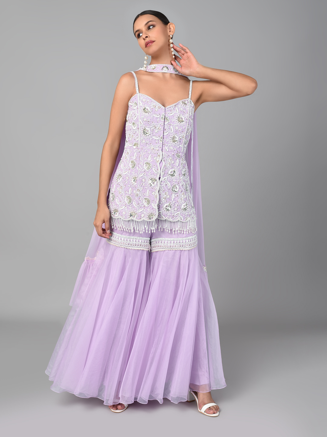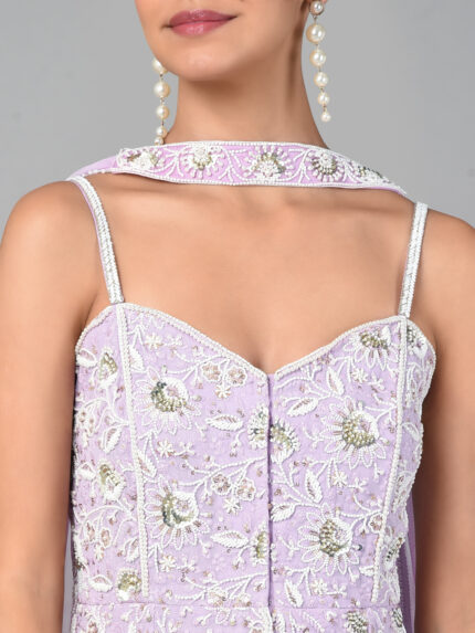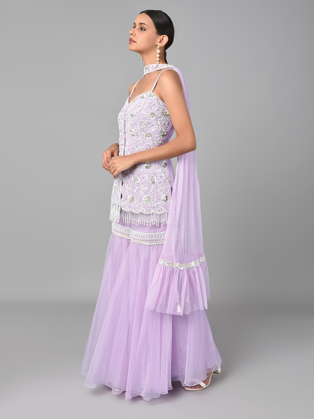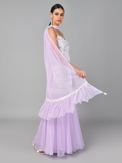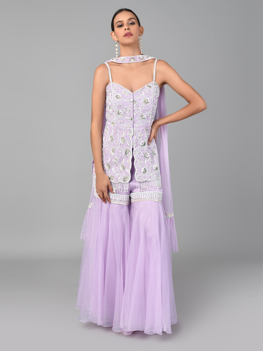 IVORY BEAD/ GOLD SEQUINS HEAVY EMBROIDERED LILAC GEORGETTE TUNIC WITH AN EMBROIDERED BAND ORGANZA PALAZZO & A NET DUPATTA