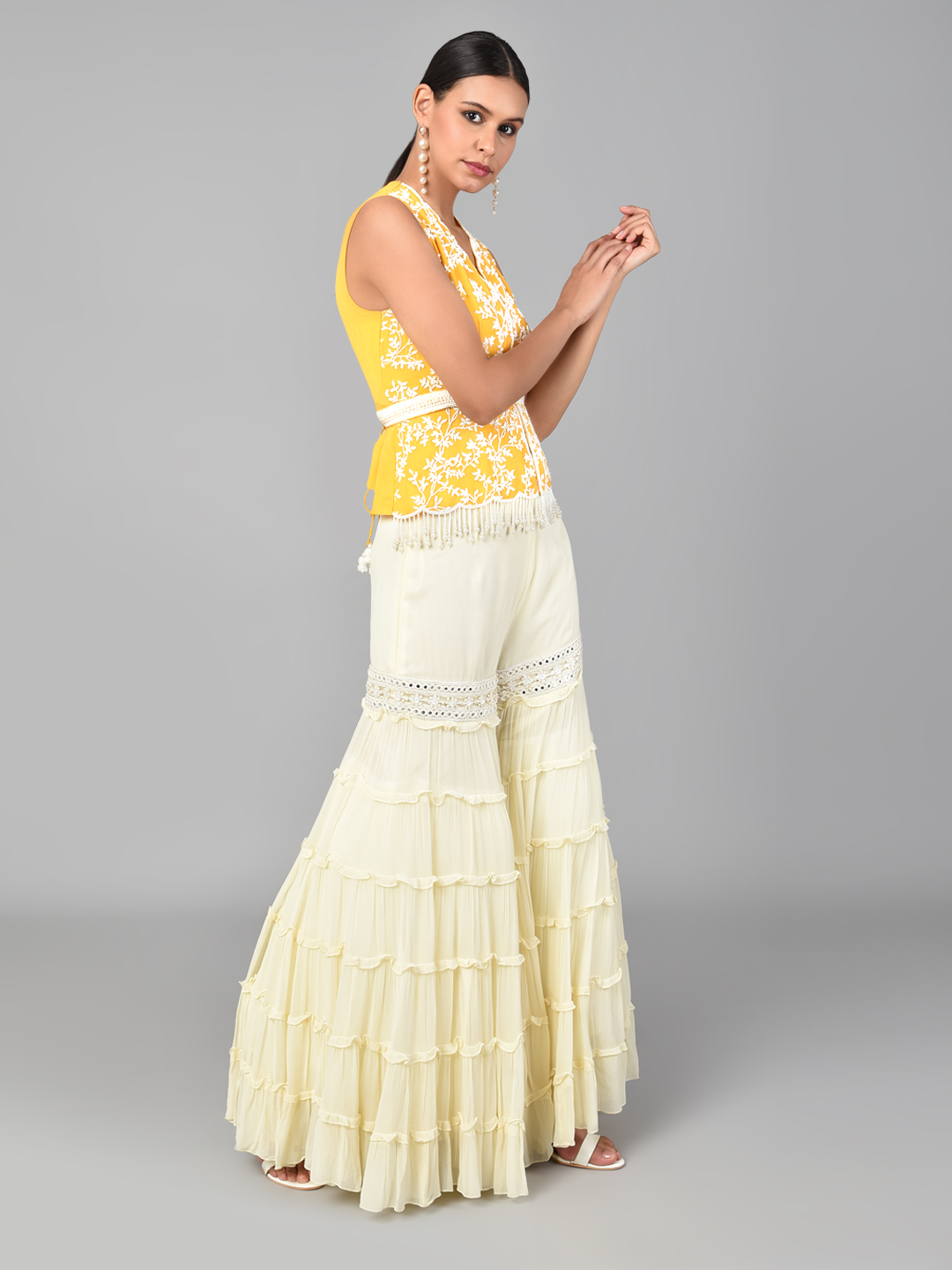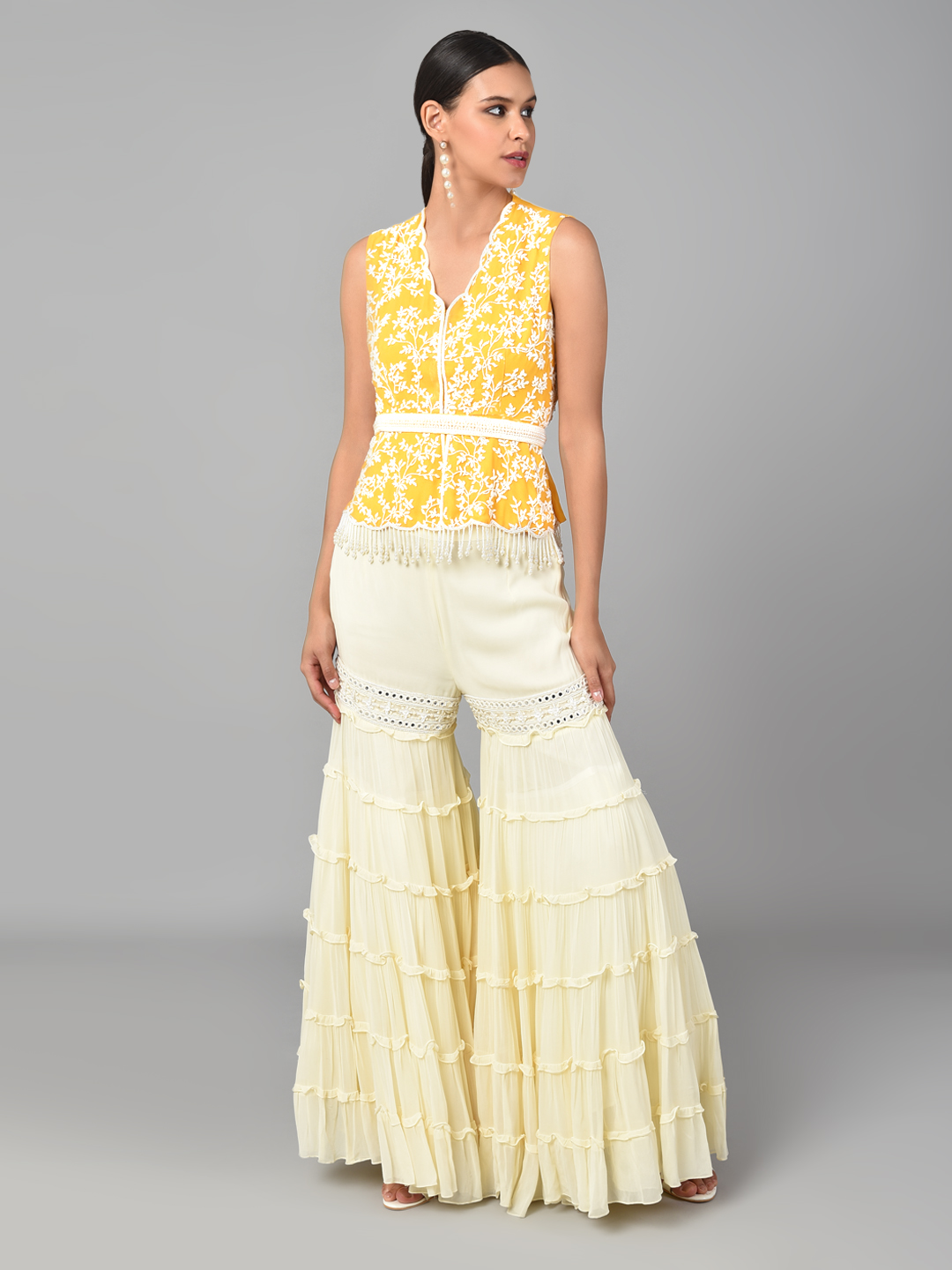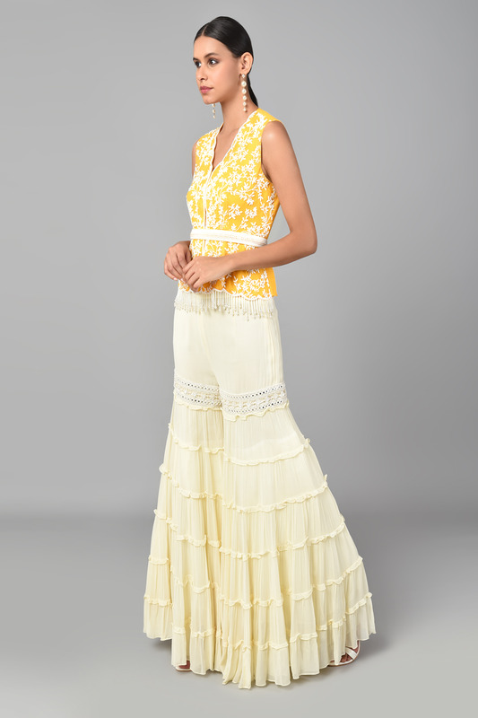 IVORY BEAD EMBROIDERED MUSTARD GEORGETTE TOP WITH AN EMBROIDERED BAND IVORY GEORGETTE TIER PALAZZO