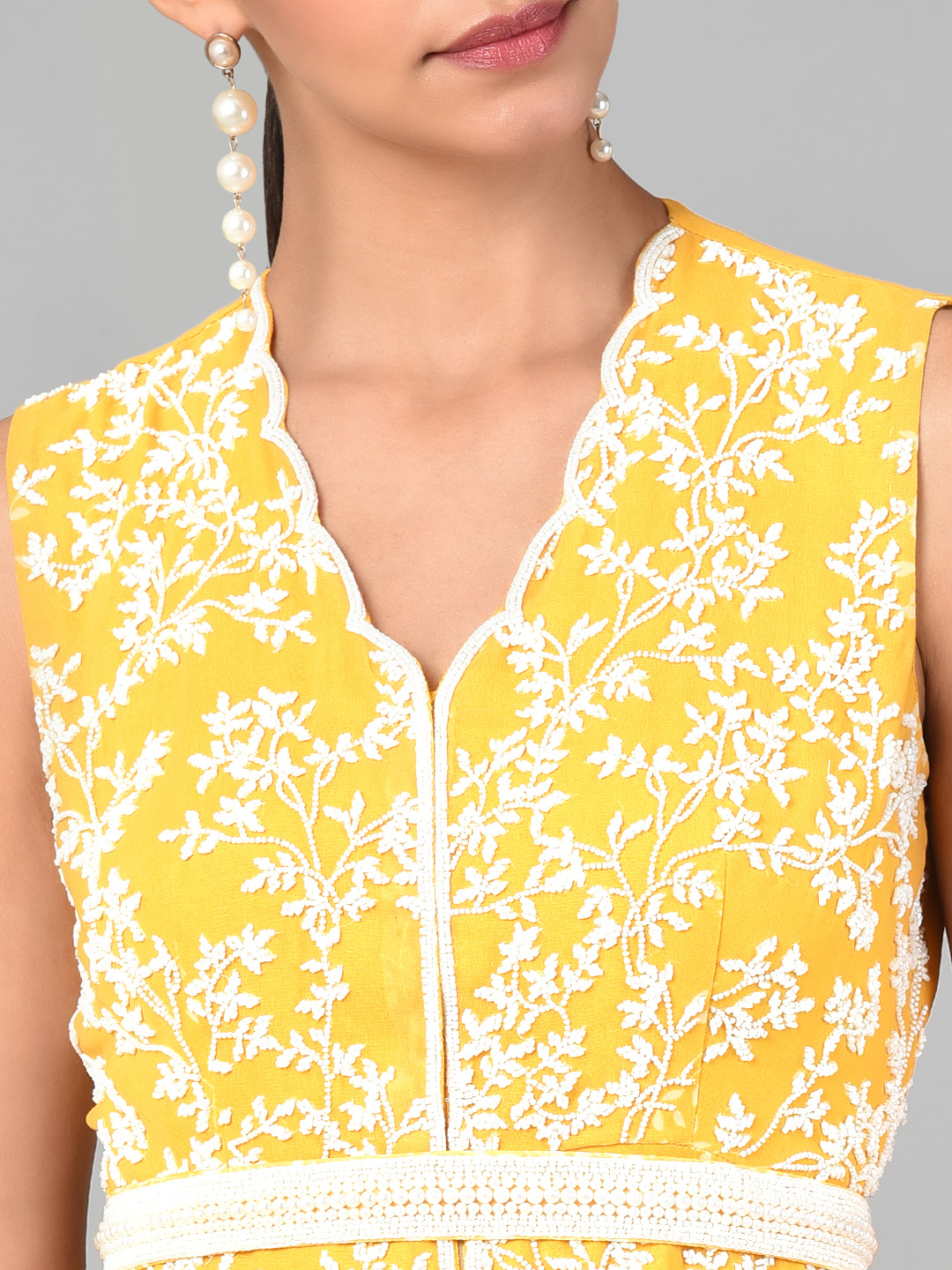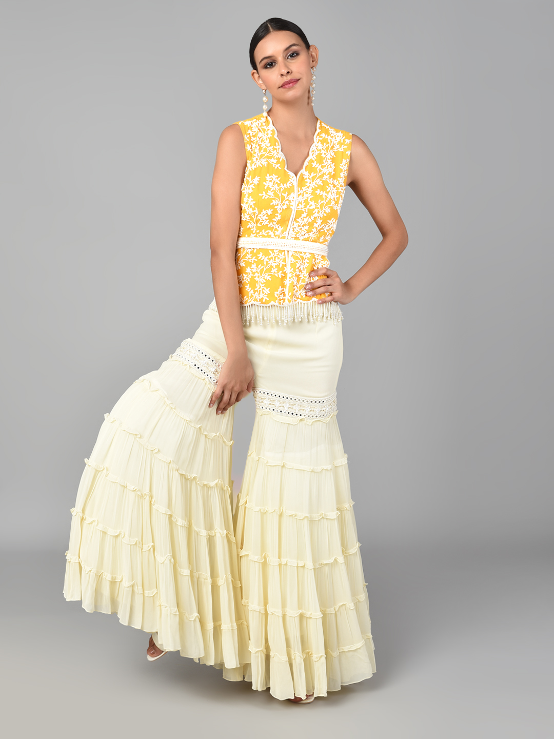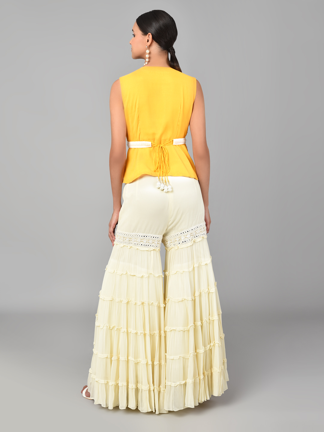 IVORY BEAD EMBROIDERED MUSTARD GEORGETTE TOP WITH AN EMBROIDERED BAND IVORY GEORGETTE TIER PALAZZO