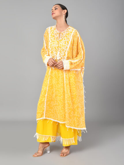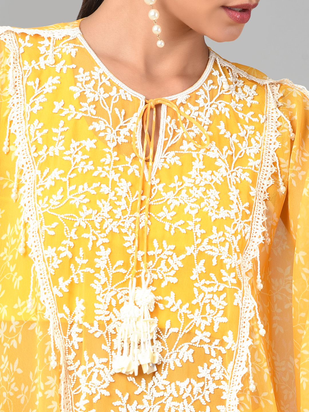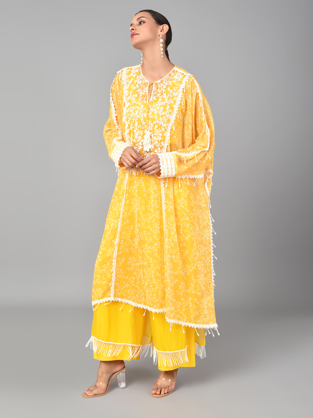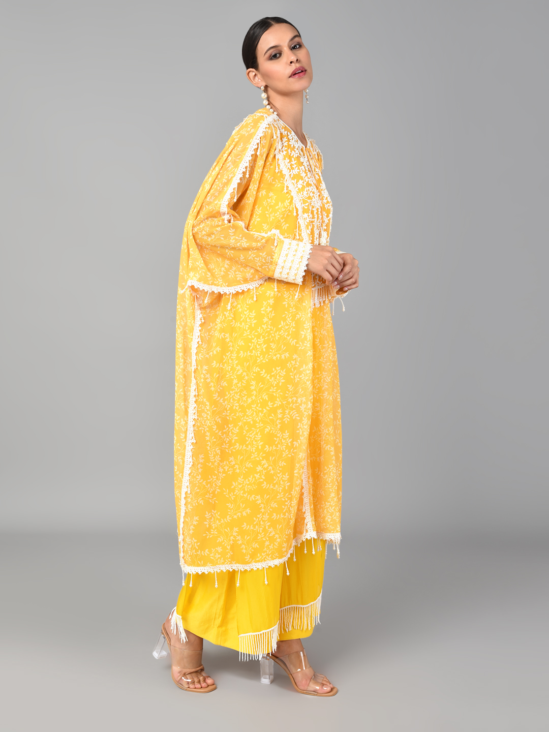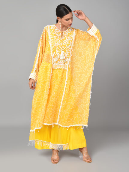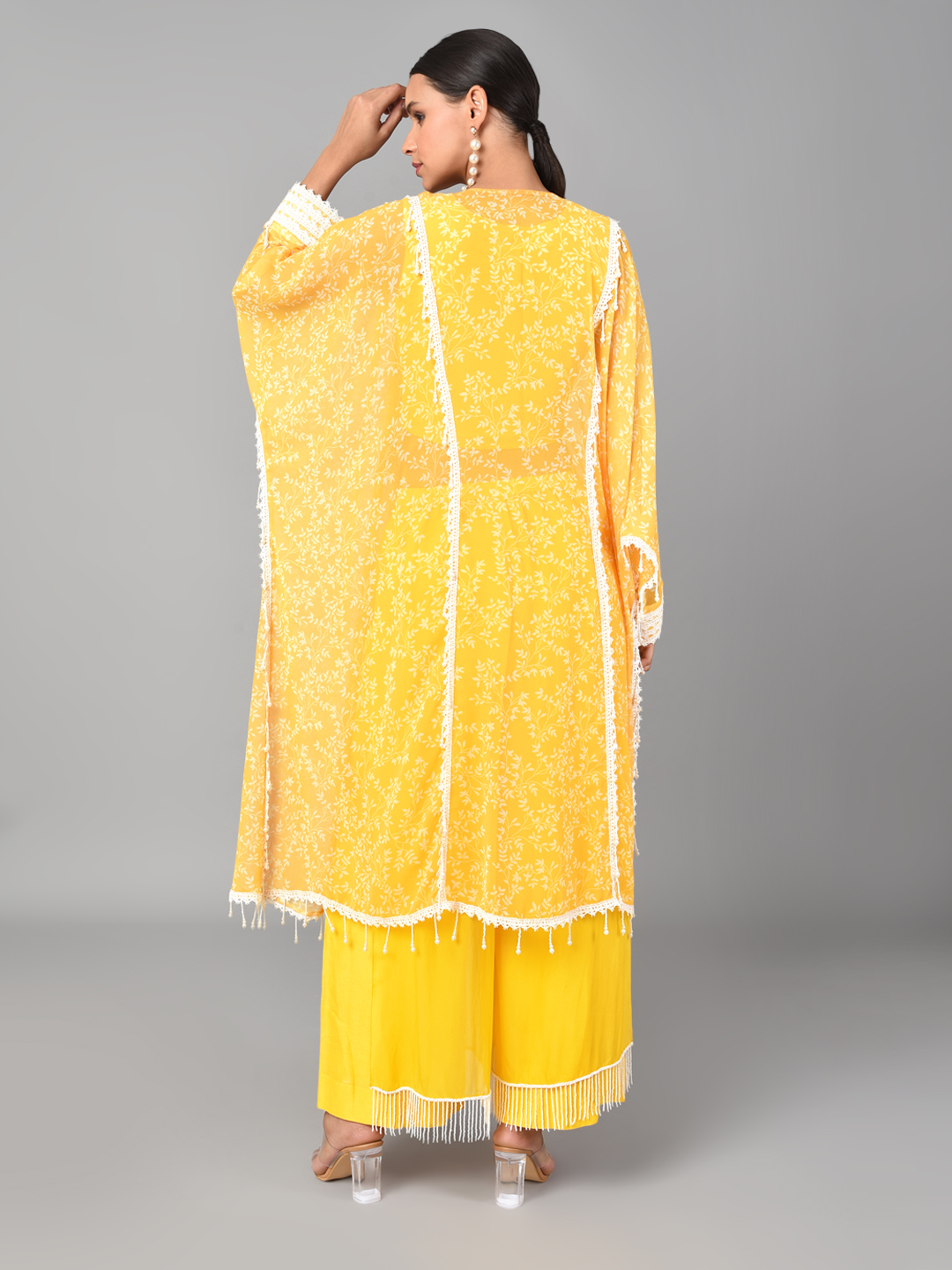 IVORY BEAD/LACE EMBROIDERED MUSTARD PRINTED GEORGETTE KAFTAN WITH A COTTON SILK PALAZZO WITH AN ORGANZA TASSEL HEMLINE OVERLAY