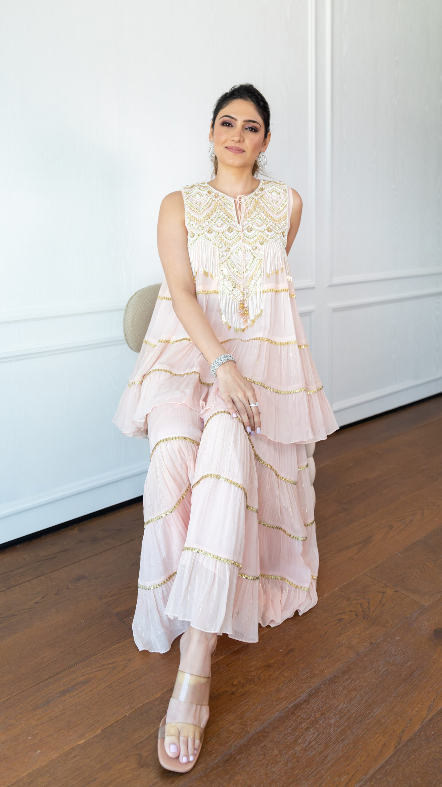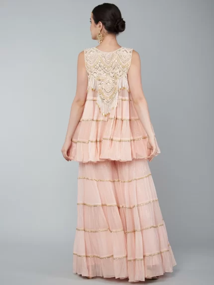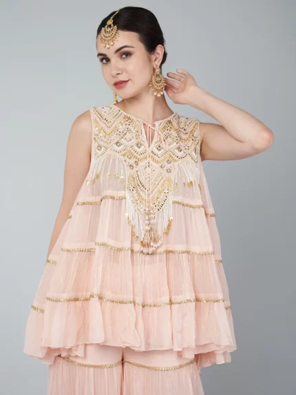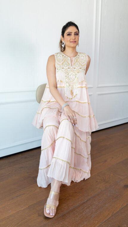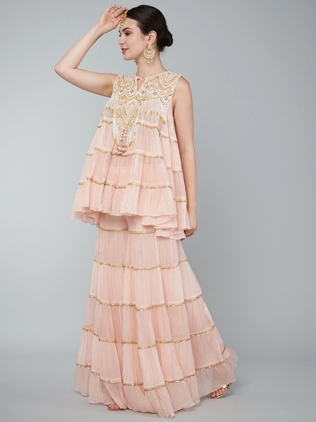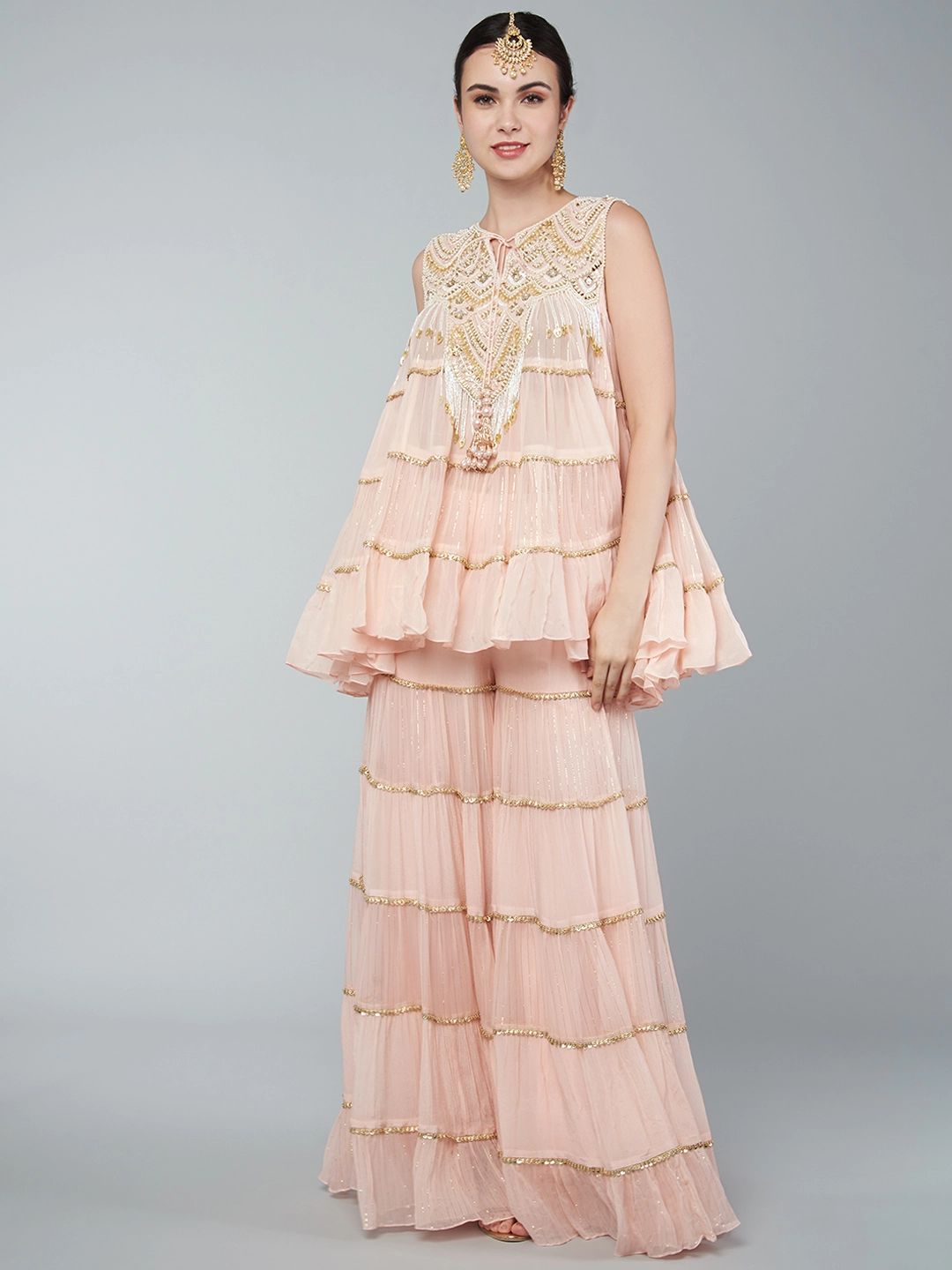 GOLD/ PEARL HEAVY EMBROIDERED YOKE BLUSH PINK TIER TUNIC WITH GOLD ZARI GEORGETTE & CHIFFON CREPE TIER PALAZZO