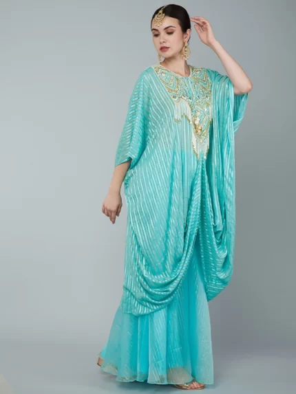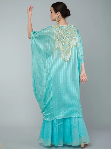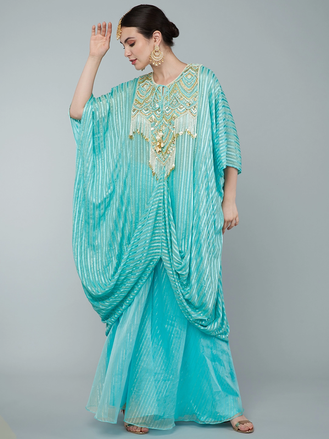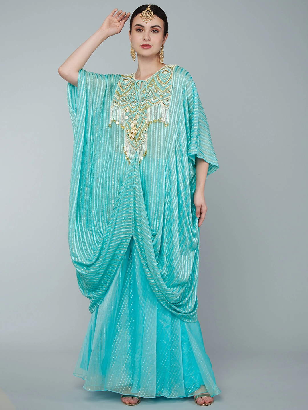 GOLD / IVORY BEAD EMBELLISHED TURQUOISE TUNIC WITH GHARARA & DUPATTA SET