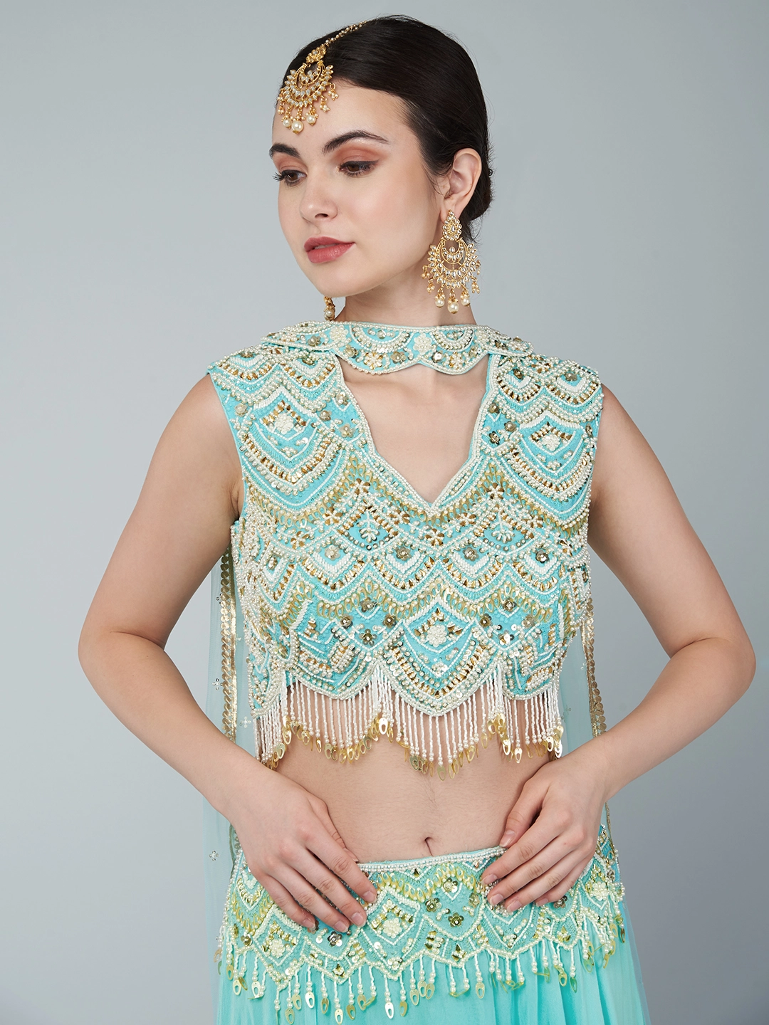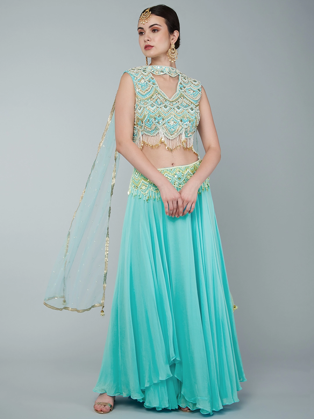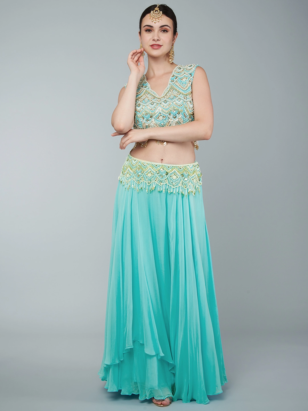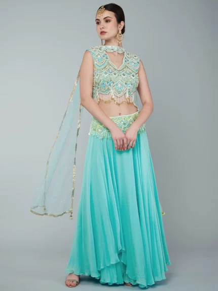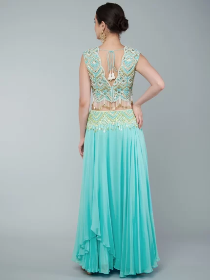 EMBROIDERED CROPTOP PAIRED WITH A CREPE SKIRT & AN EMBROIDERED ORGANZA DRAPE
