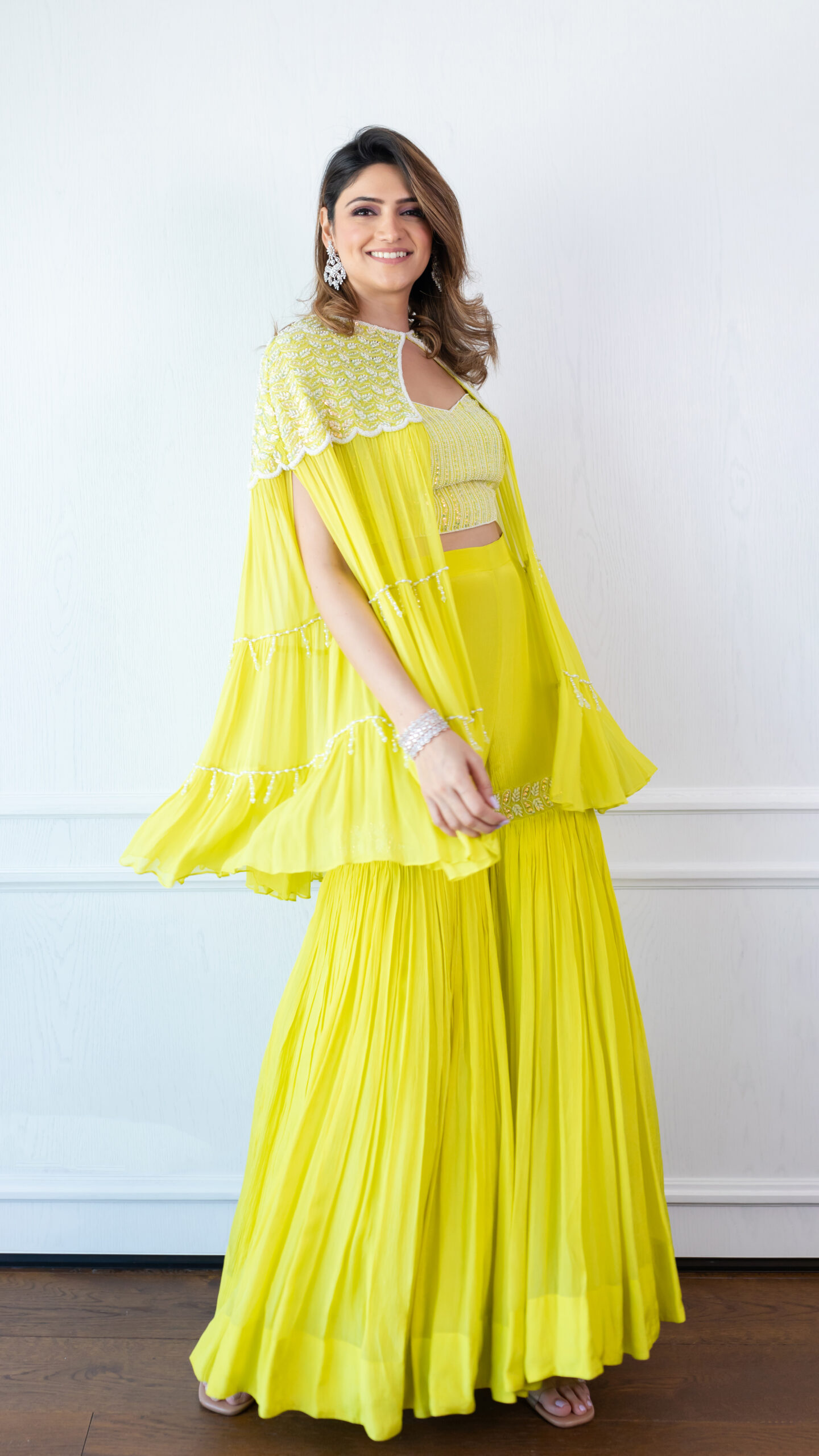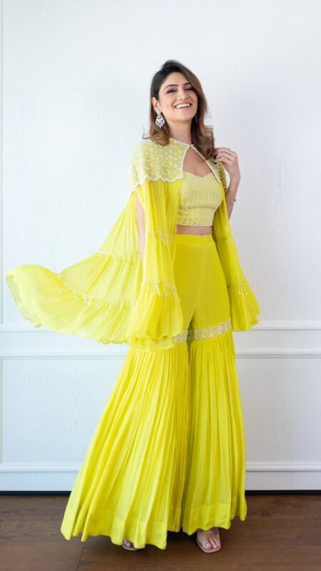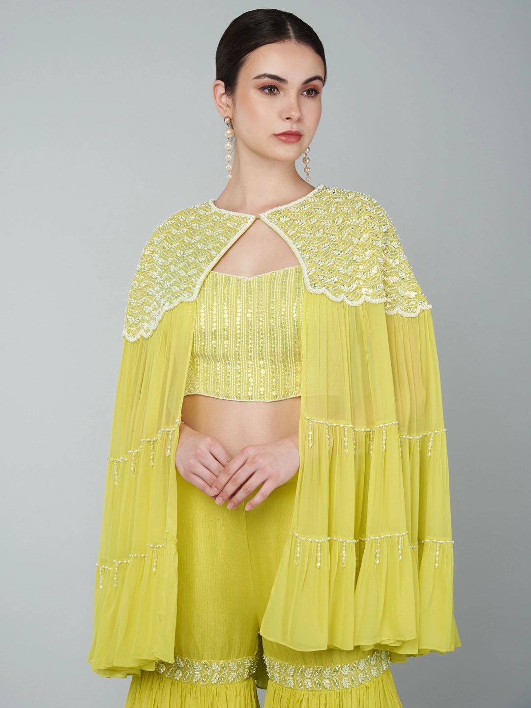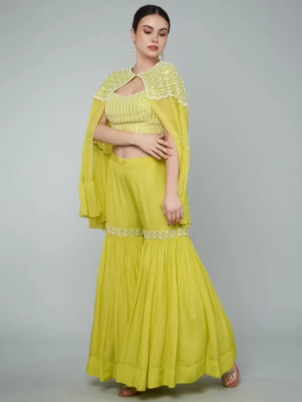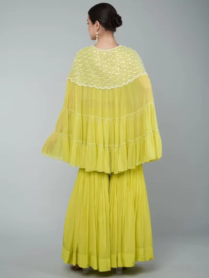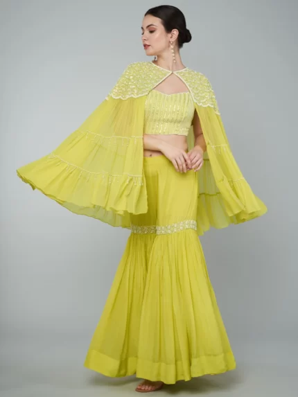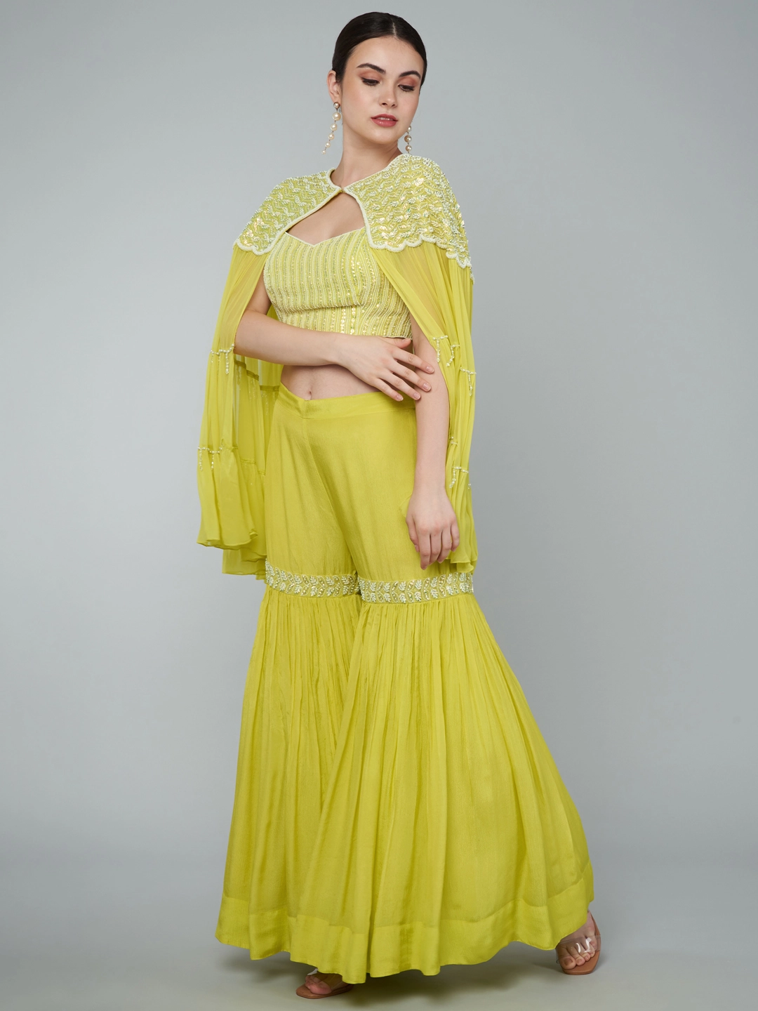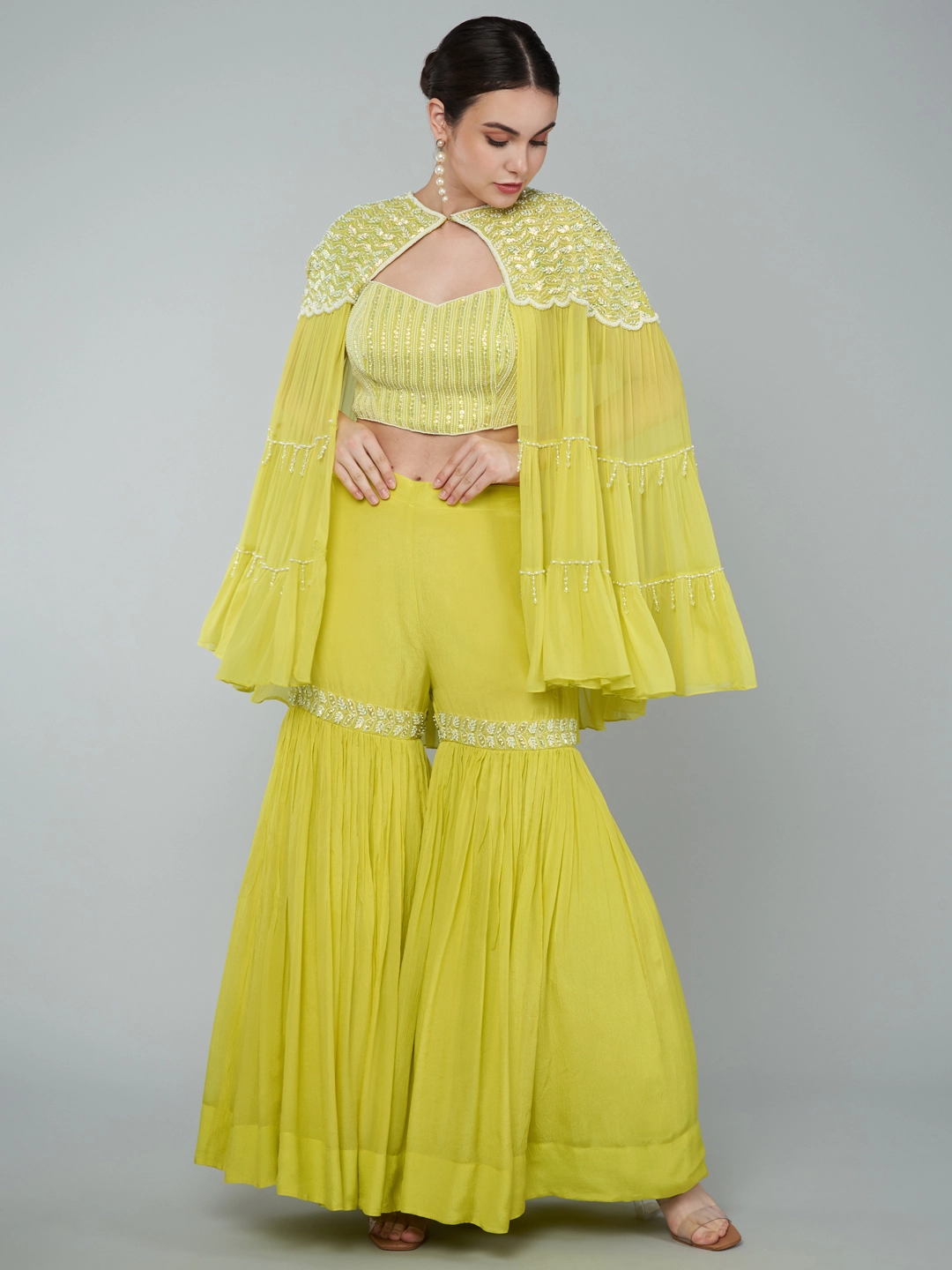 SEQUINS EMBELLISHED TIER CAPE / EMBROIDERED CROP TOP & PALAZZO SET