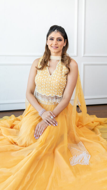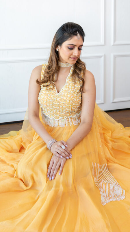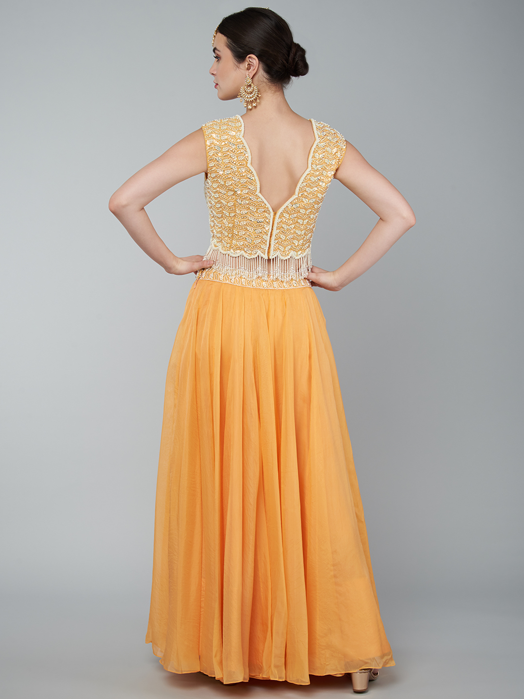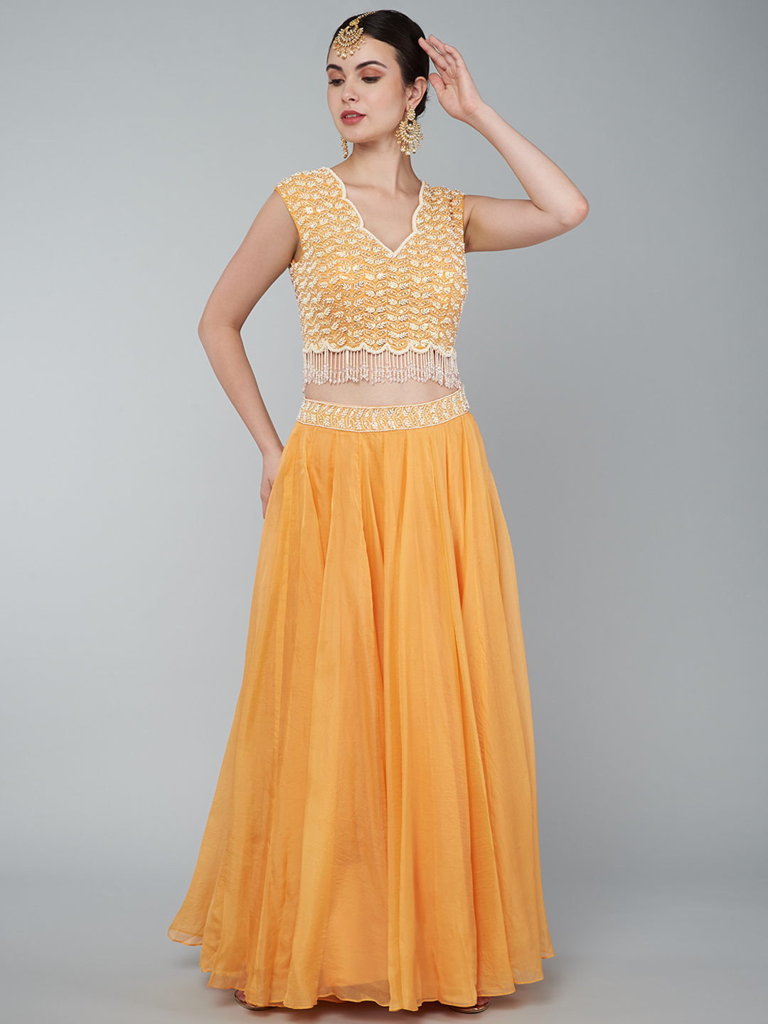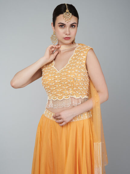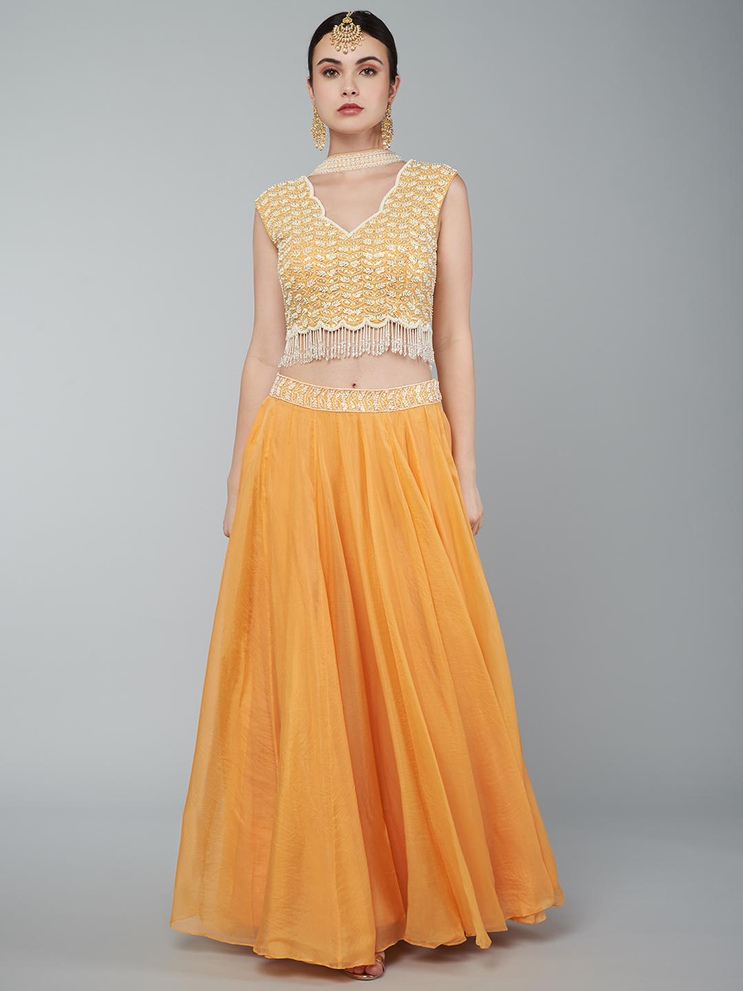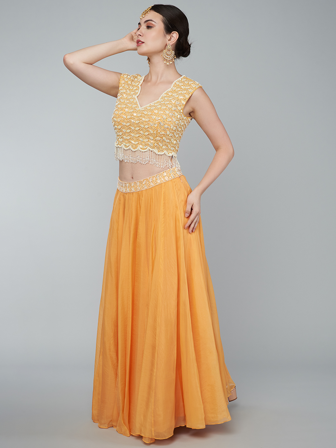 YELLOW BEAD/ SEQUINS EMBELLISHED CROP TOP PAIRED WITH SKIRT & DUPATTA