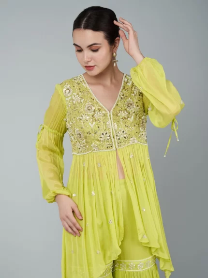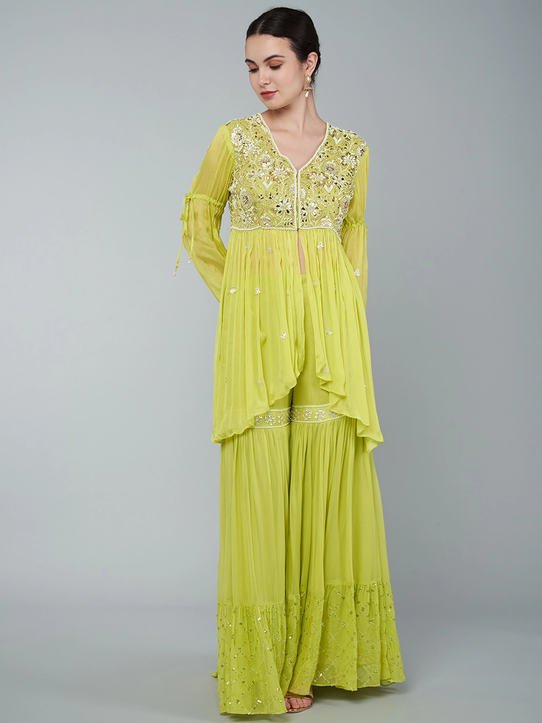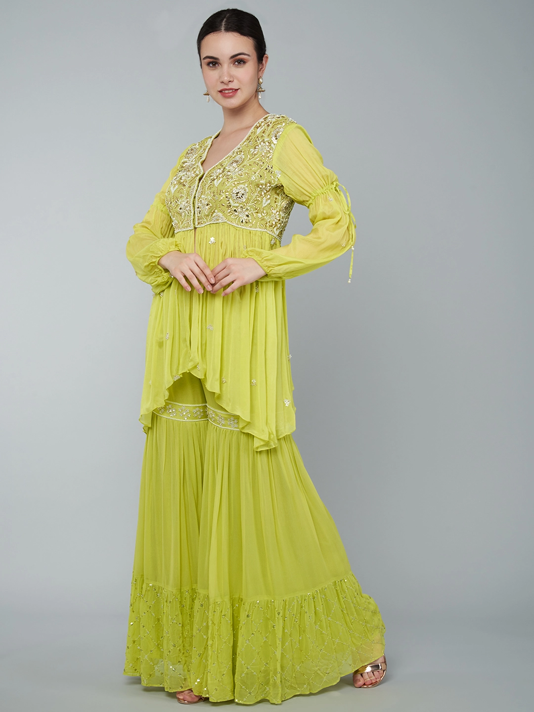 GOLD / IVORY BEAD EMBELLISHED YELLOW GEORGETTE TUNIC WITH EMBROIDERED BAND GHARARA