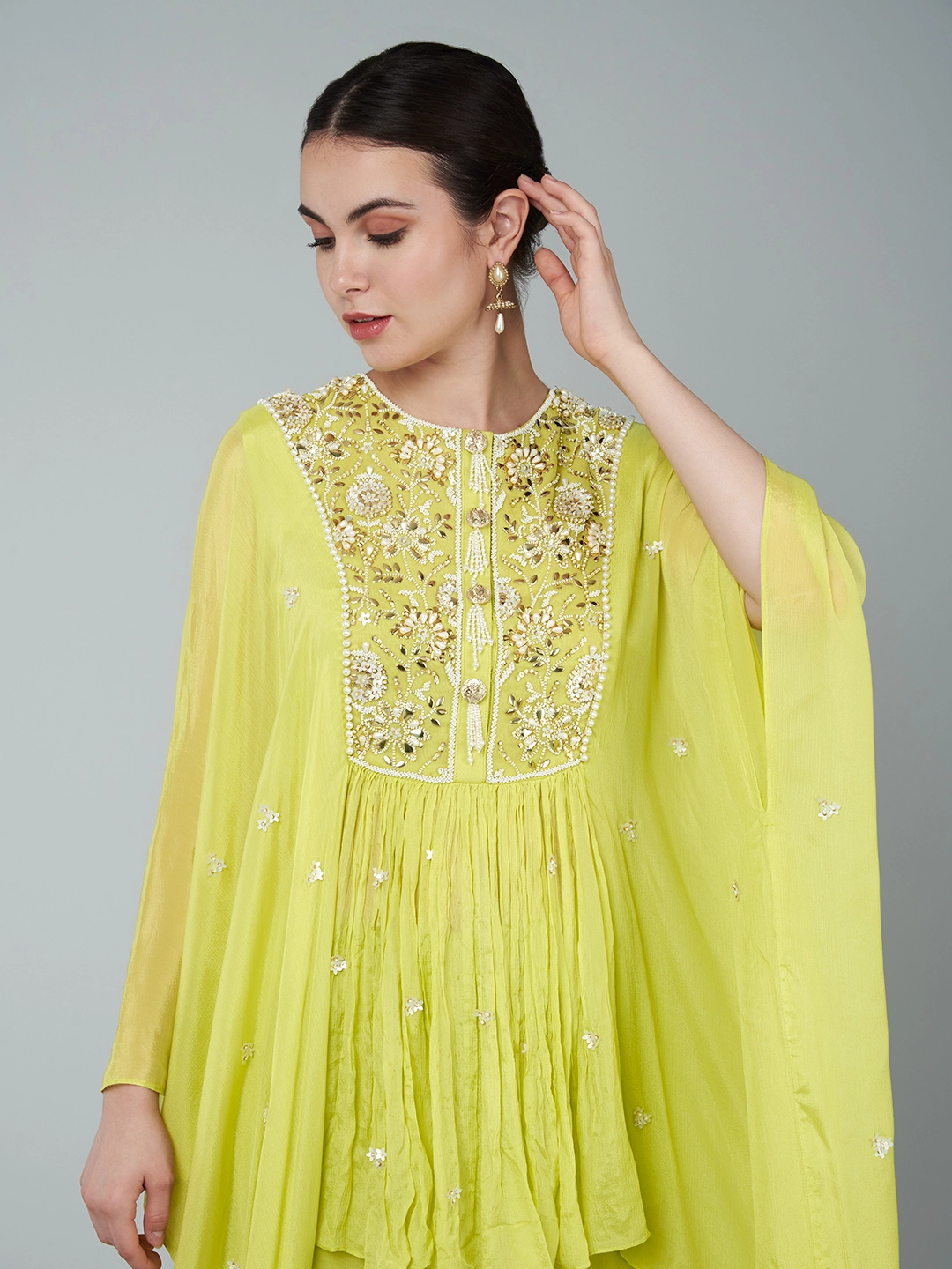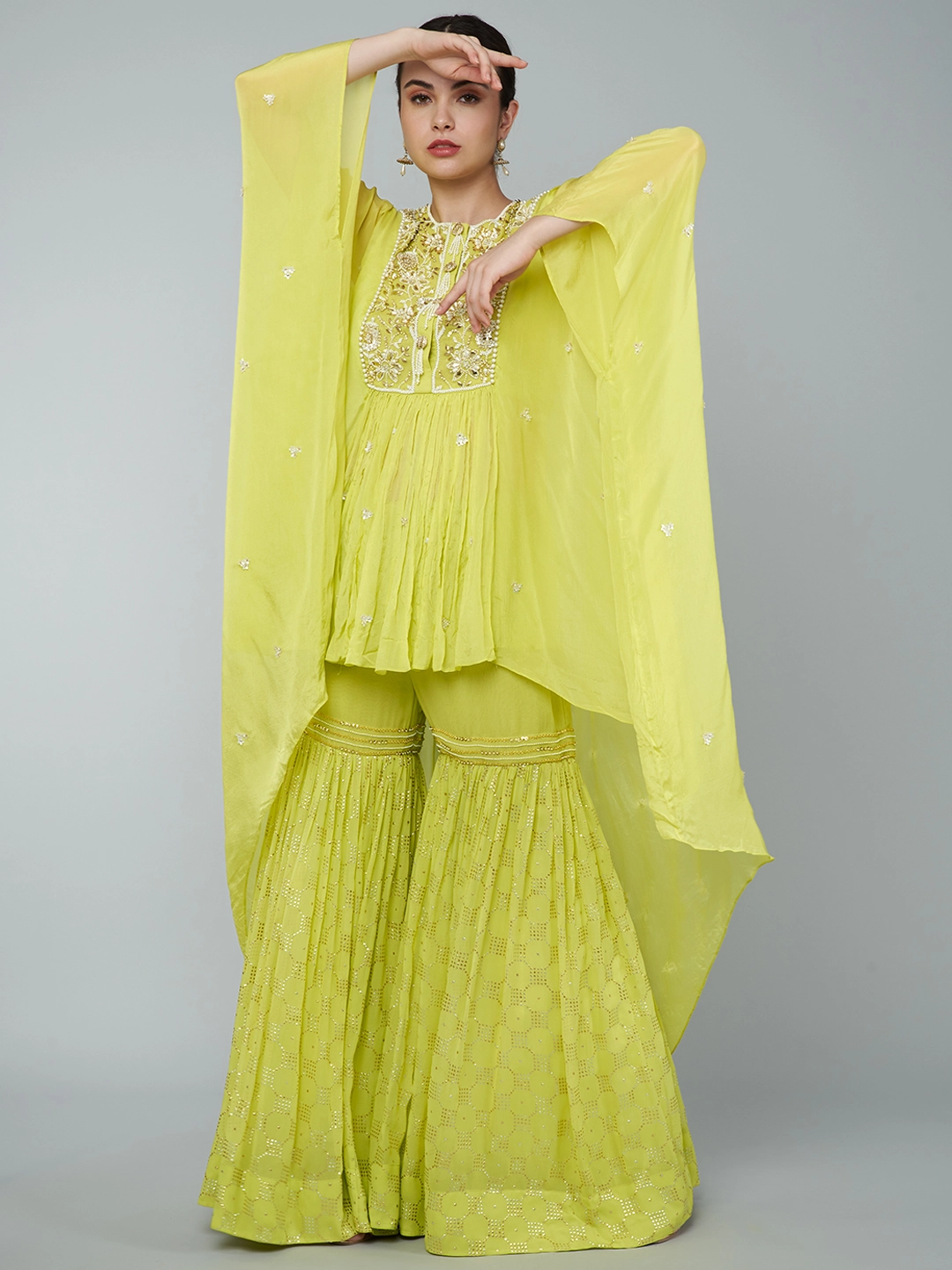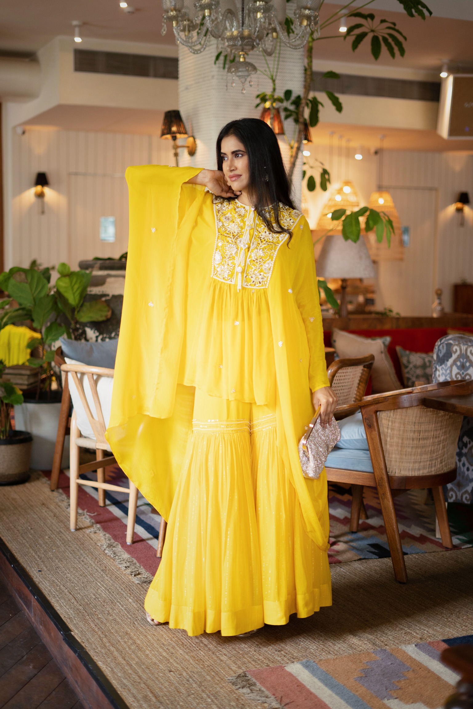 GOLD / IVORY BEAD EMBELLISHED YELLOW CHIFFON CREPE TUNIC WITH EMBROIDERED BAND GHARARA