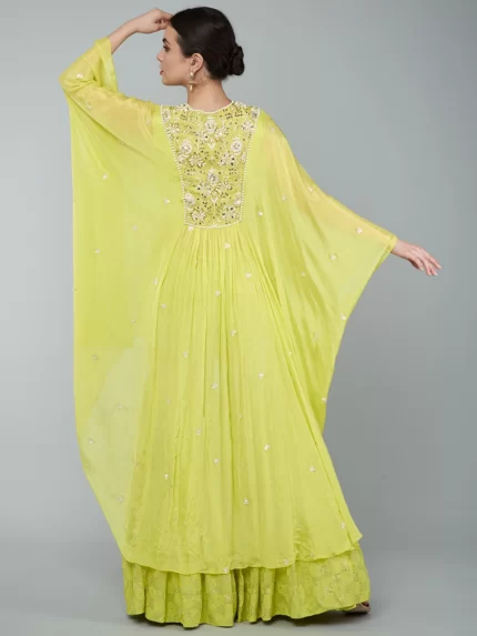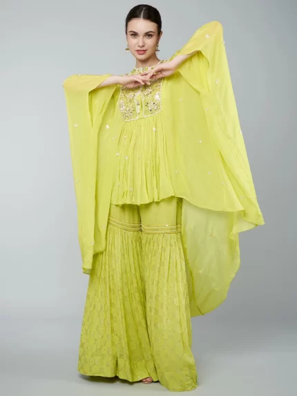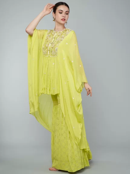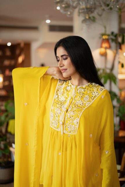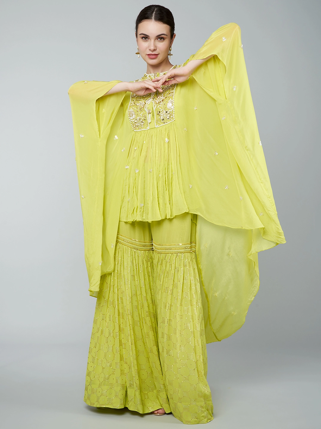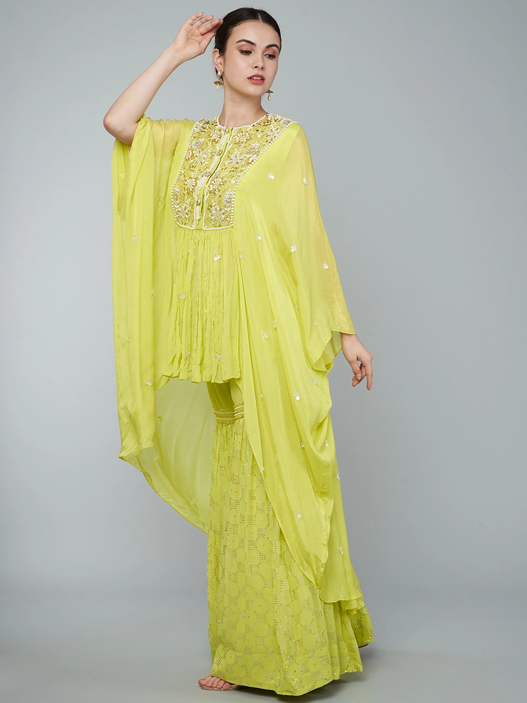 GOLD / IVORY BEAD EMBELLISHED YELLOW CHIFFON CREPE TUNIC WITH EMBROIDERED BAND GHARARA