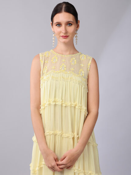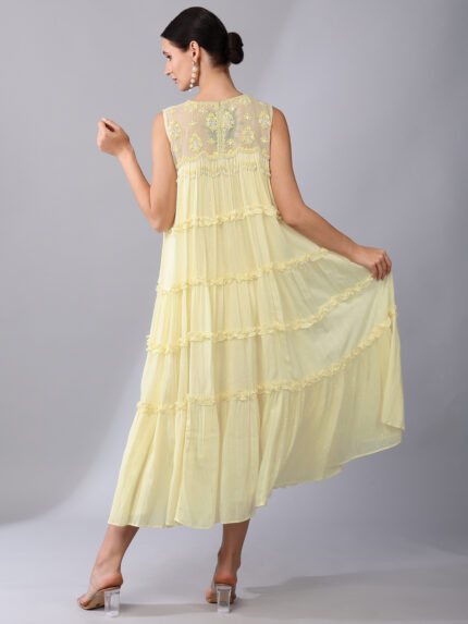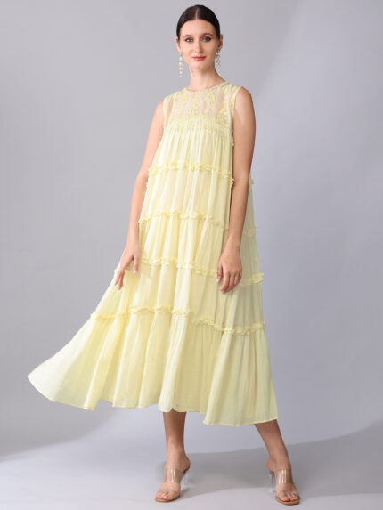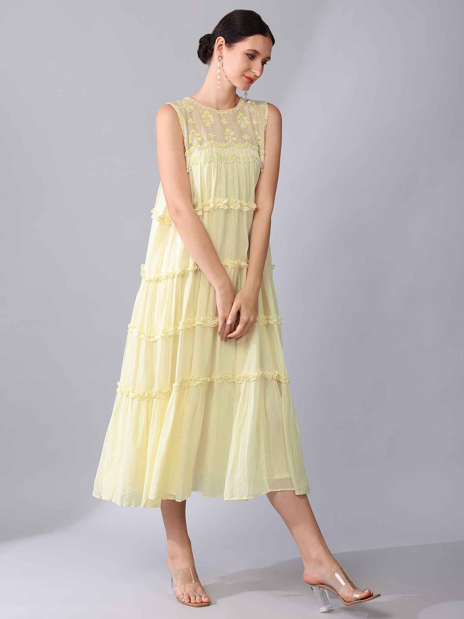 IVORY/LEMON BEAD EMBROIDERED MOTIF YOKE TIER COTTON CHIFFON DRESS
